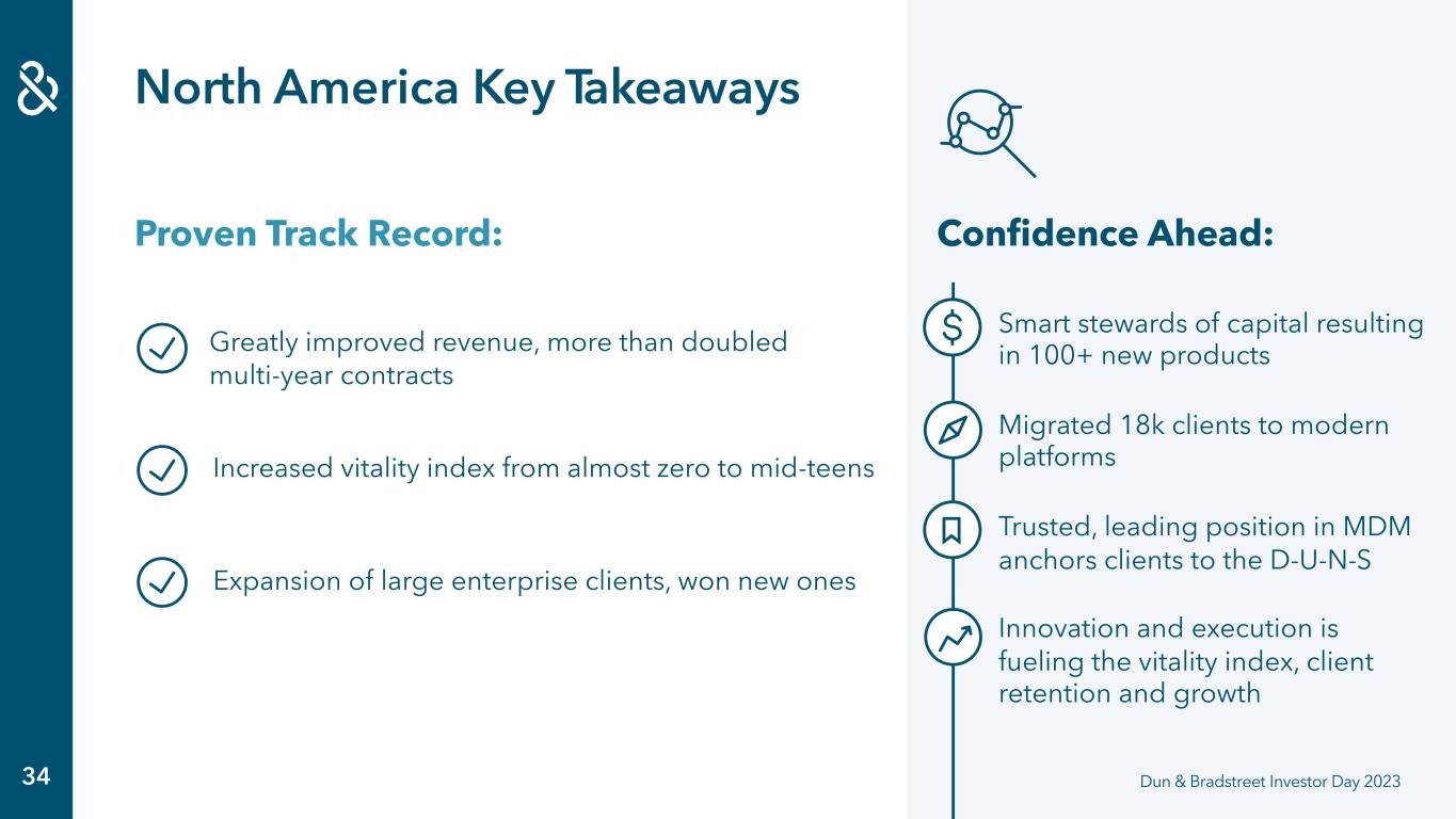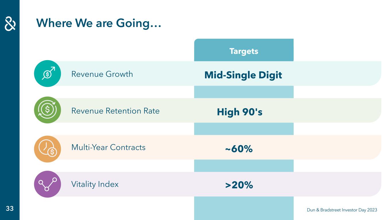 33 Targets Where We are Going… Revenue Growth Revenue Retention Rate Multi-Year Contracts Vitality Index Mid-Single Digit High 90's ~60% >20% Dun & Bradstreet Investor Day 2023