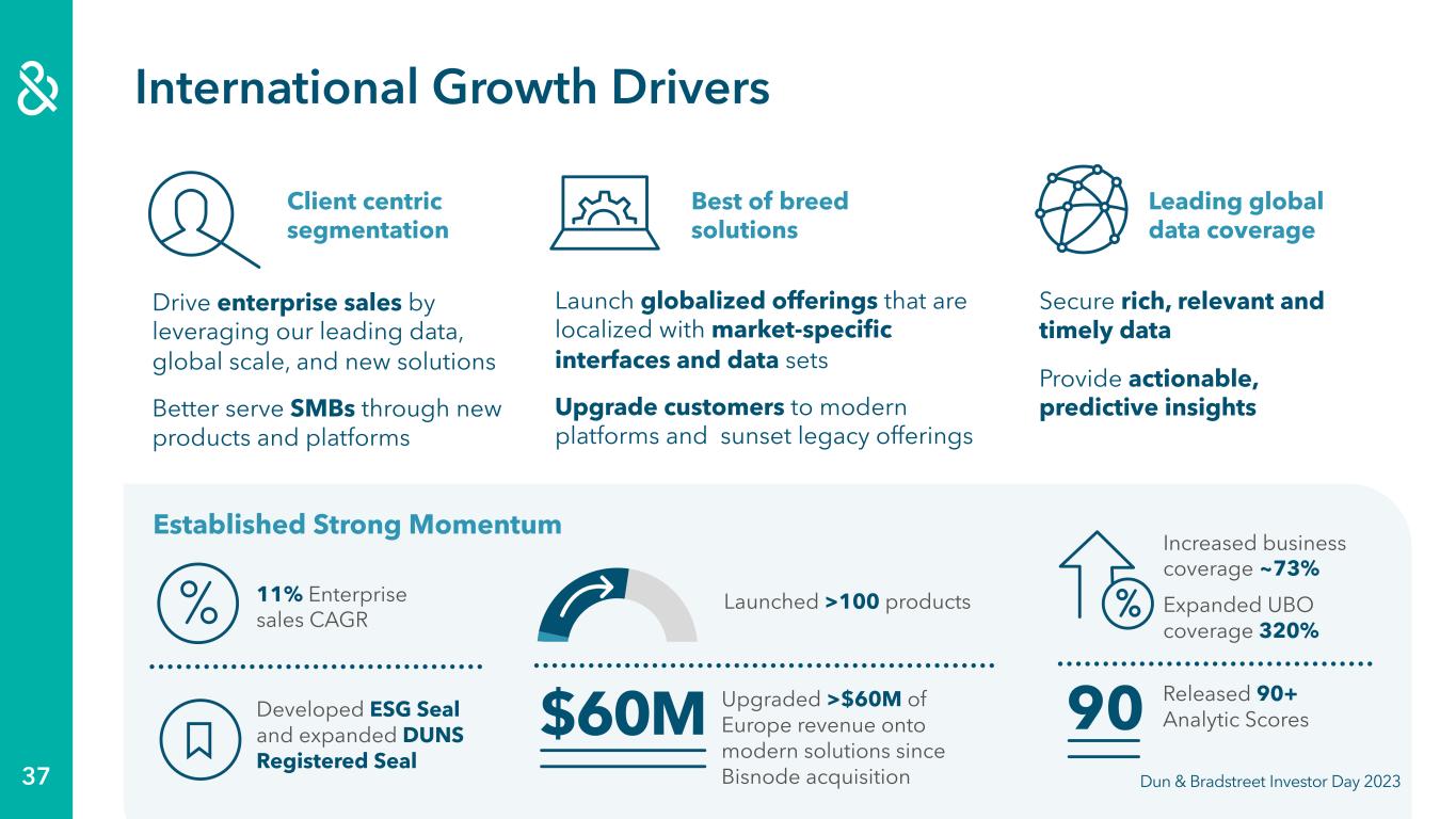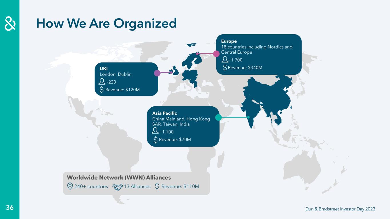 36 How We Are Organized Dun & Bradstreet Investor Day 2023 UKI London, Dublin ~220 Revenue: $120M Europe 18 countries including Nordics and Central Europe ~1,700 Revenue: $340M Asia Pacific China Mainland, Hong Kong SAR, Taiwan, India ~1,100 Revenue: $70M Worldwide Network (WWN) Alliances 240+ countries 13 Alliances Revenue: $110M