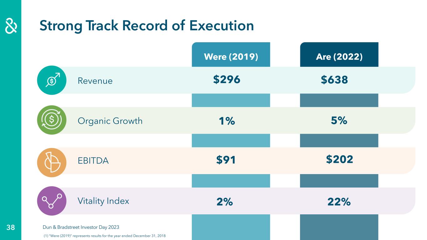 37 Established Strong Momentum International Growth Drivers Drive enterprise sales by leveraging our leading data, global scale, and new solutions Better serve SMBs through new products and platforms Launch globalized offerings that are localized with market-specific interfaces and data sets Upgrade customers to modern platforms and sunset legacy offerings Secure rich, relevant and timely data Provide actionable, predictive insights Increased business coverage ~73% Expanded UBO coverage 320% Released 90+ Analytic Scores90 Launched >100 products Upgraded >$60M of Europe revenue onto modern solutions since Bisnode acquisition $60MDeveloped ESG Seal and expanded DUNS Registered Seal 11% Enterprise sales CAGR Best of breed solutions Leading global data coverage Client centric segmentation Dun & Bradstreet Investor Day 2023