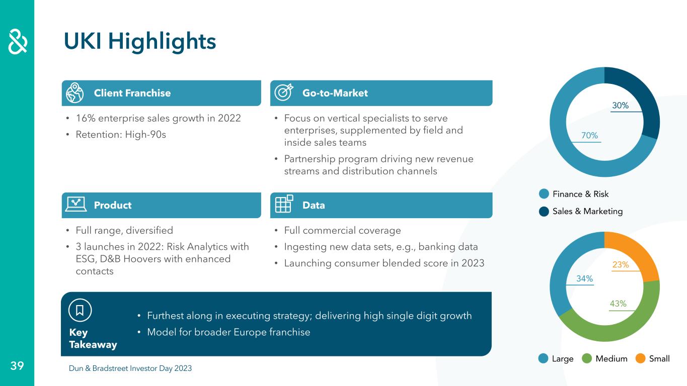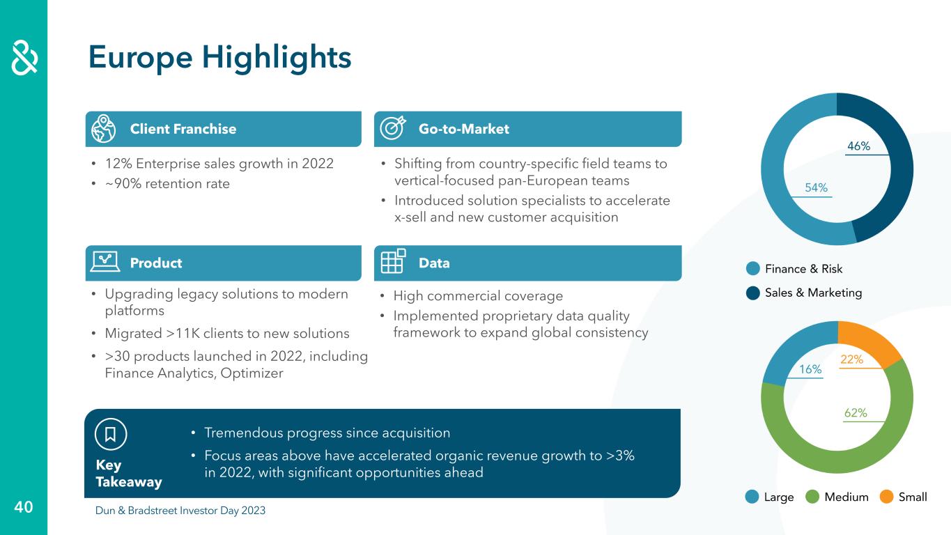 39 UKI Highlights Client Franchise • 16% enterprise sales growth in 2022 • Retention: High-90s Go-to-Market • Focus on vertical specialists to serve enterprises, supplemented by field and inside sales teams • Partnership program driving new revenue streams and distribution channels Product • Full range, diversified • 3 launches in 2022: Risk Analytics with ESG, D&B Hoovers with enhanced contacts Data • Full commercial coverage • Ingesting new data sets, e.g., banking data • Launching consumer blended score in 2023 Key Takeaway • Furthest along in executing strategy; delivering high single digit growth • Model for broader Europe franchise Dun & Bradstreet Investor Day 2023