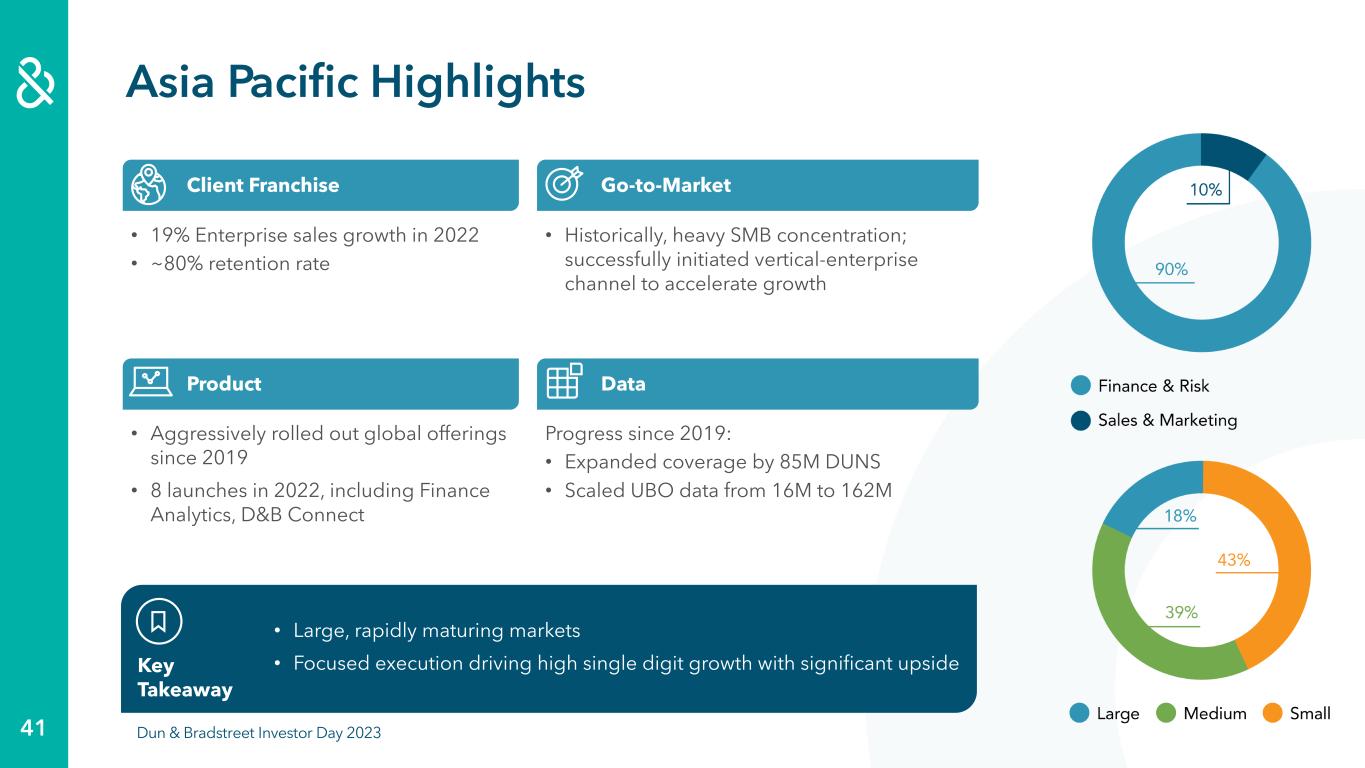 40 Client Franchise Go-to-Market Product Data Key Takeaway Europe Highlights • 12% Enterprise sales growth in 2022 • ~90% retention rate • Shifting from country-specific field teams to vertical-focused pan-European teams • Introduced solution specialists to accelerate x-sell and new customer acquisition • Upgrading legacy solutions to modern platforms • Migrated >11K clients to new solutions • >30 products launched in 2022, including Finance Analytics, Optimizer • High commercial coverage • Implemented proprietary data quality framework to expand global consistency • Tremendous progress since acquisition • Focus areas above have accelerated organic revenue growth to >3% in 2022, with significant opportunities ahead Dun & Bradstreet Investor Day 2023