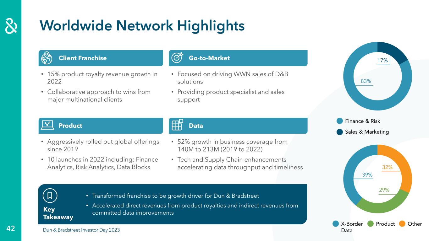 41 Client Franchise Go-to-Market Key Takeaway Asia Pacific Highlights • 19% Enterprise sales growth in 2022 • ~80% retention rate • Historically, heavy SMB concentration; successfully initiated vertical-enterprise channel to accelerate growth • Aggressively rolled out global offerings since 2019 • 8 launches in 2022, including Finance Analytics, D&B Connect Progress since 2019: • Expanded coverage by 85M DUNS • Scaled UBO data from 16M to 162M • Large, rapidly maturing markets • Focused execution driving high single digit growth with significant upside Product Data Dun & Bradstreet Investor Day 2023