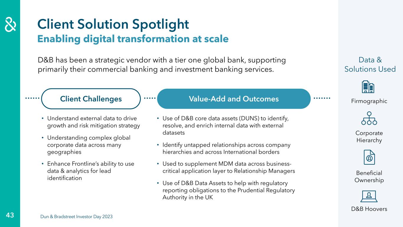 42 Client Franchise Go-to-Market Key Takeaway Product Data Worldwide Network Highlights • 15% product royalty revenue growth in 2022 • Collaborative approach to wins from major multinational clients • Focused on driving WWN sales of D&B solutions • Providing product specialist and sales support • Aggressively rolled out global offerings since 2019 • 10 launches in 2022 including: Finance Analytics, Risk Analytics, Data Blocks • 52% growth in business coverage from 140M to 213M (2019 to 2022) • Tech and Supply Chain enhancements accelerating data throughput and timeliness • Transformed franchise to be growth driver for Dun & Bradstreet • Accelerated direct revenues from product royalties and indirect revenues from committed data improvements Dun & Bradstreet Investor Day 2023