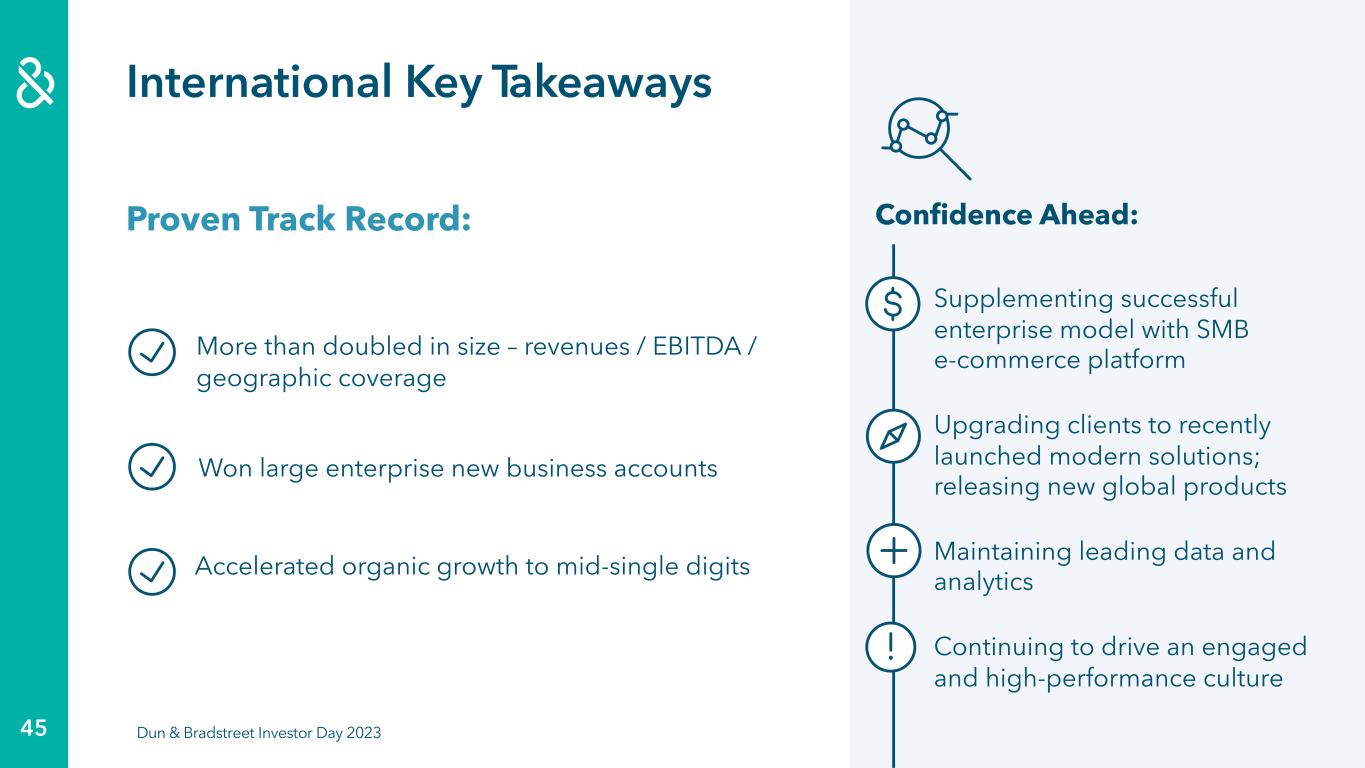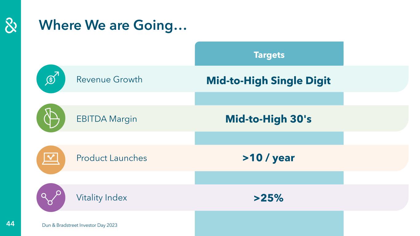 44 Targets Revenue Growth EBITDA Margin Product Launches Vitality Index Where We are Going… Mid-to-High Single Digit Mid-to-High 30's >10 / year >25% Dun & Bradstreet Investor Day 2023