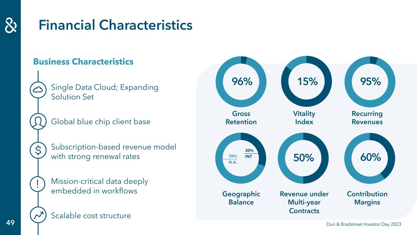 49 Geographic Balance Financial Characteristics Business Characteristics Single Data Cloud; Expanding Solution Set Global blue chip client base Subscription-based revenue model with strong renewal rates Mission-critical data deeply embedded in workflows Scalable cost structure Gross Retention Vitality Index Recurring Revenues Revenue under Multi-year Contracts Contribution Margins 50% 95%96% 15% Dun & Bradstreet Investor Day 2023 60%