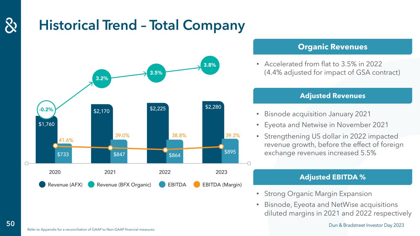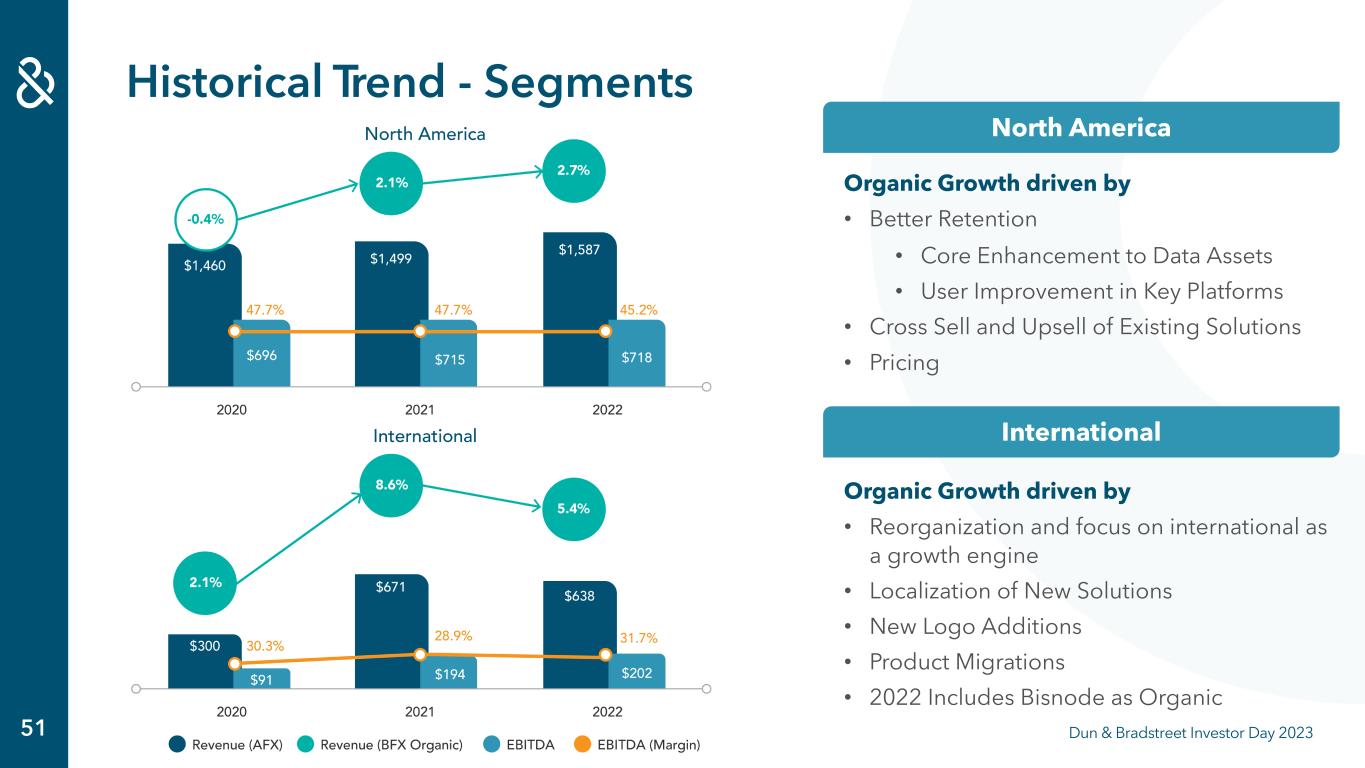 50 Historical Trend – Total Company • Accelerated from flat to 3.5% in 2022 (4.4% adjusted for impact of GSA contract) Adjusted Revenues • Bisnode acquisition January 2021 • Eyeota and Netwise in November 2021 • Strengthening US dollar in 2022 impacted revenue growth, before the effect of foreign exchange revenues increased 5.5% Adjusted EBITDA % • Strong Organic Margin Expansion • Bisnode, Eyeota and NetWise acquisitions diluted margins in 2021 and 2022 respectively Organic Revenues Dun & Bradstreet Investor Day 2023 Refer to Appendix for a reconciliation of GAAP to Non-GAAP financial measures