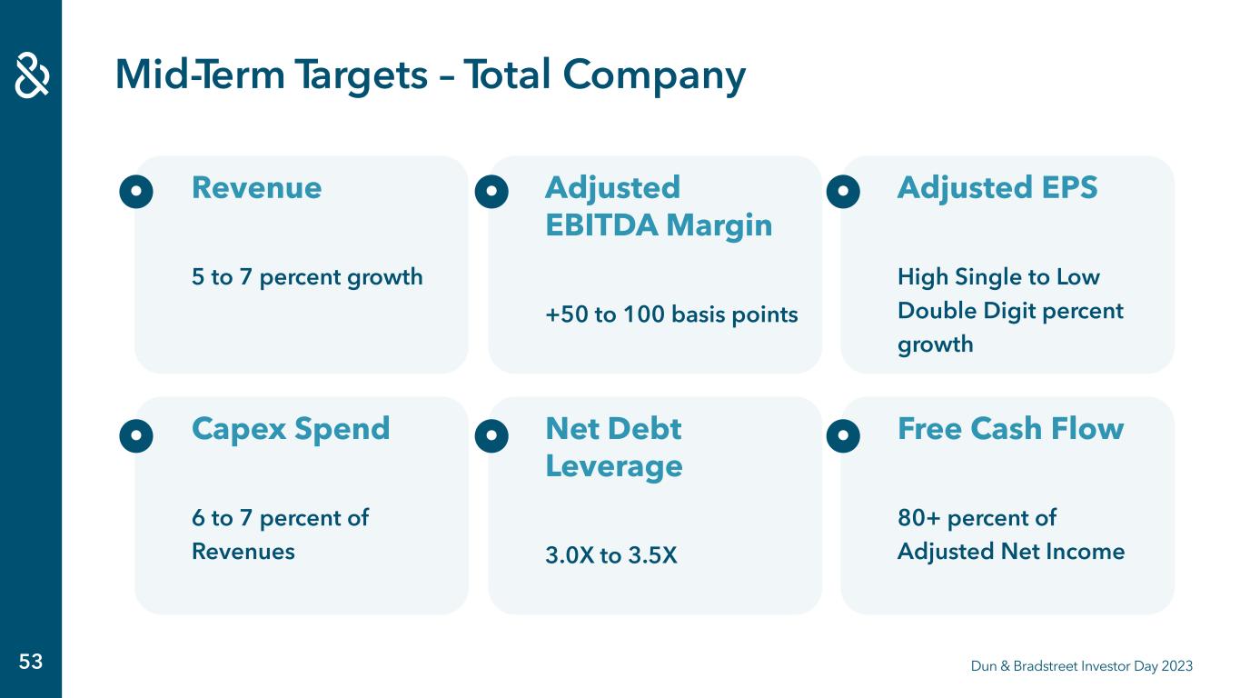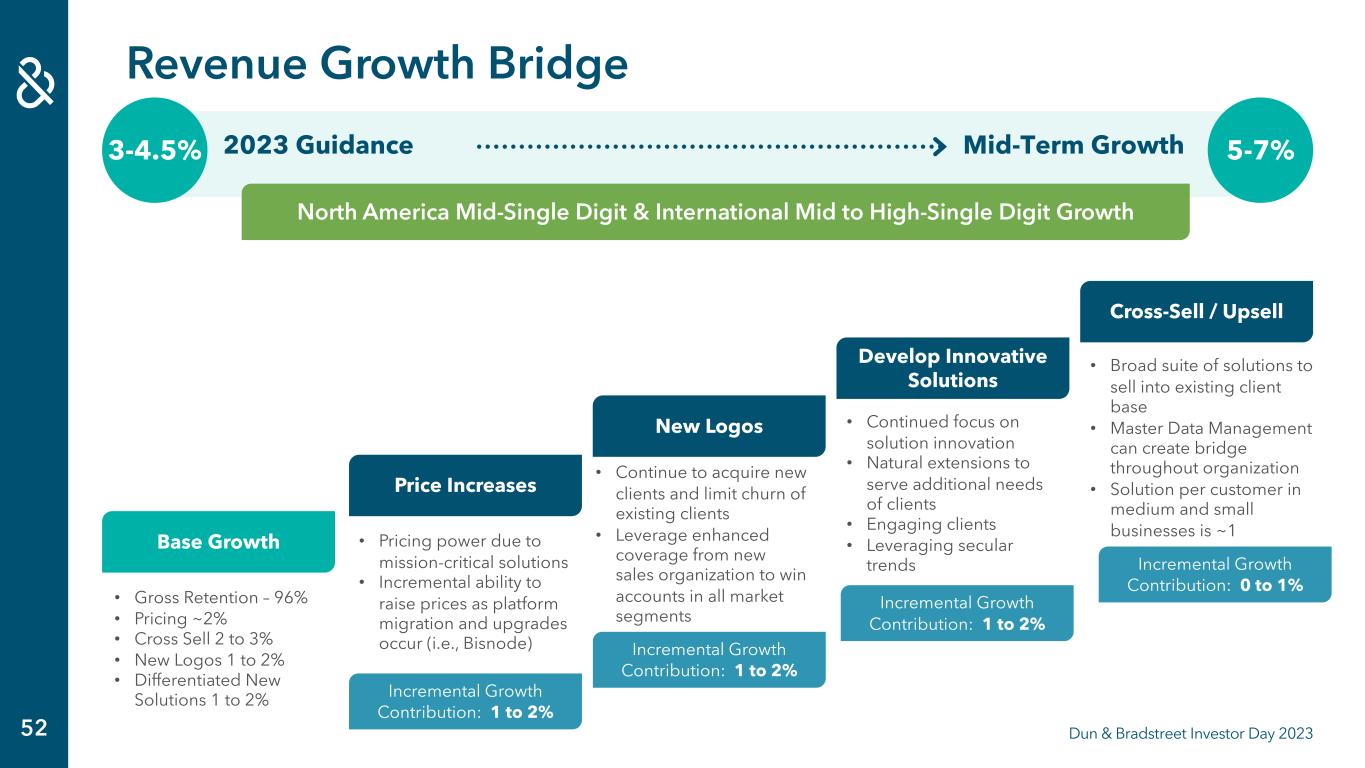 52 Revenue Growth Bridge 3-4.5% 2023 Guidance Mid-Term Growth 5-7% Base Growth • Gross Retention – 96% • Pricing ~2% • Cross Sell 2 to 3% • New Logos 1 to 2% • Differentiated New Solutions 1 to 2% Price Increases • Pricing power due to mission-critical solutions • Incremental ability to raise prices as platform migration and upgrades occur (i.e., Bisnode) New Logos • Broad suite of solutions to sell into existing client base • Master Data Management can create bridge throughout organization • Solution per customer in medium and small businesses is ~1 Develop Innovative Solutions • Continued focus on solution innovation • Natural extensions to serve additional needs of clients • Engaging clients • Leveraging secular trends Cross-Sell / Upsell • Continue to acquire new clients and limit churn of existing clients • Leverage enhanced coverage from new sales organization to win accounts in all market segments Incremental Growth Contribution: 1 to 2% Incremental Growth Contribution: 1 to 2% Incremental Growth Contribution: 1 to 2% Incremental Growth Contribution: 0 to 1% Dun & Bradstreet Investor Day 2023 North America Mid-Single Digit & International Mid to High-Single Digit Growth