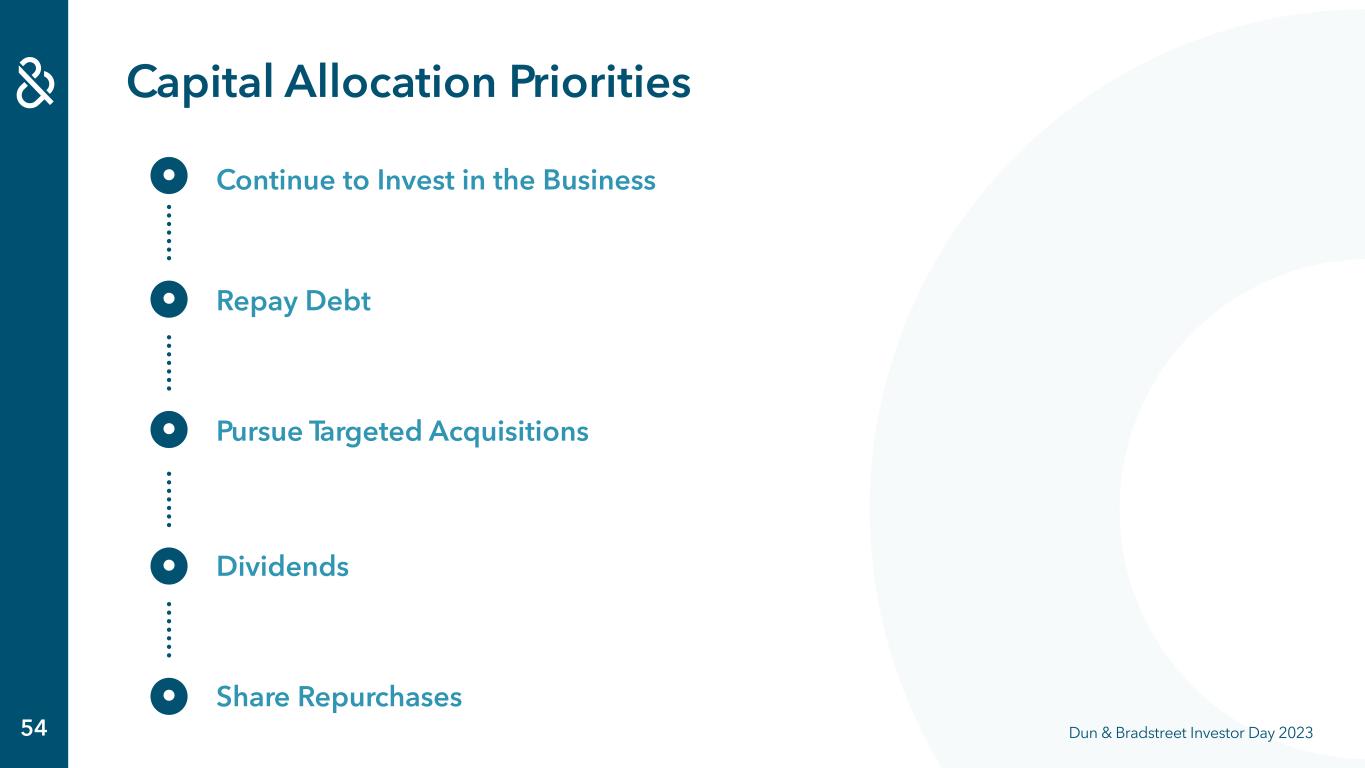 53 Mid-Term Targets – Total Company Adjusted EPS High Single to Low Double Digit percent growth Net Debt Leverage 3.0X to 3.5X Capex Spend 6 to 7 percent of Revenues Free Cash Flow 80+ percent of Adjusted Net Income Revenue 5 to 7 percent growth Adjusted EBITDA Margin +50 to 100 basis points ●● ● ●● ● Dun & Bradstreet Investor Day 2023