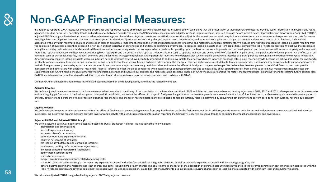 58 Non-GAAP Financial Measures: In addition to reporting GAAP results, we evaluate performance and report our results on the non-GAAP financial measures discussed below. We believe that the presentation of these non-GAAP measures provides useful information to investors and rating agencies regarding our results, operating trends and performance between periods. These non-GAAP financial measures include adjusted revenue, organic revenue, adjusted earnings before interest, taxes, depreciation and amortization ("adjusted EBITDA"), adjusted EBITDA margin, adjusted net income and adjusted net earnings per diluted share. Adjusted results are non-GAAP measures that adjust for the impact due to certain acquisition and divestiture related revenue and expenses, such as costs for banker fees, legal fees, due diligence, retention payments and contingent consideration adjustments, restructuring charges, equity-based compensation, and other non-core gains and charges that are not in the normal course of our business, such as costs associated with early debt redemptions, gains and losses on sales of businesses, impairment charges, the effect of significant changes in tax laws and material tax and legal settlements. We exclude amortization of recognized intangible assets resulting from the application of purchase accounting because it is non-cash and not indicative of our ongoing and underlying operating performance. Recognized intangible assets arise from acquisitions, primarily the Take-Private Transaction. We believe that recognized intangible assets by their nature are fundamentally different from other depreciating assets that are replaced on a predictable operating cycle. Unlike other depreciating assets, such as developed and purchased software licenses or property and equipment, there is no replacement cost once these recognized intangible assets expire and the assets are not replaced. Additionally, our costs to operate, maintain and extend the life of acquired intangible assets and purchased intellectual property are reflected in our operating costs as personnel, data fee, facilities, overhead and similar items. Management believes it is important for investors to understand that such intangible assets were recorded as part of purchase accounting and contribute to revenue generation. Amortization of recognized intangible assets will recur in future periods until such assets have been fully amortized. In addition, we isolate the effects of changes in foreign exchange rates on our revenue growth because we believe it is useful for investors to be able to compare revenue from one period to another, both after and before the effects of foreign exchange rate changes. The change in revenue performance attributable to foreign currency rates is determined by converting both our prior and current periods’ foreign currency revenue by a constant rate. As a result, we monitor our adjusted revenue growth both after and before the effects of foreign exchange rate changes. We believe that these supplemental non-GAAP financial measures provide management and other users with additional meaningful financial information that should be considered when assessing our ongoing performance and comparability of our operating results from period to period. Our management regularly uses our supplemental non-GAAP financial measures internally to understand, manage and evaluate our business and make operating decisions. These non-GAAP measures are among the factors management uses in planning for and forecasting future periods. Non- GAAP financial measures should be viewed in addition to, and not as an alternative to our reported results prepared in accordance with GAAP. Our non-GAAP or adjusted financial measures reflect adjustments based on the following items, as well as the related income tax. Adjusted Revenue We define adjusted revenue as revenue to include a revenue adjustment due to the timing of the completion of the Bisnode acquisition in 2021 and deferred revenue purchase accounting adjustments 2019, 2020 and 2021. Management uses this measure to evaluate ongoing performance of the business period over period. In addition, we isolate the effects of changes in foreign exchange rates on our revenue growth because we believe it is useful for investors to be able to compare revenue from one period to another, both after and before the effects of foreign exchange rate changes. The change in revenue performance attributable to foreign currency rates is determined by converting both our prior and current periods’ foreign currency revenue by a constant rate. Organic Revenue We define organic revenue as adjusted revenue before the effect of foreign exchange excluding revenue from acquired businesses for the first twelve months. In addition, organic revenue excludes current and prior year revenue associated with divested businesses. We believe the organic measure provides investors and analysts with useful supplemental information regarding the Company’s underlying revenue trends by excluding the impact of acquisitions and divestitures. Adjusted EBITDA and Adjusted EBITDA Margin We define adjusted EBITDA as net income (loss) attributable to Dun & Bradstreet Holdings, Inc. excluding the following items: • depreciation and amortization; • interest expense and income; • income tax benefit or provision; • other non-operating expenses or income; • equity in net income of affiliates; • net income attributable to non-controlling interests; • purchase accounting deferred revenue adjustments; • dividends allocated to preferred stockholders; • equity-based compensation; • restructuring charges; • merger, acquisition and divestiture-related operating costs; • transition costs primarily consisting of non-recurring expenses associated with transformational and integration activities, as well as incentive expenses associated with our synergy programs; and • other adjustments primarily related to non-cash 