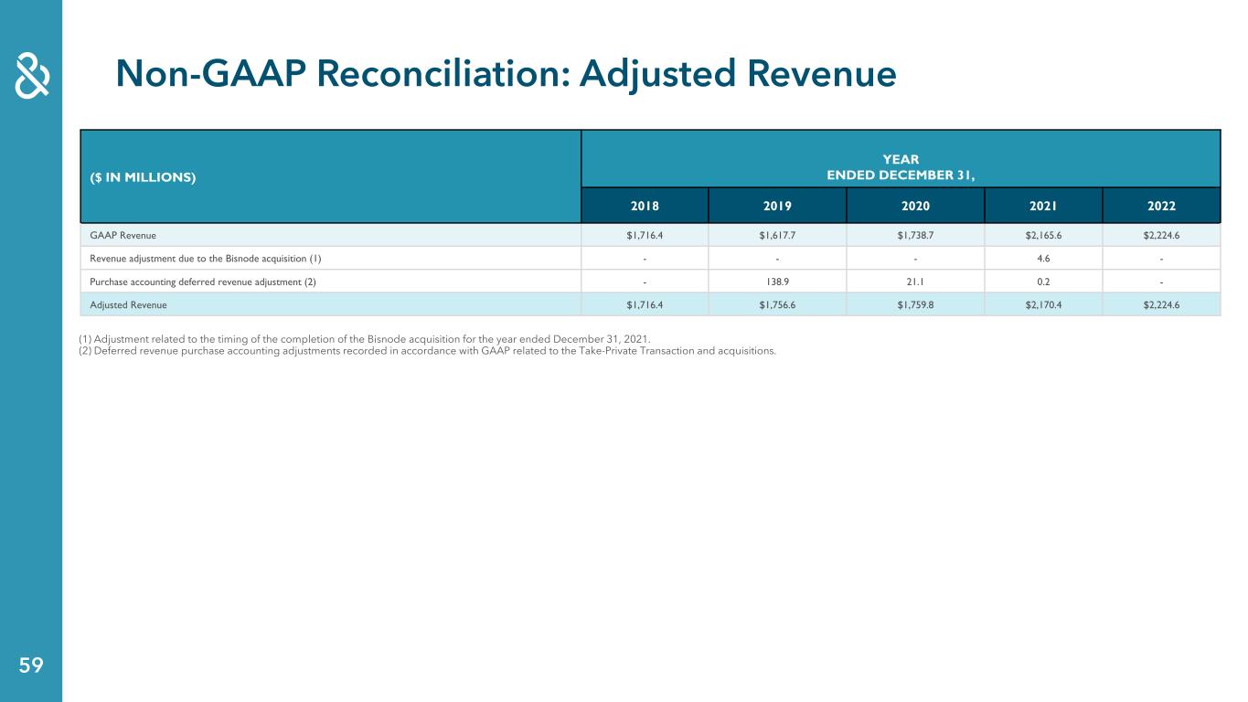 59 Non-GAAP Reconciliation: Adjusted Revenue ($ IN MILLIONS) YEAR ENDED DECEMBER 31, 2018 2019 2020 2021 2022 GAAP Revenue $1,716.4 $1,617.7 $1,738.7 $2,165.6 $2,224.6 Revenue adjustment due to the Bisnode acquisition (1) - - - 4.6 - Purchase accounting deferred revenue adjustment (2) - 138.9 21.1 0.2 - Adjusted Revenue $1,716.4 $1,756.6 $1,759.8 $2,170.4 $2,224.6 (1) Adjustment related to the timing of the completion of the Bisnode acquisition for the year ended December 31, 2021. (2) Deferred revenue purchase accounting adjustments recorded in accordance with GAAP related to the Take-Private Transaction and acquisitions.