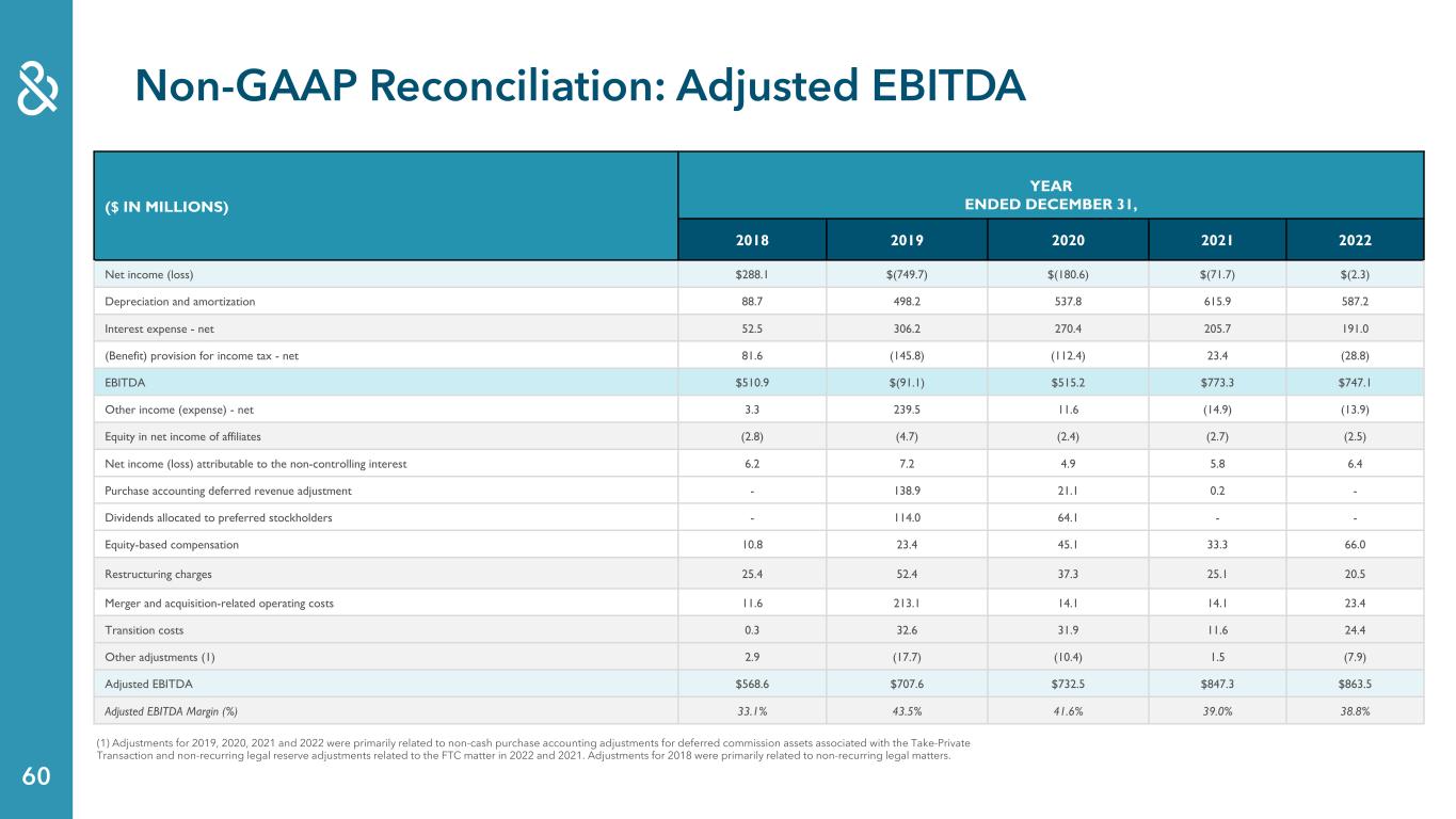 60 Non-GAAP Reconciliation: Adjusted EBITDA ($ IN MILLIONS) YEAR ENDED DECEMBER 31, 2018 2019 2020 2021 2022 Net income (loss) $288.1 $(749.7) $(180.6) $(71.7) $(2.3) Depreciation and amortization 88.7 498.2 537.8 615.9 587.2 Interest expense - net 52.5 306.2 270.4 205.7 191.0 (Benefit) provision for income tax - net 81.6 (145.8) (112.4) 23.4 (28.8) EBITDA $510.9 $(91.1) $515.2 $773.3 $747.1 Other income (expense) - net 3.3 239.5 11.6 (14.9) (13.9) Equity in net income of affiliates (2.8) (4.7) (2.4) (2.7) (2.5) Net income (loss) attributable to the non-controlling interest 6.2 7.2 4.9 5.8 6.4 Purchase accounting deferred revenue adjustment - 138.9 21.1 0.2 - Dividends allocated to preferred stockholders - 114.0 64.1 - - Equity-based compensation 10.8 23.4 45.1 33.3 66.0 Restructuring charges 25.4 52.4 37.3 25.1 20.5 Merger and acquisition-related operating costs 11.6 213.1 14.1 14.1 23.4 Transition costs 0.3 32.6 31.9 11.6 24.4 Other adjustments (1) 2.9 (17.7) (10.4) 1.5 (7.9) Adjusted EBITDA $568.6 $707.6 $732.5 $847.3 $863.5 Adjusted EBITDA Margin (%) 33.1% 43.5% 41.6% 39.0% 38.8% (1) Adjustments for 2019, 2020, 2021 and 2022 were primarily related to non-cash purchase accounting adjustments for deferred commission assets associated with the Take-Private Transaction and non-recurring legal reserve adjustments related to the FTC matter in 2022 and 2021. Adjustments for 2018 were primarily related to non-recurring legal matters.