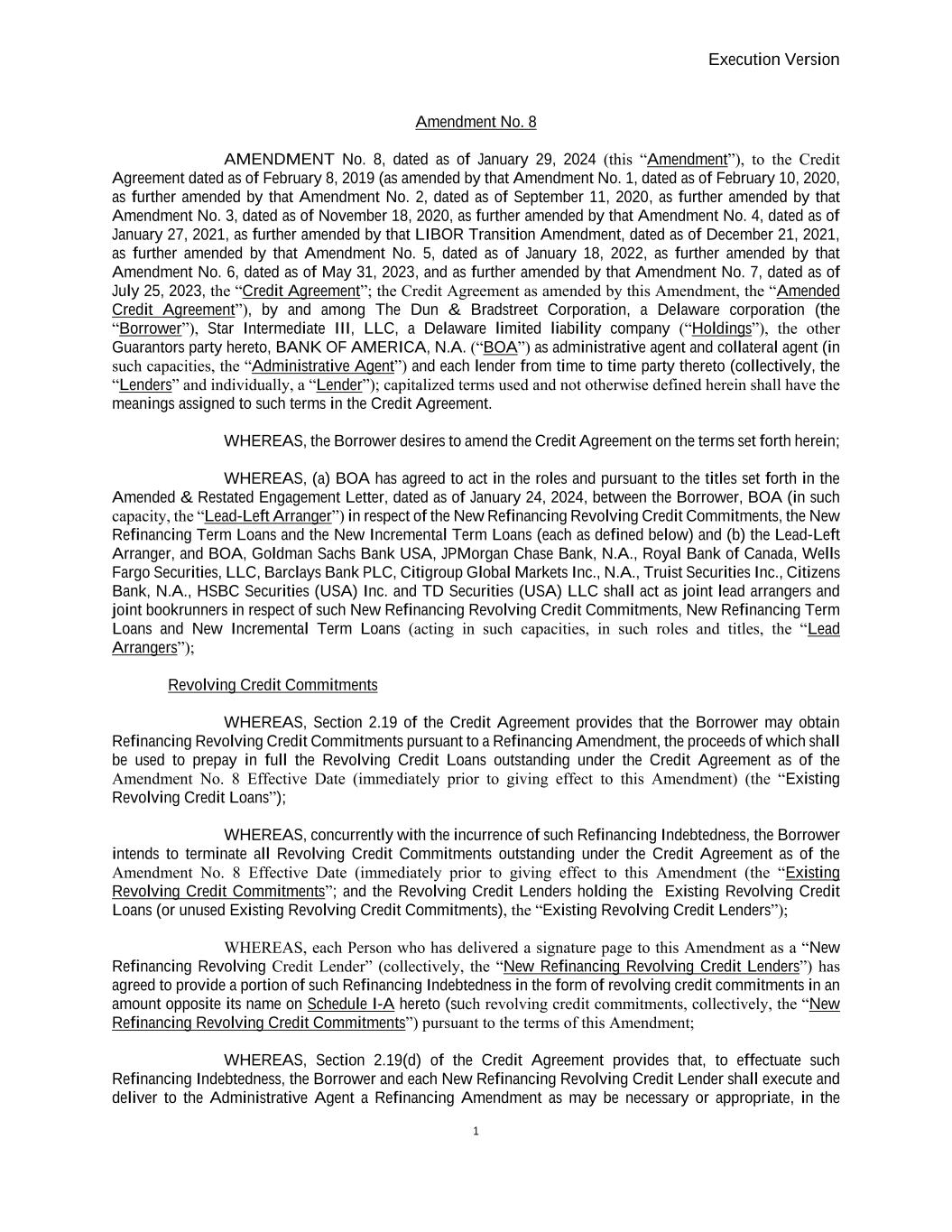 Execution Version 1 Amendment No. 8 AMENDMENT No. 8, dated as of January 29, 2024 (this “Amendment”), to the Credit Agreement dated as of February 8, 2019 (as amended by that Amendment No. 1, dated as of February 10, 2020, as further amended by that Amendment No. 2, dated as of September 11, 2020, as further amended by that Amendment No. 3, dated as of November 18, 2020, as further amended by that Amendment No. 4, dated as of January 27, 2021, as further amended by that LIBOR Transition Amendment, dated as of December 21, 2021, as further amended by that Amendment No. 5, dated as of January 18, 2022, as further amended by that Amendment No. 6, dated as of May 31, 2023, and as further amended by that Amendment No. 7, dated as of July 25, 2023, the “Credit Agreement”; the Credit Agreement as amended by this Amendment, the “Amended Credit Agreement”), by and among The Dun & Bradstreet Corporation, a Delaware corporation (the “Borrower”), Star Intermediate III, LLC, a Delaware limited liability company (“Holdings”), the other Guarantors party hereto, BANK OF AMERICA, N.A. (“BOA”) as administrative agent and collateral agent (in such capacities, the “Administrative Agent”) and each lender from time to time party thereto (collectively, the “Lenders” and individually, a “Lender”); capitalized terms used and not otherwise defined herein shall have the meanings assigned to such terms in the Credit Agreement. WHEREAS, the Borrower desires to amend the Credit Agreement on the terms set forth herein; WHEREAS, (a) BOA has agreed to act in the roles and pursuant to the titles set forth in the Amended & Restated Engagement Letter, dated as of January 24, 2024, between the Borrower, BOA (in such capacity, the “Lead-Left Arranger”) in respect of the New Refinancing Revolving Credit Commitments, the New Refinancing Term Loans and the New Incremental Term Loans (each as defined below) and (b) the Lead-Left Arranger, and BOA, Goldman Sachs Bank USA, JPMorgan Chase Bank, N.A., Royal Bank of Canada, Wells Fargo Securities, LLC, Barclays Bank PLC, Citigroup Global Markets Inc., N.A., Truist Securities Inc., Citizens Bank, N.A., HSBC Securities (USA) Inc. and TD Securities (USA) LLC shall act as joint lead arrangers and joint bookrunners in respect of such New Refinancing Revolving Credit Commitments, New Refinancing Term Loans and New Incremental Term Loans (acting in such capacities, in such roles and titles, the “Lead Arrangers”); Revolving Credit Commitments WHEREAS, Section 2.19 of the Credit Agreement provides that the Borrower may obtain Refinancing Revolving Credit Commitments pursuant to a Refinancing Amendment, the proceeds of which shall be used to prepay in full the Revolving Credit Loans outstanding under the Credit Agreement as of the Amendment No. 8 Effective Date (immediately prior to giving effect to this Amendment) (the “Existing Revolving Credit Loans”); WHEREAS, concurrently with the incurrence of such Refinancing Indebtedness, the Borrower intends to terminate all Revolving Credit Commitments outstanding under the Credit Agreement as of the Amendment No. 8 Effective Date (immediately prior to giving effect to this Amendment (the “Existing Revolving Credit Commitments”; and the Revolving Credit Lenders holding the Existing Revolving Credit Loans (or unused Existing Revolving Credit Commitments), the “Existing Revolving Credit Lenders”); WHEREAS, each Person who has delivered a signature page to this Amendment as a “New Refinancing Revolving Credit Lender” (collectively, the “New Refinancing Revolving Credit Lenders”) has agreed to provide a portion of such Refinancing Indebtedness in the form of revolving credit commitments in an amount opposite its name on Schedule I-A hereto (such revolving credit commitments, collectively, the “New Refinancing Revolving Credit Commitments”) pursuant to the terms of this Amendment; WHEREAS, Section 2.19(d) of the Credit Agreement provides that, to effectuate such Refinancing Indebtedness, the Borrower and each New Refinancing Revolving Credit Lender shall execute and deliver to the Administrative Agent a Refinancing Amendment as may be necessary or appropriate, in the