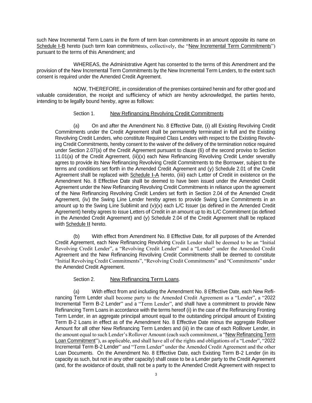 3 such New Incremental Term Loans in the form of term loan commitments in an amount opposite its name on Schedule I-B hereto (such term loan commitments, collectively, the “New Incremental Term Commitments”) pursuant to the terms of this Amendment; and WHEREAS, the Administrative Agent has consented to the terms of this Amendment and the provision of the New Incremental Term Commitments by the New Incremental Term Lenders, to the extent such consent is required under the Amended Credit Agreement. NOW, THEREFORE, in consideration of the premises contained herein and for other good and valuable consideration, the receipt and sufficiency of which are hereby acknowledged, the parties hereto, intending to be legally bound hereby, agree as follows: Section 1. New Refinancing Revolving Credit Commitments (a) On and after the Amendment No. 8 Effective Date, (i) all Existing Revolving Credit Commitments under the Credit Agreement shall be permanently terminated in full and the Existing Revolving Credit Lenders, who constitute Required Class Lenders with respect to the Existing Revolv- ing Credit Commitments, hereby consent to the waiver of the delivery of the termination notice required under Section 2.07(a) of the Credit Agreement pursuant to clause (6) of the second proviso to Section 11.01(a) of the Credit Agreement, (ii)(x) each New Refinancing Revolving Credit Lender severally agrees to provide its New Refinancing Revolving Credit Commitments to the Borrower, subject to the terms and conditions set forth in the Amended Credit Agreement and (y) Schedule 2.01 of the Credit Agreement shall be replaced with Schedule I-A hereto, (iii) each Letter of Credit in existence on the Amendment No. 8 Effective Date shall be deemed to have been issued under the Amended Credit Agreement under the New Refinancing Revolving Credit Commitments in reliance upon the agreement of the New Refinancing Revolving Credit Lenders set forth in Section 2.04 of the Amended Credit Agreement, (iv) the Swing Line Lender hereby agrees to provide Swing Line Commitments in an amount up to the Swing Line Sublimit and (v)(x) each L/C Issuer (as defined in the Amended Credit Agreement) hereby agrees to issue Letters of Credit in an amount up to its L/C Commitment (as defined in the Amended Credit Agreement) and (y) Schedule 2.04 of the Credit Agreement shall be replaced with Schedule II hereto. (b) With effect from Amendment No. 8 Effective Date, for all purposes of the Amended Credit Agreement, each New Refinancing Revolving Credit Lender shall be deemed to be an “Initial Revolving Credit Lender”, a “Revolving Credit Lender” and a “Lender” under the Amended Credit Agreement and the New Refinancing Revolving Credit Commitments shall be deemed to constitute “Initial Revolving Credit Commitments”, “Revolving Credit Commitments” and “Commitments” under the Amended Credit Agreement. Section 2. New Refinancing Term Loans. (a) With effect from and including the Amendment No. 8 Effective Date, each New Refi- nancing Term Lender shall become party to the Amended Credit Agreement as a “Lender”, a “2022 Incremental Term B-2 Lender” and a “Term Lender”, and shall have a commitment to provide New Refinancing Term Loans in accordance with the terms hereof (i) in the case of the Refinancing Fronting Term Lender, in an aggregate principal amount equal to the outstanding principal amount of Existing Term B-2 Loans in effect as of the Amendment No. 8 Effective Date minus the aggregate Rollover Amount for all other New Refinancing Term Lenders and (ii) in the case of each Rollover Lender, in the amount equal to such Lender’s Rollover Amount (each such commitment, a “New Refinancing Term Loan Commitment”), as applicable, and shall have all of the rights and obligations of a “Lender”, “2022 Incremental Term B-2 Lender” and “Term Lender” under the Amended Credit Agreement and the other Loan Documents. On the Amendment No. 8 Effective Date, each Existing Term B-2 Lender (in its capacity as such, but not in any other capacity) shall cease to be a Lender party to the Credit Agreement (and, for the avoidance of doubt, shall not be a party to the Amended Credit Agreement with respect to