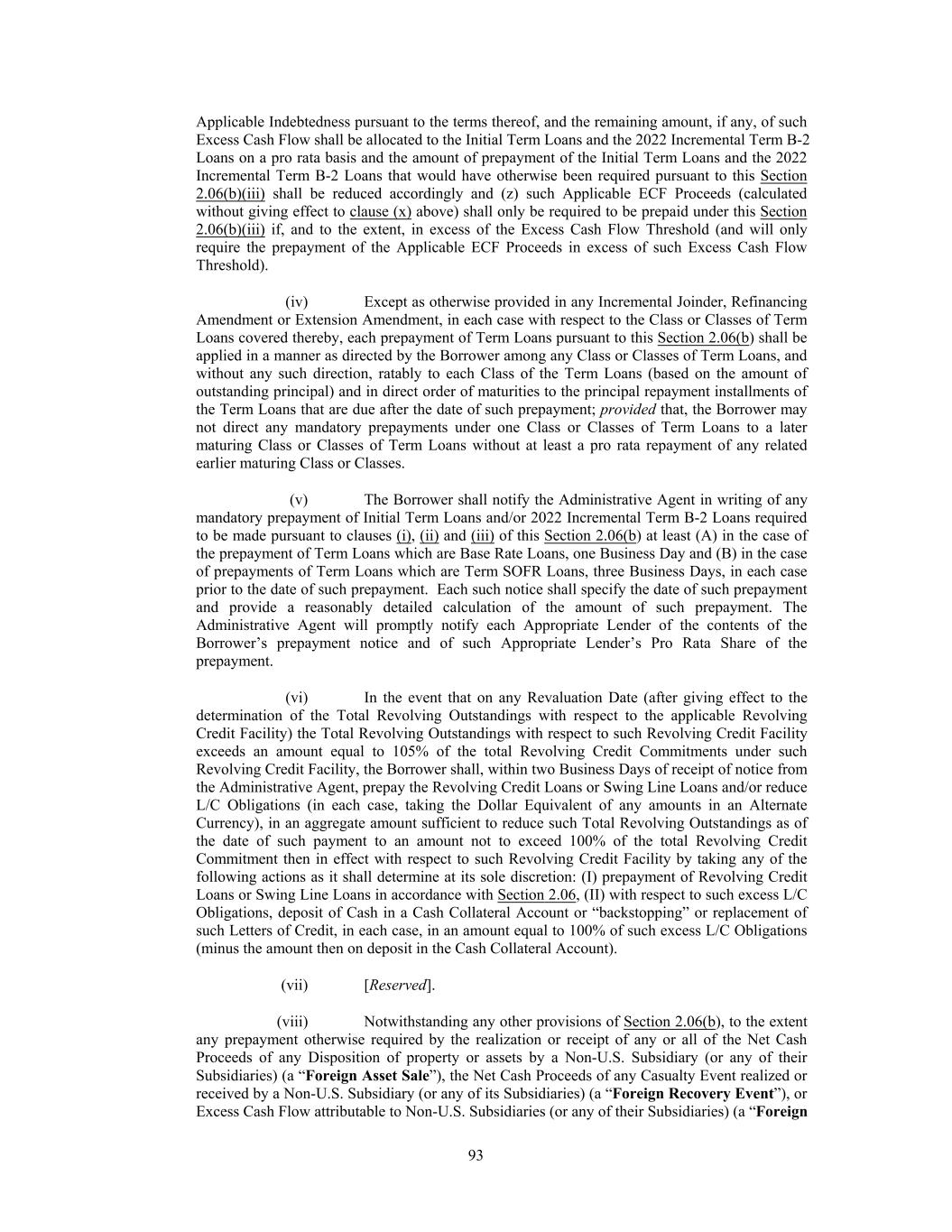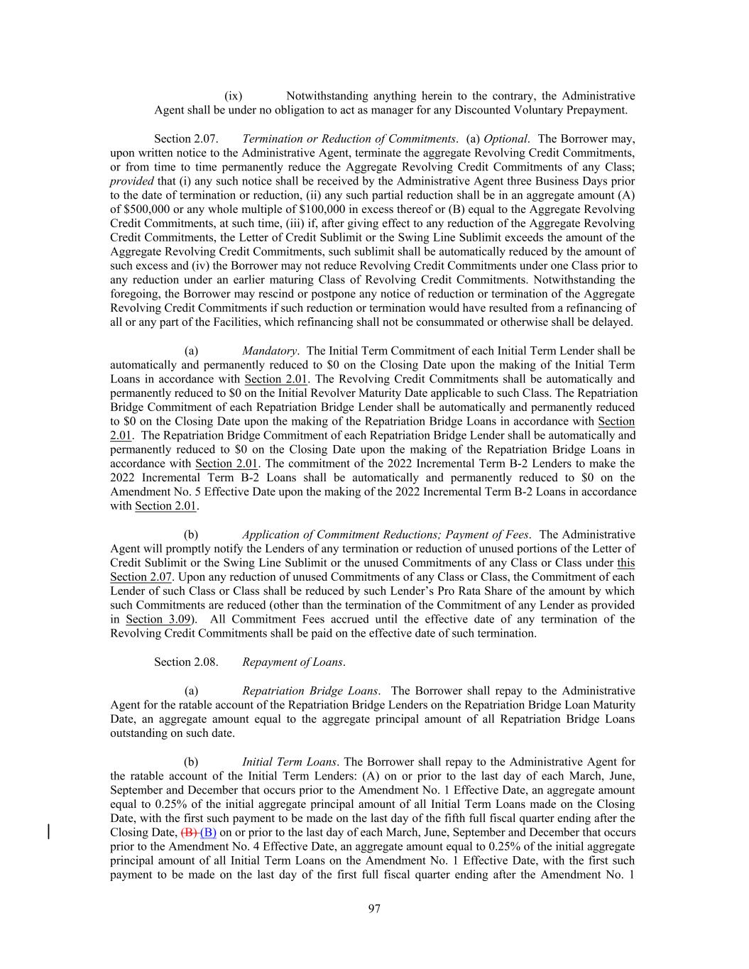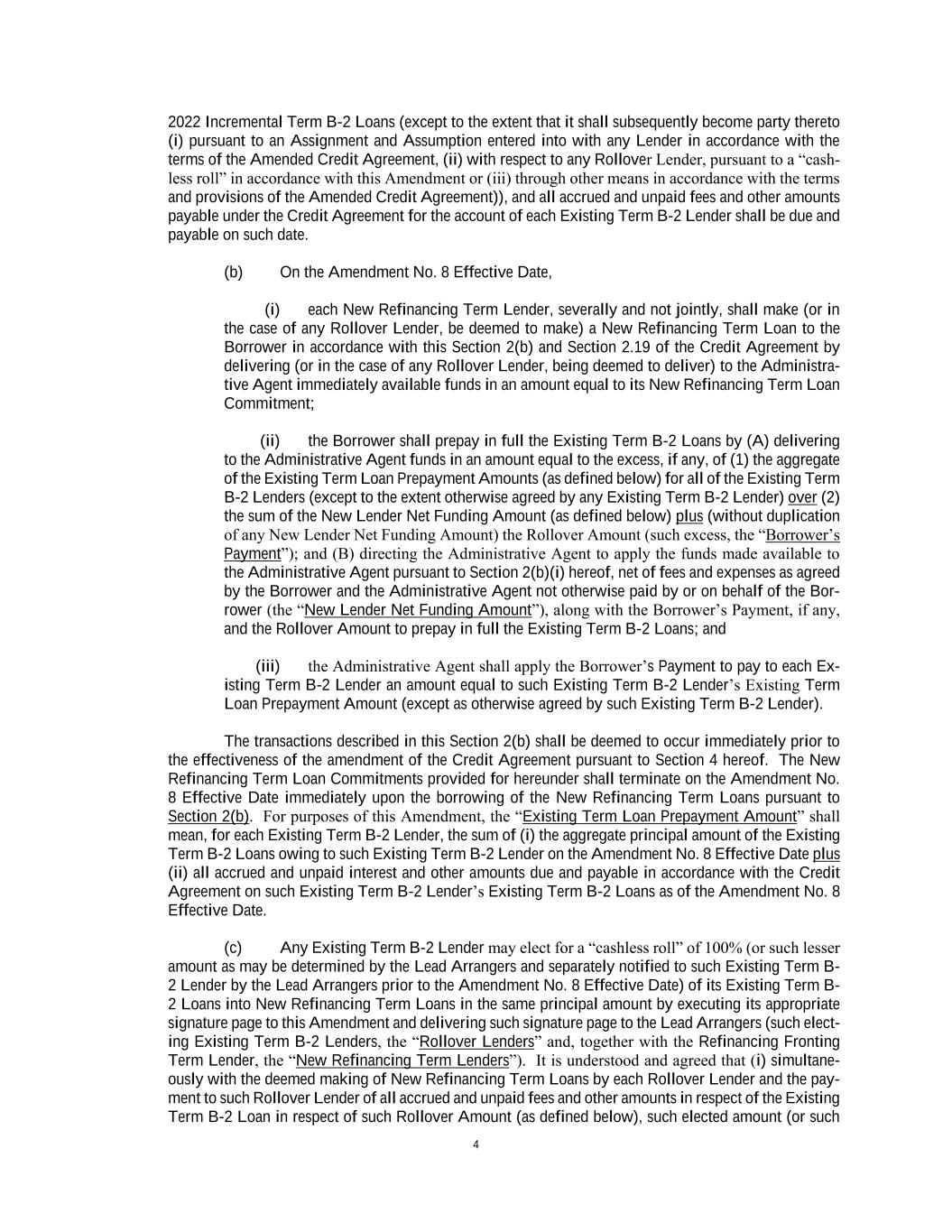 4 2022 Incremental Term B-2 Loans (except to the extent that it shall subsequently become party thereto (i) pursuant to an Assignment and Assumption entered into with any Lender in accordance with the terms of the Amended Credit Agreement, (ii) with respect to any Rollover Lender, pursuant to a “cash- less roll” in accordance with this Amendment or (iii) through other means in accordance with the terms and provisions of the Amended Credit Agreement)), and all accrued and unpaid fees and other amounts payable under the Credit Agreement for the account of each Existing Term B-2 Lender shall be due and payable on such date. (b) On the Amendment No. 8 Effective Date, (i) each New Refinancing Term Lender, severally and not jointly, shall make (or in the case of any Rollover Lender, be deemed to make) a New Refinancing Term Loan to the Borrower in accordance with this Section 2(b) and Section 2.19 of the Credit Agreement by delivering (or in the case of any Rollover Lender, being deemed to deliver) to the Administra- tive Agent immediately available funds in an amount equal to its New Refinancing Term Loan Commitment; (ii) the Borrower shall prepay in full the Existing Term B-2 Loans by (A) delivering to the Administrative Agent funds in an amount equal to the excess, if any, of (1) the aggregate of the Existing Term Loan Prepayment Amounts (as defined below) for all of the Existing Term B-2 Lenders (except to the extent otherwise agreed by any Existing Term B-2 Lender) over (2) the sum of the New Lender Net Funding Amount (as defined below) plus (without duplication of any New Lender Net Funding Amount) the Rollover Amount (such excess, the “Borrower’s Payment”); and (B) directing the Administrative Agent to apply the funds made available to the Administrative Agent pursuant to Section 2(b)(i) hereof, net of fees and expenses as agreed by the Borrower and the Administrative Agent not otherwise paid by or on behalf of the Bor- rower (the “New Lender Net Funding Amount”), along with the Borrower’s Payment, if any, and the Rollover Amount to prepay in full the Existing Term B-2 Loans; and (iii) the Administrative Agent shall apply the Borrower’s Payment to pay to each Ex- isting Term B-2 Lender an amount equal to such Existing Term B-2 Lender’s Existing Term Loan Prepayment Amount (except as otherwise agreed by such Existing Term B-2 Lender). The transactions described in this Section 2(b) shall be deemed to occur immediately prior to the effectiveness of the amendment of the Credit Agreement pursuant to Section 4 hereof. The New Refinancing Term Loan Commitments provided for hereunder shall terminate on the Amendment No. 8 Effective Date immediately upon the borrowing of the New Refinancing Term Loans pursuant to Section 2(b). For purposes of this Amendment, the “Existing Term Loan Prepayment Amount” shall mean, for each Existing Term B-2 Lender, the sum of (i) the aggregate principal amount of the Existing Term B-2 Loans owing to such Existing Term B-2 Lender on the Amendment No. 8 Effective Date plus (ii) all accrued and unpaid interest and other amounts due and payable in accordance with the Credit Agreement on such Existing Term B-2 Lender’s Existing Term B-2 Loans as of the Amendment No. 8 Effective Date. (c) Any Existing Term B-2 Lender may elect for a “cashless roll” of 100% (or such lesser amount as may be determined by the Lead Arrangers and separately notified to such Existing Term B- 2 Lender by the Lead Arrangers prior to the Amendment No. 8 Effective Date) of its Existing Term B- 2 Loans into New Refinancing Term Loans in the same principal amount by executing its appropriate signature page to this Amendment and delivering such signature page to the Lead Arrangers (such elect- ing Existing Term B-2 Lenders, the “Rollover Lenders” and, together with the Refinancing Fronting Term Lender, the “New Refinancing Term Lenders”). It is understood and agreed that (i) simultane- ously with the deemed making of New Refinancing Term Loans by each Rollover Lender and the pay- ment to such Rollover Lender of all accrued and unpaid fees and other amounts in respect of the Existing Term B-2 Loan in respect of such Rollover Amount (as defined below), such elected amount (or such
