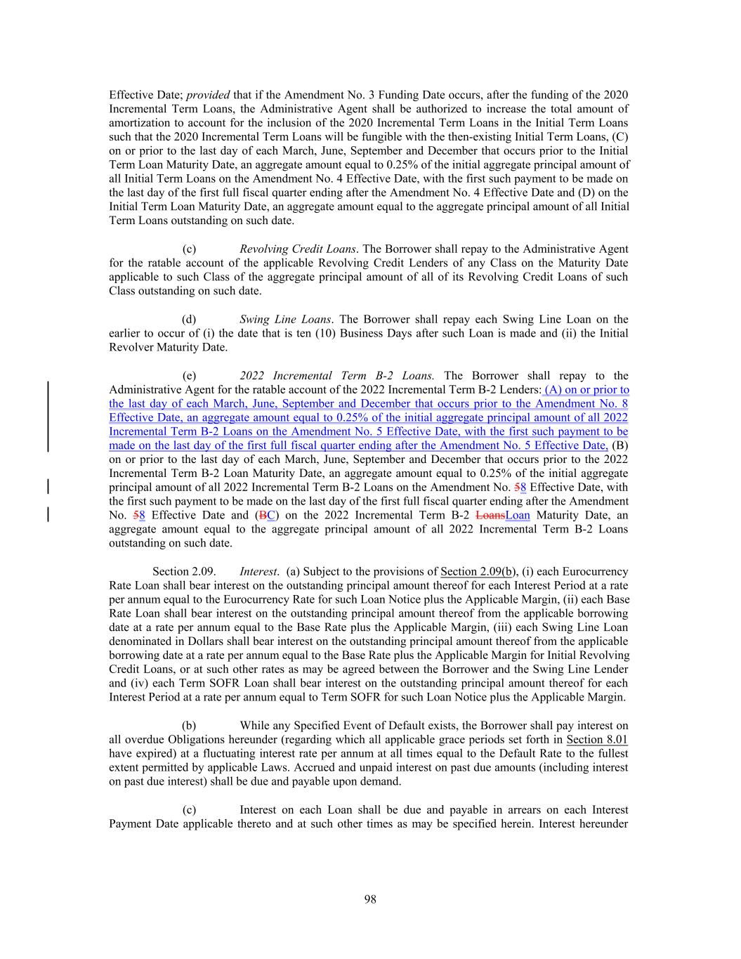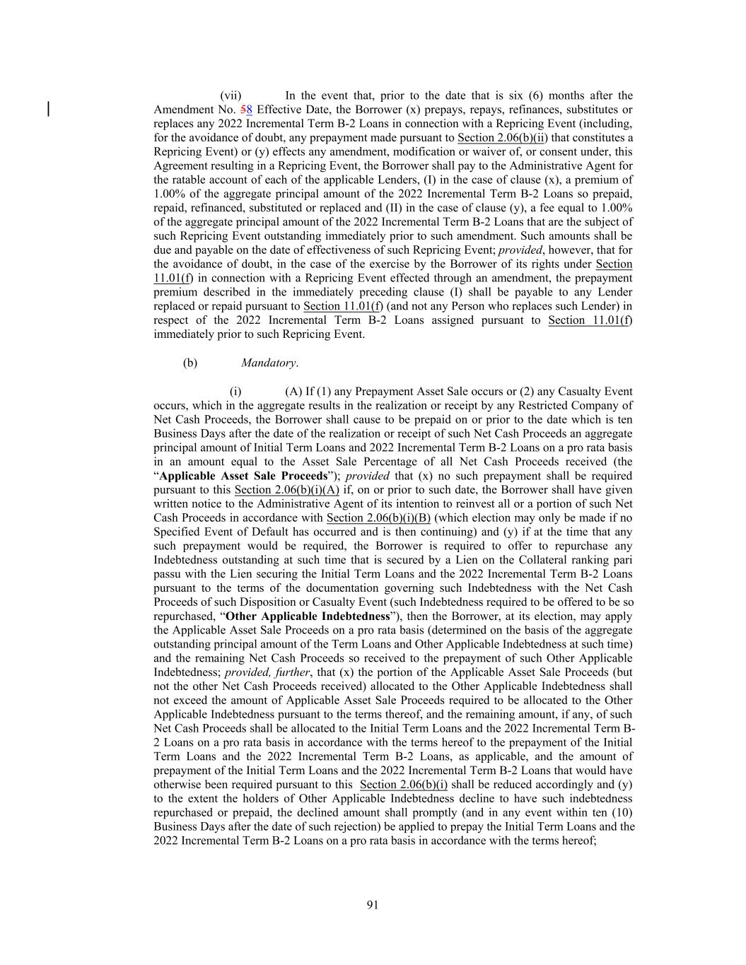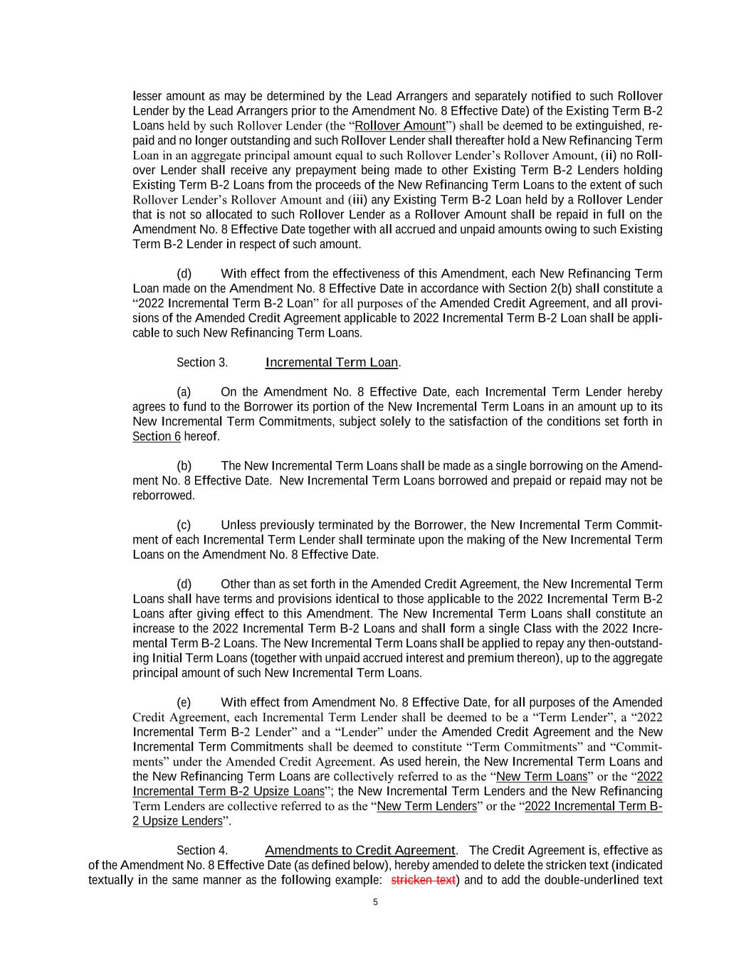 5 lesser amount as may be determined by the Lead Arrangers and separately notified to such Rollover Lender by the Lead Arrangers prior to the Amendment No. 8 Effective Date) of the Existing Term B-2 Loans held by such Rollover Lender (the “Rollover Amount”) shall be deemed to be extinguished, re- paid and no longer outstanding and such Rollover Lender shall thereafter hold a New Refinancing Term Loan in an aggregate principal amount equal to such Rollover Lender’s Rollover Amount, (ii) no Roll- over Lender shall receive any prepayment being made to other Existing Term B-2 Lenders holding Existing Term B-2 Loans from the proceeds of the New Refinancing Term Loans to the extent of such Rollover Lender’s Rollover Amount and (iii) any Existing Term B-2 Loan held by a Rollover Lender that is not so allocated to such Rollover Lender as a Rollover Amount shall be repaid in full on the Amendment No. 8 Effective Date together with all accrued and unpaid amounts owing to such Existing Term B-2 Lender in respect of such amount. (d) With effect from the effectiveness of this Amendment, each New Refinancing Term Loan made on the Amendment No. 8 Effective Date in accordance with Section 2(b) shall constitute a “2022 Incremental Term B-2 Loan” for all purposes of the Amended Credit Agreement, and all provi- sions of the Amended Credit Agreement applicable to 2022 Incremental Term B-2 Loan shall be appli- cable to such New Refinancing Term Loans. Section 3. Incremental Term Loan. (a) On the Amendment No. 8 Effective Date, each Incremental Term Lender hereby agrees to fund to the Borrower its portion of the New Incremental Term Loans in an amount up to its New Incremental Term Commitments, subject solely to the satisfaction of the conditions set forth in Section 6 hereof. (b) The New Incremental Term Loans shall be made as a single borrowing on the Amend- ment No. 8 Effective Date. New Incremental Term Loans borrowed and prepaid or repaid may not be reborrowed. (c) Unless previously terminated by the Borrower, the New Incremental Term Commit- ment of each Incremental Term Lender shall terminate upon the making of the New Incremental Term Loans on the Amendment No. 8 Effective Date. (d) Other than as set forth in the Amended Credit Agreement, the New Incremental Term Loans shall have terms and provisions identical to those applicable to the 2022 Incremental Term B-2 Loans after giving effect to this Amendment. The New Incremental Term Loans shall constitute an increase to the 2022 Incremental Term B-2 Loans and shall form a single Class with the 2022 Incre- mental Term B-2 Loans. The New Incremental Term Loans shall be applied to repay any then-outstand- ing Initial Term Loans (together with unpaid accrued interest and premium thereon), up to the aggregate principal amount of such New Incremental Term Loans. (e) With effect from Amendment No. 8 Effective Date, for all purposes of the Amended Credit Agreement, each Incremental Term Lender shall be deemed to be a “Term Lender”, a “2022 Incremental Term B-2 Lender” and a “Lender” under the Amended Credit Agreement and the New Incremental Term Commitments shall be deemed to constitute “Term Commitments” and “Commit- ments” under the Amended Credit Agreement. As used herein, the New Incremental Term Loans and the New Refinancing Term Loans are collectively referred to as the “New Term Loans” or the “2022 Incremental Term B-2 Upsize Loans”; the New Incremental Term Lenders and the New Refinancing Term Lenders are collective referred to as the “New Term Lenders” or the “2022 Incremental Term B- 2 Upsize Lenders”. Section 4. Amendments to Credit Agreement. The Credit Agreement is, effective as of the Amendment No. 8 Effective Date (as defined below), hereby amended to delete the stricken text (indicated textually in the same manner as the following example: stricken text) and to add the double-underlined text