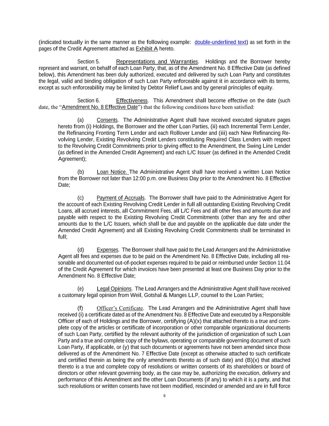 6 (indicated textually in the same manner as the following example: double-underlined text) as set forth in the pages of the Credit Agreement attached as Exhibit A hereto. Section 5. Representations and Warranties. Holdings and the Borrower hereby represent and warrant, on behalf of each Loan Party, that, as of the Amendment No. 8 Effective Date (as defined below), this Amendment has been duly authorized, executed and delivered by such Loan Party and constitutes the legal, valid and binding obligation of such Loan Party enforceable against it in accordance with its terms, except as such enforceability may be limited by Debtor Relief Laws and by general principles of equity. Section 6. Effectiveness. This Amendment shall become effective on the date (such date, the “Amendment No. 8 Effective Date”) that the following conditions have been satisfied: (a) Consents. The Administrative Agent shall have received executed signature pages hereto from (i) Holdings, the Borrower and the other Loan Parties, (ii) each Incremental Term Lender, the Refinancing Fronting Term Lender and each Rollover Lender and (iii) each New Refinancing Re- volving Lender, Existing Revolving Credit Lenders constituting Required Class Lenders with respect to the Revolving Credit Commitments prior to giving effect to the Amendment, the Swing Line Lender (as defined in the Amended Credit Agreement) and each L/C Issuer (as defined in the Amended Credit Agreement); (b) Loan Notice. The Administrative Agent shall have received a written Loan Notice from the Borrower not later than 12:00 p.m. one Business Day prior to the Amendment No. 8 Effective Date; (c) Payment of Accruals. The Borrower shall have paid to the Administrative Agent for the account of each Existing Revolving Credit Lender in full all outstanding Existing Revolving Credit Loans, all accrued interests, all Commitment Fees, all L/C Fees and all other fees and amounts due and payable with respect to the Existing Revolving Credit Commitments (other than any fee and other amounts due to the L/C Issuers, which shall be due and payable on the applicable due date under the Amended Credit Agreement) and all Existing Revolving Credit Commitments shall be terminated in full; (d) Expenses. The Borrower shall have paid to the Lead Arrangers and the Administrative Agent all fees and expenses due to be paid on the Amendment No. 8 Effective Date, including all rea- sonable and documented out-of-pocket expenses required to be paid or reimbursed under Section 11.04 of the Credit Agreement for which invoices have been presented at least one Business Day prior to the Amendment No. 8 Effective Date; (e) Legal Opinions. The Lead Arrangers and the Administrative Agent shall have received a customary legal opinion from Weil, Gotshal & Manges LLP, counsel to the Loan Parties; (f) Officer’s Certificate. The Lead Arrangers and the Administrative Agent shall have received (i) a certificate dated as of the Amendment No. 8 Effective Date and executed by a Responsible Officer of each of Holdings and the Borrower, certifying (A)(x) that attached thereto is a true and com- plete copy of the articles or certificate of incorporation or other comparable organizational documents of such Loan Party, certified by the relevant authority of the jurisdiction of organization of such Loan Party and a true and complete copy of the bylaws, operating or comparable governing document of such Loan Party, if applicable, or (y) that such documents or agreements have not been amended since those delivered as of the Amendment No. 7 Effective Date (except as otherwise attached to such certificate and certified therein as being the only amendments thereto as of such date) and (B)(x) that attached thereto is a true and complete copy of resolutions or written consents of its shareholders or board of directors or other relevant governing body, as the case may be, authorizing the execution, delivery and performance of this Amendment and the other Loan Documents (if any) to which it is a party, and that such resolutions or written consents have not been modified, rescinded or amended and are in full force