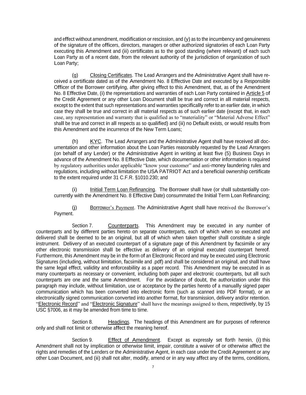 7 and effect without amendment, modification or rescission, and (y) as to the incumbency and genuineness of the signature of the officers, directors, managers or other authorized signatories of each Loan Party executing this Amendment and (ii) certificates as to the good standing (where relevant) of each such Loan Party as of a recent date, from the relevant authority of the jurisdiction of organization of such Loan Party; (g) Closing Certificates. The Lead Arrangers and the Administrative Agent shall have re- ceived a certificate dated as of the Amendment No. 8 Effective Date and executed by a Responsible Officer of the Borrower certifying, after giving effect to this Amendment, that, as of the Amendment No. 8 Effective Date, (i) the representations and warranties of each Loan Party contained in Article 5 of the Credit Agreement or any other Loan Document shall be true and correct in all material respects, except to the extent that such representations and warranties specifically refer to an earlier date, in which case they shall be true and correct in all material respects as of such earlier date (except that, in each case, any representation and warranty that is qualified as to “materiality” or “Material Adverse Effect” shall be true and correct in all respects as so qualified) and (ii) no Default exists, or would results from this Amendment and the incurrence of the New Term Loans; (h) KYC. The Lead Arrangers and the Administrative Agent shall have received all doc- umentation and other information about the Loan Parties reasonably requested by the Lead Arrangers (on behalf of any Lender) or the Administrative Agent in writing at least five (5) Business Days in advance of the Amendment No. 8 Effective Date, which documentation or other information is required by regulatory authorities under applicable “know your customer” and anti-money laundering rules and regulations, including without limitation the USA PATRIOT Act and a beneficial ownership certificate to the extent required under 31 C.F.R. §1010.230; and (i) Initial Term Loan Refinancing. The Borrower shall have (or shall substantially con- currently with the Amendment No. 8 Effective Date) consummated the Initial Term Loan Refinancing; (j) Borrower’s Payment. The Administrative Agent shall have received the Borrower’s Payment. Section 7. Counterparts. This Amendment may be executed in any number of counterparts and by different parties hereto on separate counterparts, each of which when so executed and delivered shall be deemed to be an original, but all of which when taken together shall constitute a single instrument. Delivery of an executed counterpart of a signature page of this Amendment by facsimile or any other electronic transmission shall be effective as delivery of an original executed counterpart hereof. Furthermore, this Amendment may be in the form of an Electronic Record and may be executed using Electronic Signatures (including, without limitation, facsimile and .pdf) and shall be considered an original, and shall have the same legal effect, validity and enforceability as a paper record. This Amendment may be executed in as many counterparts as necessary or convenient, including both paper and electronic counterparts, but all such counterparts are one and the same Amendment. For the avoidance of doubt, the authorization under this paragraph may include, without limitation, use or acceptance by the parties hereto of a manually signed paper communication which has been converted into electronic form (such as scanned into PDF format), or an electronically signed communication converted into another format, for transmission, delivery and/or retention. “Electronic Record” and “Electronic Signature” shall have the meanings assigned to them, respectively, by 15 USC §7006, as it may be amended from time to time. Section 8. Headings. The headings of this Amendment are for purposes of reference only and shall not limit or otherwise affect the meaning hereof. Section 9. Effect of Amendment. Except as expressly set forth herein, (i) this Amendment shall not by implication or otherwise limit, impair, constitute a waiver of or otherwise affect the rights and remedies of the Lenders or the Administrative Agent, in each case under the Credit Agreement or any other Loan Document, and (ii) shall not alter, modify, amend or in any way affect any of the terms, conditions,