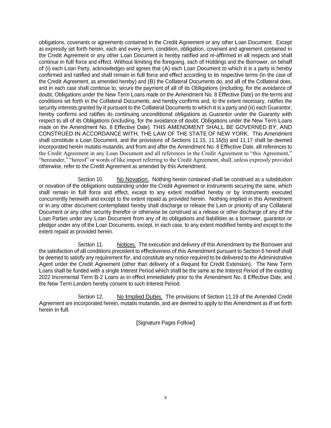 8 obligations, covenants or agreements contained in the Credit Agreement or any other Loan Document. Except as expressly set forth herein, each and every term, condition, obligation, covenant and agreement contained in the Credit Agreement or any other Loan Document is hereby ratified and re-affirmed in all respects and shall continue in full force and effect. Without limiting the foregoing, each of Holdings and the Borrower, on behalf of (i) each Loan Party, acknowledges and agrees that (A) each Loan Document to which it is a party is hereby confirmed and ratified and shall remain in full force and effect according to its respective terms (in the case of the Credit Agreement, as amended hereby) and (B) the Collateral Documents do, and all of the Collateral does, and in each case shall continue to, secure the payment of all of its Obligations (including, for the avoidance of doubt, Obligations under the New Term Loans made on the Amendment No. 8 Effective Date) on the terms and conditions set forth in the Collateral Documents, and hereby confirms and, to the extent necessary, ratifies the security interests granted by it pursuant to the Collateral Documents to which it is a party and (ii) each Guarantor, hereby confirms and ratifies its continuing unconditional obligations as Guarantor under the Guaranty with respect to all of its Obligations (including, for the avoidance of doubt, Obligations under the New Term Loans made on the Amendment No. 8 Effective Date). THIS AMENDMENT SHALL BE GOVERNED BY, AND CONSTRUED IN ACCORDANCE WITH, THE LAW OF THE STATE OF NEW YORK. This Amendment shall constitute a Loan Document, and the provisions of Sections 11.15, 11.16(b) and 11.17 shall be deemed incorporated herein mutatis mutandis, and from and after the Amendment No. 8 Effective Date, all references to the Credit Agreement in any Loan Document and all references in the Credit Agreement to “this Agreement,” “hereunder,” “hereof” or words of like import referring to the Credit Agreement, shall, unless expressly provided otherwise, refer to the Credit Agreement as amended by this Amendment. Section 10. No Novation. Nothing herein contained shall be construed as a substitution or novation of the obligations outstanding under the Credit Agreement or instruments securing the same, which shall remain in full force and effect, except to any extent modified hereby or by instruments executed concurrently herewith and except to the extent repaid as provided herein. Nothing implied in this Amendment or in any other document contemplated hereby shall discharge or release the Lien or priority of any Collateral Document or any other security therefor or otherwise be construed as a release or other discharge of any of the Loan Parties under any Loan Document from any of its obligations and liabilities as a borrower, guarantor or pledgor under any of the Loan Documents, except, in each case, to any extent modified hereby and except to the extent repaid as provided herein. Section 11. Notices. The execution and delivery of this Amendment by the Borrower and the satisfaction of all conditions precedent to effectiveness of this Amendment pursuant to Section 6 hereof shall be deemed to satisfy any requirement for, and constitute any notice required to be delivered to the Administrative Agent under the Credit Agreement (other than delivery of a Request for Credit Extension). The New Term Loans shall be funded with a single Interest Period which shall be the same as the Interest Period of the existing 2022 Incremental Term B-2 Loans as in effect immediately prior to the Amendment No. 8 Effective Date, and the New Term Lenders hereby consent to such Interest Period. Section 12. No Implied Duties. The provisions of Section 11.19 of the Amended Credit Agreement are incorporated herein, mutatis mutandis, and are deemed to apply to this Amendment as if set forth herein in full. [Signature Pages Follow]
