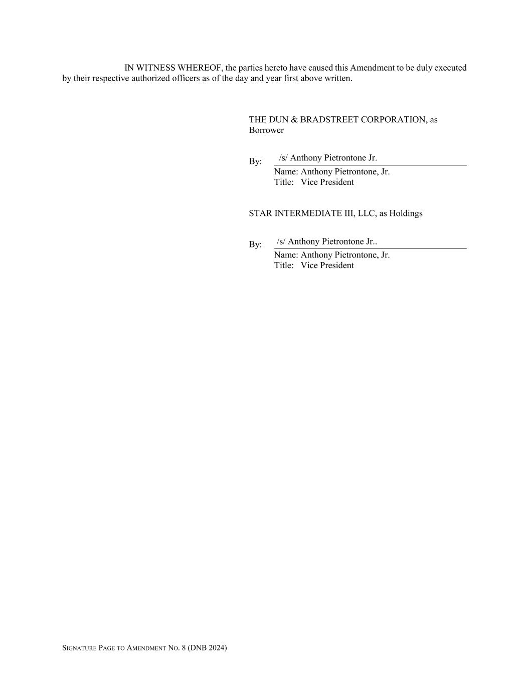 IN WITNESS WHEREOF, the parties hereto have caused this Amendment to be duly executed by their respective authorized officers as of the day and year first above written. THE DUN & BRADSTREET CORPORATION, as Borrower By: Name: Anthony Pietrontone, Jr. Title: Vice President STAR INTERMEDIATE III, LLC, as Holdings By: Name: Anthony Pietrontone, Jr. Title: Vice President /s/ Anthony Pietrontone Jr. /s/ Anthony Pietrontone Jr.. SIGNATURE PAGE TO AMENDMENT NO. 8 (DNB 2024)