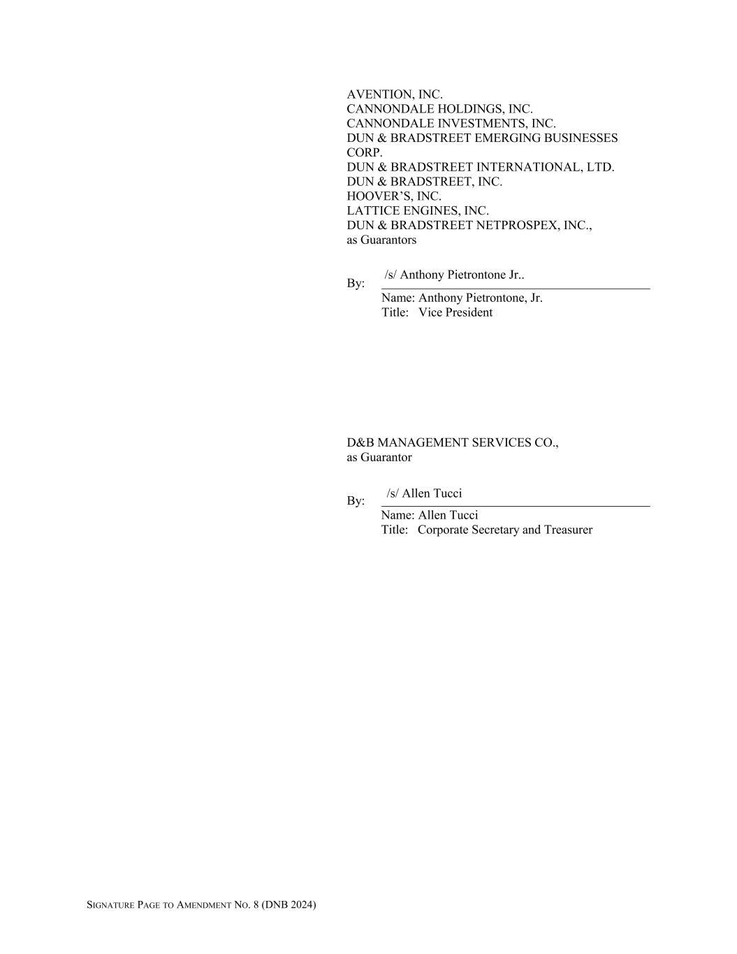 AVENTION, INC., CANNONDALE HOLDINGS, INC., CANNONDALE INVESTMENTS, INC., DUN & BRADSTREET EMERGING BUSINESSES CORP., DUN & BRADSTREET INTERNATIONAL, LTD., DUN & BRADSTREET, INC., HOOVER’S, INC., LATTICE ENGINES, INC., DUN & BRADSTREET NETPROSPEX, INC., as Guarantors By: Name: Anthony Pietrontone, Jr. Title: Vice President D&B MANAGEMENT SERVICES CO., as Guarantor By: Name: Allen Tucci Title: Corporate Secretary and Treasurer /s/ Anthony Pietrontone Jr.. /s/ Allen Tucci SIGNATURE PAGE TO AMENDMENT NO. 8 (DNB 2024)