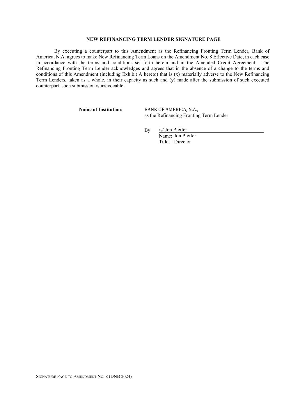 NEW REFINANCING TERM LENDER SIGNATURE PAGE By executing a counterpart to this Amendment as the Refinancing Fronting Term Lender, Bank of America, N.A. agrees to make New Refinancing Term Loans on the Amendment No. 8 Effective Date, in each case in accordance with the terms and conditions set forth herein and in the Amended Credit Agreement. The Refinancing Fronting Term Lender acknowledges and agrees that in the absence of a change to the terms and conditions of this Amendment (including Exhibit A hereto) that is (x) materially adverse to the New Refinancing Term Lenders, taken as a whole, in their capacity as such and (y) made after the submission of such executed counterpart, such submission is irrevocable. Name of Institution: BANK OF AMERICA, N.A., as the Refinancing Fronting Term Lender By: Name: Title: SIGNATURE PAGE TO AMENDMENT NO. 8 (DNB 2024) /s/ Jon Pfeifer Jon Pfeifer Director