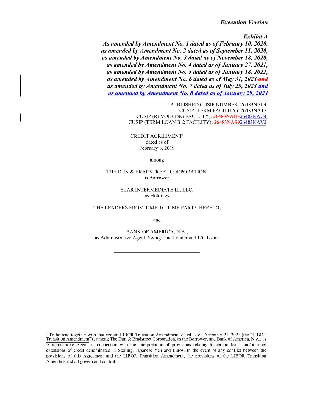 Execution Version Exhibit A As amended by Amendment No. 1 dated as of February 10, 2020, as amended by Amendment No. 2 dated as of September 11, 2020, as amended by Amendment No. 3 dated as of November 18, 2020, as amended by Amendment No. 4 dated as of January 27, 2021, as amended by Amendment No. 5 dated as of January 18, 2022, as amended by Amendment No. 6 dated as of May 31, 2023 and as amended by Amendment No. 7 dated as of July 25, 2023 and as amended by Amendment No. 8 dated as of January 29, 2024 CREDIT AGREEMENT1 dated as of February 8, 2019 among THE DUN & BRADSTREET CORPORATION, as Borrower, STAR INTERMEDIATE III, LLC, as Holdings THE LENDERS FROM TIME TO TIME PARTY HERETO, and BANK OF AMERICA, N.A., as Administrative Agent, Swing Line Lender and L/C Issuer _________________________________ 1 To be read together with that certain LIBOR Transition Amendment, dated as of December 21, 2021 (the “LIBOR Transition Amendment”) , among The Dun & Bradstreet Corporation, as the Borrower, and Bank of America, N.A., as Administrative Agent, in connection with the interpretation of provisions relating to certain loans and/or other extensions of credit denominated in Sterling, Japanese Yen and Euros. In the event of any conflict between the provisions of this Agreement and the LIBOR Transition Amendment, the provisions of the LIBOR Transition Amendment shall govern and control. PUBLISHED CUSIP NUMBER: 26483NAL4 CUSIP (TERM FACILITY): 26483NAT7 CUSIP (REVOLVING FACILITY): 26483NAQ326483NAU4 CUSIP (TERM LOAN B-2 FACILITY): 26483NAS926483NAV2