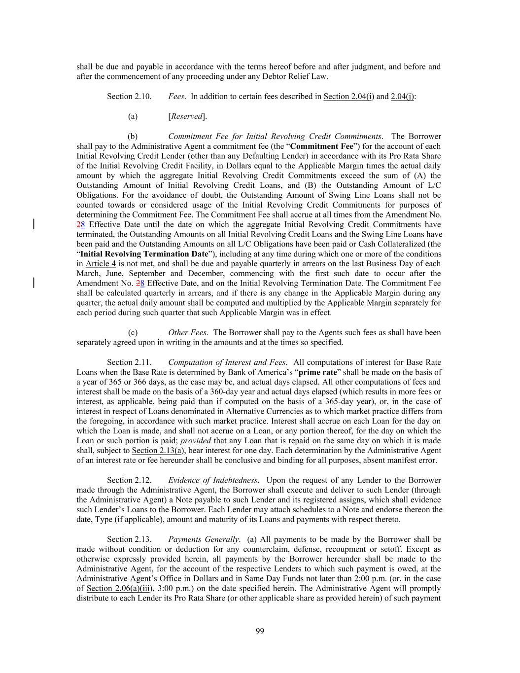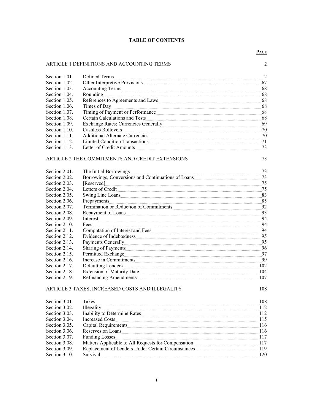 TABLE OF CONTENTS PAGE ARTICLE 1 DEFINITIONS AND ACCOUNTING TERMS 2 Section 1.01. 2 Section 1.02. 67 Section 1.03. 68 Section 1.04. 68 Section 1.05. 68 Section 1.06. 68 Section 1.07. 68 Section 1.08. 68 Section 1.09. 69 Section 1.10. 70 Section 1.11. 70 Section 1.12. 71 Section 1.13. Defined Terms Other Interpretive Provisions Accounting Terms Rounding References to Agreements and Laws Times of Day Timing of Payment or Performance Certain Calculations and Tests Exchange Rates; Currencies Generally Cashless Rollovers Additional Alternate Currencies Limited Condition Transactions Letter of Credit Amounts 73 ARTICLE 2 THE COMMITMENTS AND CREDIT EXTENSIONS 73 Section 2.01. 73 Section 2.02. 73 Section 2.03. 75 Section 2.04. 75 Section 2.05. 83 Section 2.06. 85 Section 2.07. 92 Section 2.08. 93 Section 2.09. 94 Section 2.10. 94 Section 2.11. 94 Section 2.12. 95 Section 2.13. 95 Section 2.14. 96 Section 2.15. 97 Section 2.16. 99 Section 2.17. 102 Section 2.18. 104 Section 2.19. The Initial Borrowings Borrowings, Conversions and Continuations of Loans [Reserved] Letters of Credit Swing Line Loans Prepayments Termination or Reduction of Commitments Repayment of Loans Interest Fees Computation of Interest and Fees Evidence of Indebtedness Payments Generally Sharing of Payments Permitted Exchange Increase in Commitments Defaulting Lenders Extension of Maturity Date Refinancing Amendments 107 ARTICLE 3 TAXES, INCREASED COSTS AND ILLEGALITY 108 Section 3.01. 108 Section 3.02. 112 Section 3.03. 112 Section 3.04. 115 Section 3.05. 116 Section 3.06. 116 Section 3.07. 117 Section 3.08. 117 Section 3.09. 119 Section 3.10. Taxes Illegality Inability to Determine Rates Increased Costs Capital Requirements Reserves on Loans Funding Losses Matters Applicable to All Requests for Compensation Replacement of Lenders Under Certain Circumstances Survival 120 i