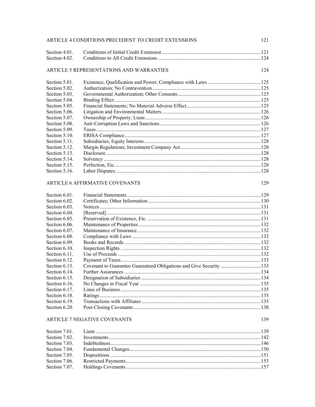 ARTICLE 4 CONDITIONS PRECEDENT TO CREDIT EXTENSIONS 121 Section 4.01. Conditions of Initial Credit Extension ............................................................................ 121 Section 4.02. Conditions to All Credit Extensions ............................................................................... 124 ARTICLE 5 REPRESENTATIONS AND WARRANTIES 124 Section 5.01. Existence, Qualification and Power; Compliance with Laws ......................................... 125 Section 5.02. Authorization; No Contravention .................................................................................... 125 Section 5.03. Governmental Authorization; Other Consents ................................................................ 125 Section 5.04. Binding Effect ................................................................................................................. 125 Section 5.05. Financial Statements; No Material Adverse Effect ......................................................... 125 Section 5.06. Litigation and Environmental Matters ............................................................................ 126 Section 5.07. Ownership of Property; Liens ......................................................................................... 126 Section 5.08. Anti-Corruption Laws and Sanctions .............................................................................. 126 Section 5.09. Taxes ............................................................................................................................... 127 Section 5.10. ERISA Compliance ......................................................................................................... 127 Section 5.11. Subsidiaries; Equity Interests .......................................................................................... 128 Section 5.12. Margin Regulations; Investment Company Act .............................................................. 128 Section 5.13. Disclosure ....................................................................................................................... 128 Section 5.14. Solvency ......................................................................................................................... 128 Section 5.15. Perfection, Etc. ................................................................................................................ 128 Section 5.16. Labor Disputes ................................................................................................................ 128 ARTICLE 6 AFFIRMATIVE COVENANTS 129 Section 6.01. Financial Statements ....................................................................................................... 129 Section 6.02. Certificates; Other Information ....................................................................................... 130 Section 6.03. Notices ............................................................................................................................ 131 Section 6.04. [Reserved] ....................................................................................................................... 131 Section 6.05. Preservation of Existence, Etc. ....................................................................................... 131 Section 6.06. Maintenance of Properties .............................................................................................. 132 Section 6.07. Maintenance of Insurance ............................................................................................... 132 Section 6.08. Compliance with Laws ................................................................................................... 132 Section 6.09. Books and Records ......................................................................................................... 132 Section 6.10. Inspection Rights ............................................................................................................ 132 Section 6.11. Use of Proceeds .............................................................................................................. 132 Section 6.12. Payment of Taxes ............................................................................................................ 133 Section 6.13. Covenant to Guarantee Guaranteed Obligations and Give Security ............................... 133 Section 6.14. Further Assurances ......................................................................................................... 134 Section 6.15. Designation of Subsidiaries ............................................................................................ 134 Section 6.16. No Changes in Fiscal Year ............................................................................................. 135 Section 6.17. Lines of Business ............................................................................................................ 135 Section 6.18. Ratings ............................................................................................................................ 135 Section 6.19. Transactions with Affiliates ............................................................................................ 135 Section 6.20. Post-Closing Covenants .................................................................................................. 138 ARTICLE 7 NEGATIVE COVENANTS 139 Section 7.01. Liens ............................................................................................................................... 139 Section 7.02. Investments ..................................................................................................................... 142 Section 7.03. Indebtedness.................................................................................................................... 146 Section 7.04. Fundamental Changes ............................................................