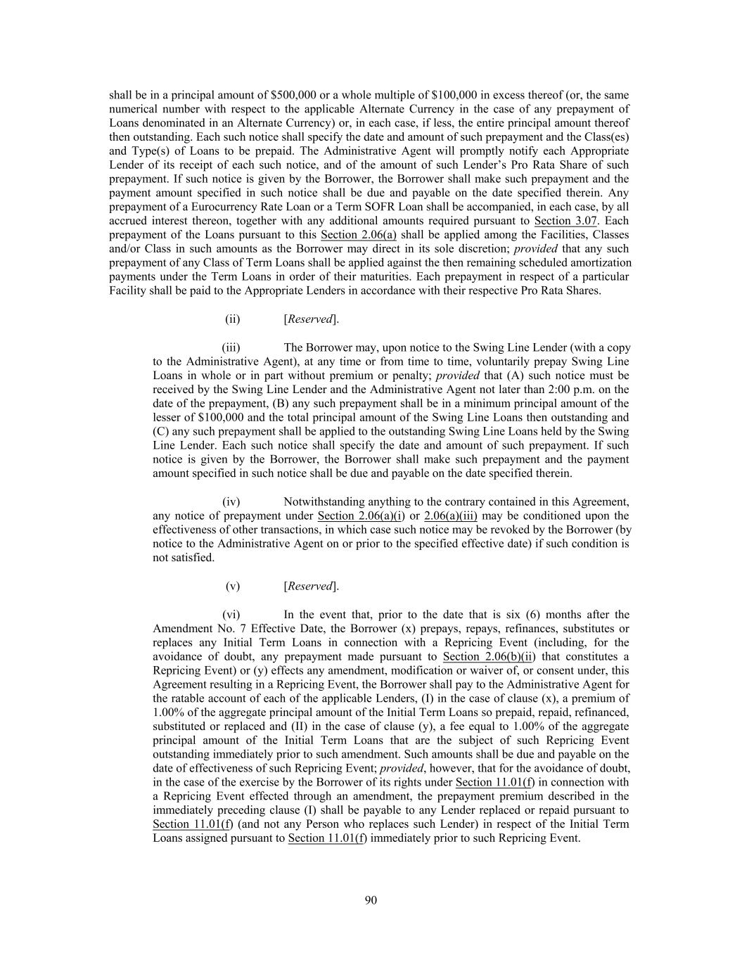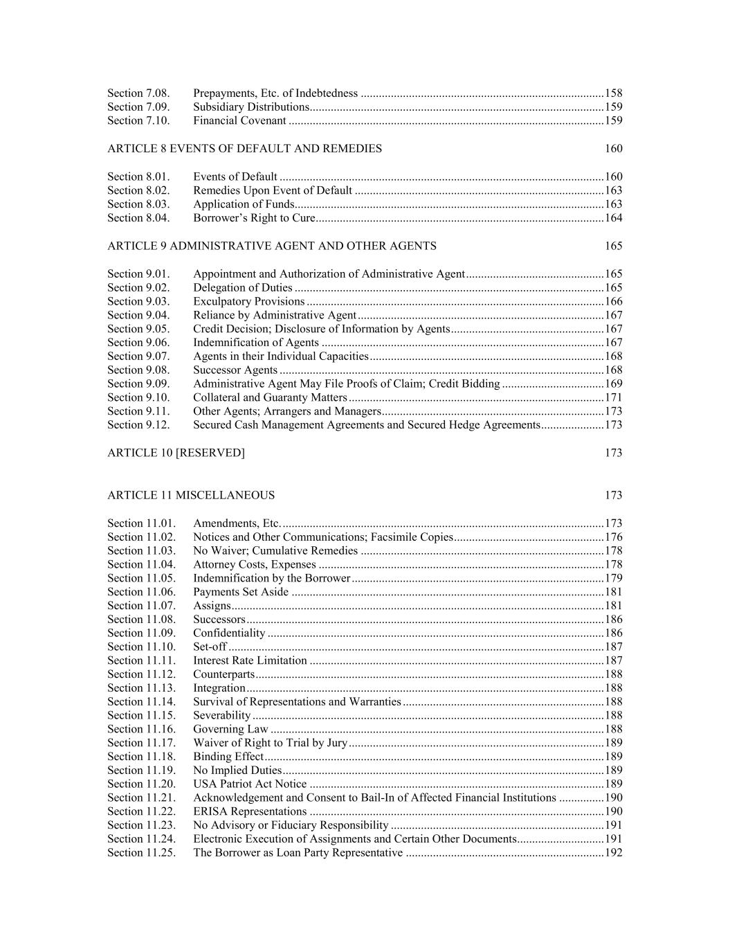 Section 7.08. Prepayments, Etc. of Indebtedness ................................................................................. 158 Section 7.09. Subsidiary Distributions.................................................................................................. 159 Section 7.10. Financial Covenant ......................................................................................................... 159 ARTICLE 8 EVENTS OF DEFAULT AND REMEDIES 160 Section 8.01. Events of Default ............................................................................................................ 160 Section 8.02. Remedies Upon Event of Default ................................................................................... 163 Section 8.03. Application of Funds....................................................................................................... 163 Section 8.04. Borrower’s Right to Cure ................................................................................................ 164 ARTICLE 9 ADMINISTRATIVE AGENT AND OTHER AGENTS 165 Section 9.01. Appointment and Authorization of Administrative Agent .............................................. 165 Section 9.02. Delegation of Duties ....................................................................................................... 165 Section 9.03. Exculpatory Provisions ................................................................................................... 166 Section 9.04. Reliance by Administrative Agent .................................................................................. 167 Section 9.05. Credit Decision; Disclosure of Information by Agents ................................................... 167 Section 9.06. Indemnification of Agents .............................................................................................. 167 Section 9.07. Agents in their Individual Capacities .............................................................................. 168 Section 9.08. Successor Agents ............................................................................................................ 168 Section 9.09. Administrative Agent May File Proofs of Claim; Credit Bidding .................................. 169 Section 9.10. Collateral and Guaranty Matters ..................................................................................... 171 Section 9.11. Other Agents; Arrangers and Managers .......................................................................... 173 Section 9.12. Secured Cash Management Agreements and Secured Hedge Agreements ..................... 173 ARTICLE 10 [RESERVED] 173 ARTICLE 11 MISCELLANEOUS 173 Section 11.01. Amendments, Etc. ........................................................................................................... 173 Section 11.02. Notices and Other Communications; Facsimile Copies .................................................. 176 Section 11.03. No Waiver; Cumulative Remedies ................................................................................. 178 Section 11.04. Attorney Costs, Expenses ............................................................................................... 178 Section 11.05. Indemnification by the Borrower .................................................................................... 179 Section 11.06. Payments Set Aside ........................................................................................................ 181 Section 11.07. Assigns ............................................................................................................................ 181 Section 11.08. Successors ....................................................................................................................... 186 Section 11.09. Confidentiality ................................................................................................................ 186 Section 11.10. Set-off ............................................................................................................................. 187 Section 11.11. Interest Rate Limitation .................................................................................................. 187 Section 11.12. Counterparts .................................................................................................................... 188 Section 11.13. Integration ....................................................................................................................... 188 Section 11.14. Survival of Representations and Warranties ................................................................... 188 Section 11.15. Severability ..................................................................................................................... 188 Section 11.16. Governing Law ............................................................................................................... 188 Section 11.17. Waiver of Right to Trial by Jury ..................................................................................... 189 Section 11.18. Binding Effect ................................................................................................................. 189 Section 11.19. No Implied Duties ........................................................................................................... 189 Section 11.20. USA Patriot Act Notice .................................................................................................. 189 Section 11.21. Acknowledgement and Consent to Bail-In of Affected Financial Institutions ............... 190 Section 11.22. ERISA Representations .................................................................................................. 190 Section 11.23. No Advisory or Fiduciary Responsibility ....................................................................... 191 Section 11.24. Electronic Execution of Assignments and Certain Oth