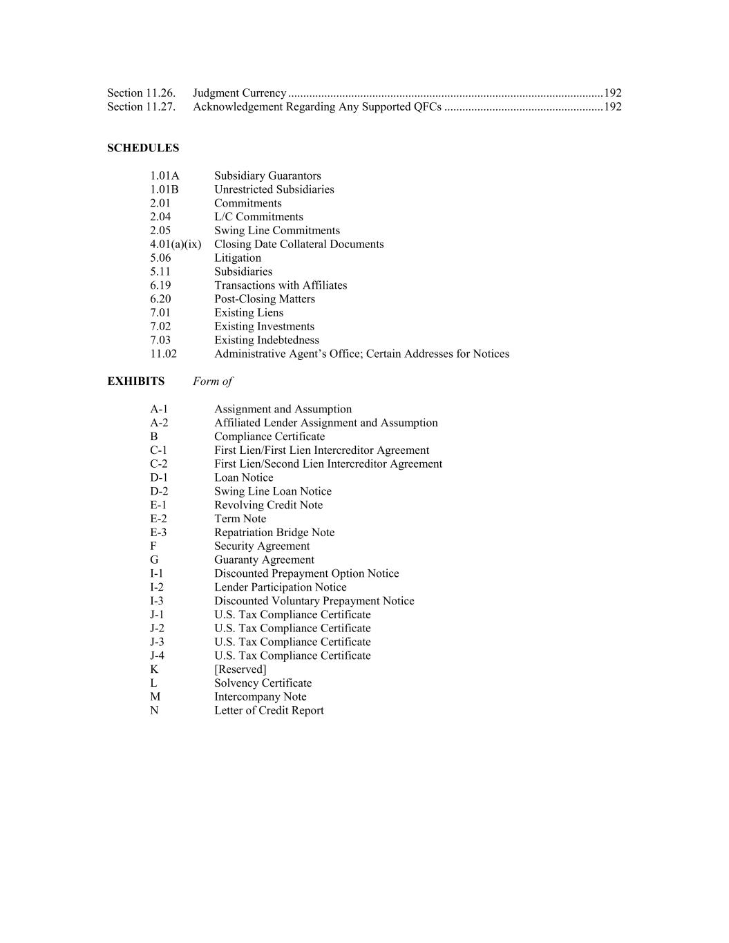 Section 11.26. Judgment Currency ......................................................................................................... 192 Section 11.27. Acknowledgement Regarding Any Supported QFCs ..................................................... 192 SCHEDULES 1.01A Subsidiary Guarantors 1.01B Unrestricted Subsidiaries 2.01 Commitments 2.04 L/C Commitments 2.05 Swing Line Commitments 4.01(a)(ix) Closing Date Collateral Documents 5.06 Litigation 5.11 Subsidiaries 6.19 Transactions with Affiliates 6.20 Post-Closing Matters 7.01 Existing Liens 7.02 Existing Investments 7.03 Existing Indebtedness 11.02 Administrative Agent’s Office; Certain Addresses for Notices EXHIBITS Form of A-1 Assignment and Assumption A-2 Affiliated Lender Assignment and Assumption B Compliance Certificate C-1 First Lien/First Lien Intercreditor Agreement C-2 First Lien/Second Lien Intercreditor Agreement D-1 Loan Notice D-2 Swing Line Loan Notice E-1 Revolving Credit Note E-2 Term Note E-3 Repatriation Bridge Note F Security Agreement G Guaranty Agreement I-1 Discounted Prepayment Option Notice I-2 Lender Participation Notice I-3 Discounted Voluntary Prepayment Notice J-1 U.S. Tax Compliance Certificate J-2 U.S. Tax Compliance Certificate J-3 U.S. Tax Compliance Certificate J-4 U.S. Tax Compliance Certificate K [Reserved] L Solvency Certificate M Intercompany Note N Letter of Credit Report