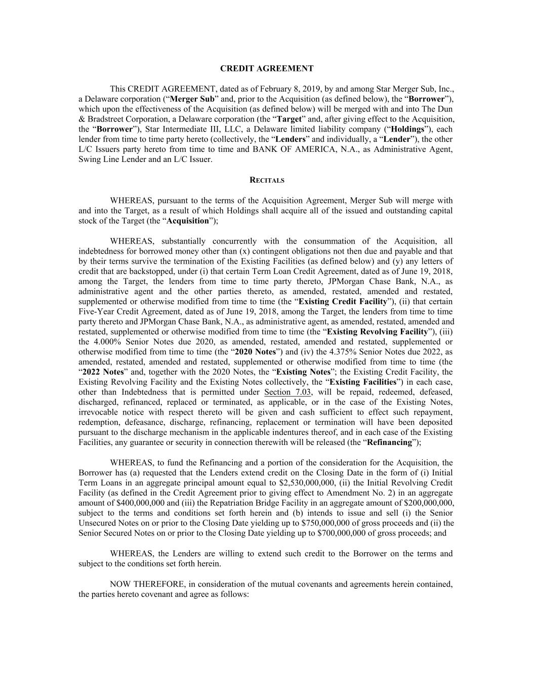 CREDIT AGREEMENT This CREDIT AGREEMENT, dated as of February 8, 2019, by and among Star Merger Sub, Inc., a Delaware corporation (“Merger Sub” and, prior to the Acquisition (as defined below), the “Borrower”), which upon the effectiveness of the Acquisition (as defined below) will be merged with and into The Dun & Bradstreet Corporation, a Delaware corporation (the “Target” and, after giving effect to the Acquisition, the “Borrower”), Star Intermediate III, LLC, a Delaware limited liability company (“Holdings”), each lender from time to time party hereto (collectively, the “Lenders” and individually, a “Lender”), the other L/C Issuers party hereto from time to time and BANK OF AMERICA, N.A., as Administrative Agent, Swing Line Lender and an L/C Issuer. RECITALS WHEREAS, pursuant to the terms of the Acquisition Agreement, Merger Sub will merge with and into the Target, as a result of which Holdings shall acquire all of the issued and outstanding capital stock of the Target (the “Acquisition”); WHEREAS, substantially concurrently with the consummation of the Acquisition, all indebtedness for borrowed money other than (x) contingent obligations not then due and payable and that by their terms survive the termination of the Existing Facilities (as defined below) and (y) any letters of credit that are backstopped, under (i) that certain Term Loan Credit Agreement, dated as of June 19, 2018, among the Target, the lenders from time to time party thereto, JPMorgan Chase Bank, N.A., as administrative agent and the other parties thereto, as amended, restated, amended and restated, supplemented or otherwise modified from time to time (the “Existing Credit Facility”), (ii) that certain Five-Year Credit Agreement, dated as of June 19, 2018, among the Target, the lenders from time to time party thereto and JPMorgan Chase Bank, N.A., as administrative agent, as amended, restated, amended and restated, supplemented or otherwise modified from time to time (the “Existing Revolving Facility”), (iii) the 4.000% Senior Notes due 2020, as amended, restated, amended and restated, supplemented or otherwise modified from time to time (the “2020 Notes”) and (iv) the 4.375% Senior Notes due 2022, as amended, restated, amended and restated, supplemented or otherwise modified from time to time (the “2022 Notes” and, together with the 2020 Notes, the “Existing Notes”; the Existing Credit Facility, the Existing Revolving Facility and the Existing Notes collectively, the “Existing Facilities”) in each case, other than Indebtedness that is permitted under Section 7.03, will be repaid, redeemed, defeased, discharged, refinanced, replaced or terminated, as applicable, or in the case of the Existing Notes, irrevocable notice with respect thereto will be given and cash sufficient to effect such repayment, redemption, defeasance, discharge, refinancing, replacement or termination will have been deposited pursuant to the discharge mechanism in the applicable indentures thereof, and in each case of the Existing Facilities, any guarantee or security in connection therewith will be released (the “Refinancing”); WHEREAS, to fund the Refinancing and a portion of the consideration for the Acquisition, the Borrower has (a) requested that the Lenders extend credit on the Closing Date in the form of (i) Initial Term Loans in an aggregate principal amount equal to $2,530,000,000, (ii) the Initial Revolving Credit Facility (as defined in the Credit Agreement prior to giving effect to Amendment No. 2) in an aggregate amount of $400,000,000 and (iii) the Repatriation Bridge Facility in an aggregate amount of $200,000,000, subject to the terms and conditions set forth herein and (b) intends to issue and sell (i) the Senior Unsecured Notes on or prior to the Closing Date yielding up to $750,000,000 of gross proceeds and (ii) the Senior Secured Notes on or prior to the Closing Date yielding up to $700,000,000 of gross proceeds; and WHEREAS, the Lenders are willing to extend such credit to the Borrower on the terms and subject to the conditions set forth herein. NOW THEREFORE, in consideration of the mutual covenants and agreements herein contained, the parties hereto covenant and agree as follows: