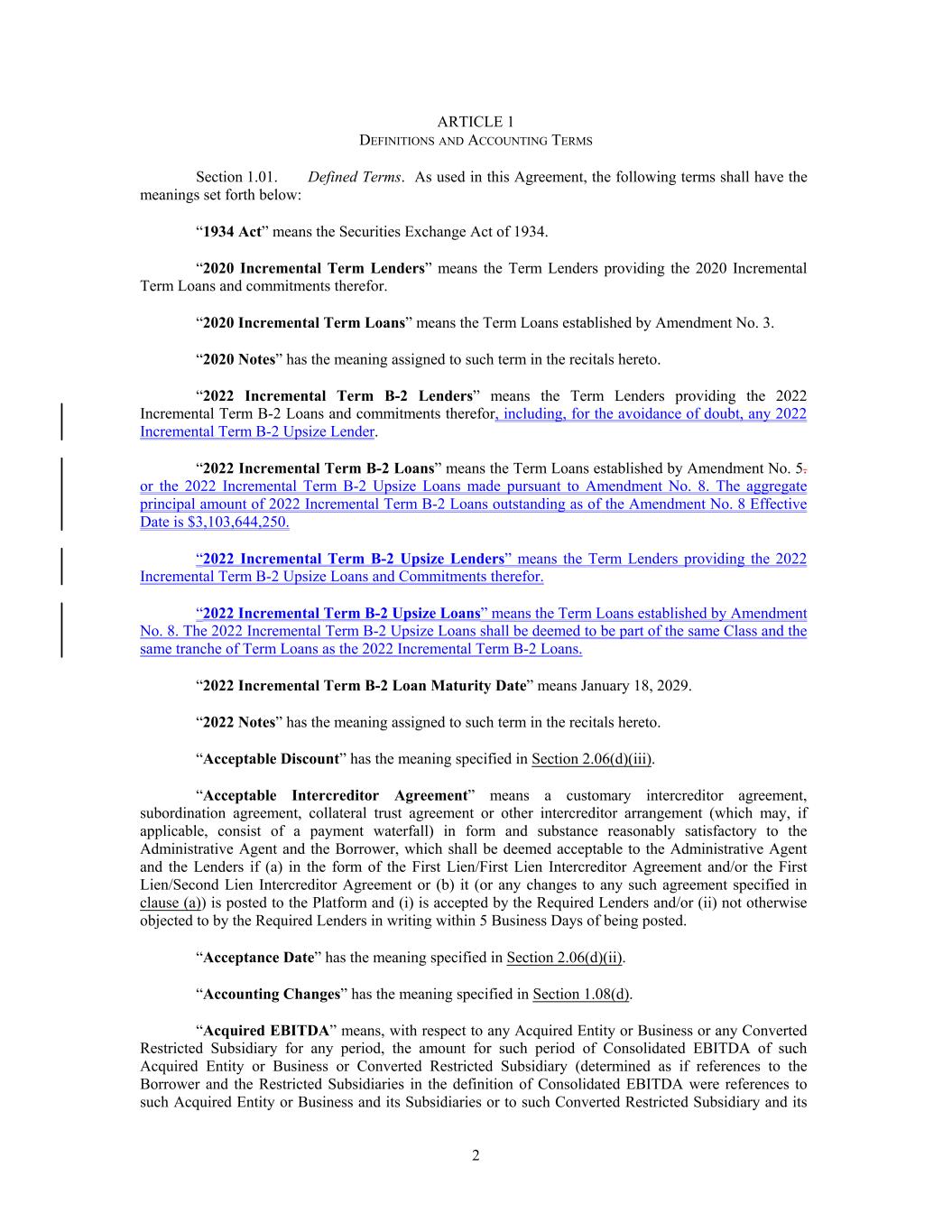 ARTICLE 1 DEFINITIONS AND ACCOUNTING TERMS Section 1.01. Defined Terms. As used in this Agreement, the following terms shall have the meanings set forth below: “1934 Act” means the Securities Exchange Act of 1934. “2020 Incremental Term Lenders” means the Term Lenders providing the 2020 Incremental Term Loans and commitments therefor. “2020 Incremental Term Loans” means the Term Loans established by Amendment No. 3. “2020 Notes” has the meaning assigned to such term in the recitals hereto. “2022 Incremental Term B-2 Lenders” means the Term Lenders providing the 2022 Incremental Term B-2 Loans and commitments therefor, including, for the avoidance of doubt, any 2022 Incremental Term B-2 Upsize Lender. “2022 Incremental Term B-2 Loans” means the Term Loans established by Amendment No. 5. or the 2022 Incremental Term B-2 Upsize Loans made pursuant to Amendment No. 8. The aggregate principal amount of 2022 Incremental Term B-2 Loans outstanding as of the Amendment No. 8 Effective Date is $3,103,644,250. “2022 Incremental Term B-2 Upsize Lenders” means the Term Lenders providing the 2022 Incremental Term B-2 Upsize Loans and Commitments therefor. “2022 Incremental Term B-2 Upsize Loans” means the Term Loans established by Amendment No. 8. The 2022 Incremental Term B-2 Upsize Loans shall be deemed to be part of the same Class and the same tranche of Term Loans as the 2022 Incremental Term B-2 Loans. “2022 Incremental Term B-2 Loan Maturity Date” means January 18, 2029. “2022 Notes” has the meaning assigned to such term in the recitals hereto. “Acceptable Discount” has the meaning specified in Section 2.06(d)(iii). “Acceptable Intercreditor Agreement” means a customary intercreditor agreement, subordination agreement, collateral trust agreement or other intercreditor arrangement (which may, if applicable, consist of a payment waterfall) in form and substance reasonably satisfactory to the Administrative Agent and the Borrower, which shall be deemed acceptable to the Administrative Agent and the Lenders if (a) in the form of the First Lien/First Lien Intercreditor Agreement and/or the First Lien/Second Lien Intercreditor Agreement or (b) it (or any changes to any such agreement specified in clause (a)) is posted to the Platform and (i) is accepted by the Required Lenders and/or (ii) not otherwise objected to by the Required Lenders in writing within 5 Business Days of being posted. “Acceptance Date” has the meaning specified in Section 2.06(d)(ii). “Accounting Changes” has the meaning specified in Section 1.08(d). “Acquired EBITDA” means, with respect to any Acquired Entity or Business or any Converted Restricted Subsidiary for any period, the amount for such period of Consolidated EBITDA of such Acquired Entity or Business or Converted Restricted Subsidiary (determined as if references to the Borrower and the Restricted Subsidiaries in the definition of Consolidated EBITDA were references to such Acquired Entity or Business and its Subsidiaries or to such Converted Restricted Subsidiary and its 2