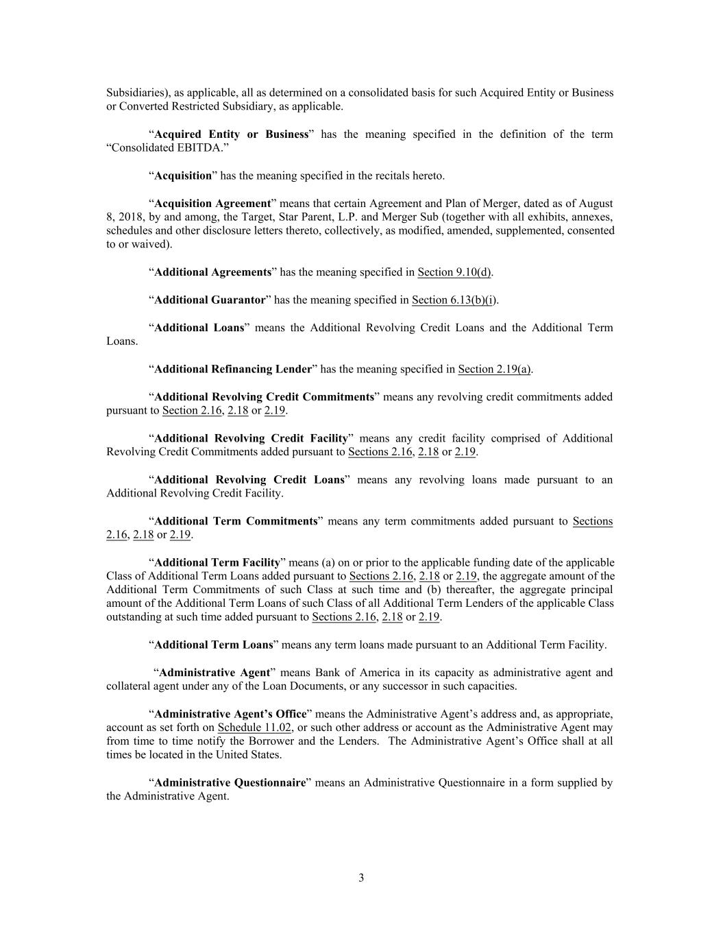 Subsidiaries), as applicable, all as determined on a consolidated basis for such Acquired Entity or Business or Converted Restricted Subsidiary, as applicable. “Acquired Entity or Business” has the meaning specified in the definition of the term “Consolidated EBITDA.” “Acquisition” has the meaning specified in the recitals hereto. “Acquisition Agreement” means that certain Agreement and Plan of Merger, dated as of August 8, 2018, by and among, the Target, Star Parent, L.P. and Merger Sub (together with all exhibits, annexes, schedules and other disclosure letters thereto, collectively, as modified, amended, supplemented, consented to or waived). “Additional Agreements” has the meaning specified in Section 9.10(d). “Additional Guarantor” has the meaning specified in Section 6.13(b)(i). “Additional Loans” means the Additional Revolving Credit Loans and the Additional Term Loans. “Additional Refinancing Lender” has the meaning specified in Section 2.19(a). “Additional Revolving Credit Commitments” means any revolving credit commitments added pursuant to Section 2.16, 2.18 or 2.19. “Additional Revolving Credit Facility” means any credit facility comprised of Additional Revolving Credit Commitments added pursuant to Sections 2.16, 2.18 or 2.19. “Additional Revolving Credit Loans” means any revolving loans made pursuant to an Additional Revolving Credit Facility. “Additional Term Commitments” means any term commitments added pursuant to Sections 2.16, 2.18 or 2.19. “Additional Term Facility” means (a) on or prior to the applicable funding date of the applicable Class of Additional Term Loans added pursuant to Sections 2.16, 2.18 or 2.19, the aggregate amount of the Additional Term Commitments of such Class at such time and (b) thereafter, the aggregate principal amount of the Additional Term Loans of such Class of all Additional Term Lenders of the applicable Class outstanding at such time added pursuant to Sections 2.16, 2.18 or 2.19. “Additional Term Loans” means any term loans made pursuant to an Additional Term Facility. “Administrative Agent” means Bank of America in its capacity as administrative agent and collateral agent under any of the Loan Documents, or any successor in such capacities. “Administrative Agent’s Office” means the Administrative Agent’s address and, as appropriate, account as set forth on Schedule 11.02, or such other address or account as the Administrative Agent may from time to time notify the Borrower and the Lenders. The Administrative Agent’s Office shall at all times be located in the United States. “Administrative Questionnaire” means an Administrative Questionnaire in a form supplied by the Administrative Agent. 3