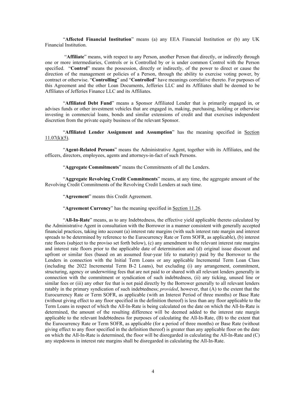 “Affected Financial Institution” means (a) any EEA Financial Institution or (b) any UK Financial Institution. “Affiliate” means, with respect to any Person, another Person that directly, or indirectly through one or more intermediaries, Controls or is Controlled by or is under common Control with the Person specified. “Control” means the possession, directly or indirectly, of the power to direct or cause the direction of the management or policies of a Person, through the ability to exercise voting power, by contract or otherwise. “Controlling” and “Controlled” have meanings correlative thereto. For purposes of this Agreement and the other Loan Documents, Jefferies LLC and its Affiliates shall be deemed to be Affiliates of Jefferies Finance LLC and its Affiliates. “Affiliated Debt Fund” means a Sponsor Affiliated Lender that is primarily engaged in, or advises funds or other investment vehicles that are engaged in, making, purchasing, holding or otherwise investing in commercial loans, bonds and similar extensions of credit and that exercises independent discretion from the private equity business of the relevant Sponsor. “Affiliated Lender Assignment and Assumption” has the meaning specified in Section 11.07(k)(5). “Agent-Related Persons” means the Administrative Agent, together with its Affiliates, and the officers, directors, employees, agents and attorneys-in-fact of such Persons. “Aggregate Commitments” means the Commitments of all the Lenders. “Aggregate Revolving Credit Commitments” means, at any time, the aggregate amount of the Revolving Credit Commitments of the Revolving Credit Lenders at such time. “Agreement” means this Credit Agreement. “Agreement Currency” has the meaning specified in Section 11.26. “All-In-Rate” means, as to any Indebtedness, the effective yield applicable thereto calculated by the Administrative Agent in consultation with the Borrower in a manner consistent with generally accepted financial practices, taking into account (a) interest rate margins (with such interest rate margin and interest spreads to be determined by reference to the Eurocurrency Rate or Term SOFR, as applicable), (b) interest rate floors (subject to the proviso set forth below), (c) any amendment to the relevant interest rate margins and interest rate floors prior to the applicable date of determination and (d) original issue discount and upfront or similar fees (based on an assumed four-year life to maturity) paid by the Borrower to the Lenders in connection with the Initial Term Loans or any applicable Incremental Term Loan Class (including the 2022 Incremental Term B-2 Loans), but excluding (i) any arrangement, commitment, structuring, agency or underwriting fees that are not paid to or shared with all relevant lenders generally in connection with the commitment or syndication of such indebtedness, (ii) any ticking, unused line or similar fees or (iii) any other fee that is not paid directly by the Borrower generally to all relevant lenders ratably in the primary syndication of such indebtedness; provided, however, that (A) to the extent that the Eurocurrency Rate or Term SOFR, as applicable (with an Interest Period of three months) or Base Rate (without giving effect to any floor specified in the definition thereof) is less than any floor applicable to the Term Loans in respect of which the All-In-Rate is being calculated on the date on which the All-In-Rate is determined, the amount of the resulting difference will be deemed added to the interest rate margin applicable to the relevant Indebtedness for purposes of calculating the All-In-Rate, (B) to the extent that the Eurocurrency Rate or Term SOFR, as applicable (for a period of three months) or Base Rate (without giving effect to any floor specified in the definition thereof) is greater than any applicable floor on the date on which the All-In-Rate is determined, the floor will be disregarded in calculating the All-In-Rate and (C) any stepdowns in interest rate margins shall be disregarded in calculating the All-In-Rate. 4