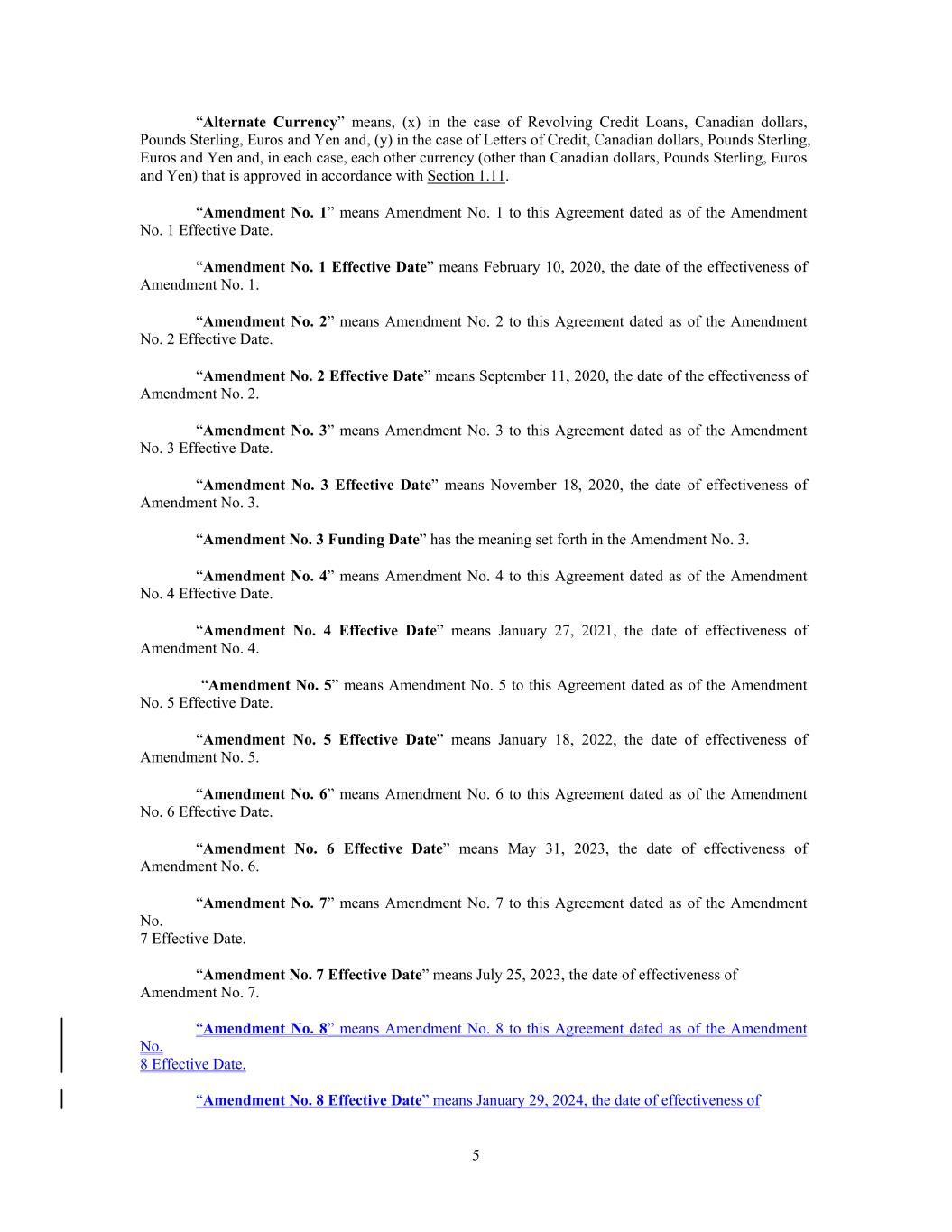 “Alternate Currency” means, (x) in the case of Revolving Credit Loans, Canadian dollars, Pounds Sterling, Euros and Yen and, (y) in the case of Letters of Credit, Canadian dollars, Pounds Sterling, Euros and Yen and, in each case, each other currency (other than Canadian dollars, Pounds Sterling, Euros and Yen) that is approved in accordance with Section 1.11. “Amendment No. 1” means Amendment No. 1 to this Agreement dated as of the Amendment No. 1 Effective Date. “Amendment No. 1 Effective Date” means February 10, 2020, the date of the effectiveness of Amendment No. 1. “Amendment No. 2” means Amendment No. 2 to this Agreement dated as of the Amendment No. 2 Effective Date. “Amendment No. 2 Effective Date” means September 11, 2020, the date of the effectiveness of Amendment No. 2. “Amendment No. 3” means Amendment No. 3 to this Agreement dated as of the Amendment No. 3 Effective Date. “Amendment No. 3 Effective Date” means November 18, 2020, the date of effectiveness of Amendment No. 3. “Amendment No. 3 Funding Date” has the meaning set forth in the Amendment No. 3. “Amendment No. 4” means Amendment No. 4 to this Agreement dated as of the Amendment No. 4 Effective Date. “Amendment No. 4 Effective Date” means January 27, 2021, the date of effectiveness of Amendment No. 4. “Amendment No. 5” means Amendment No. 5 to this Agreement dated as of the Amendment No. 5 Effective Date. “Amendment No. 5 Effective Date” means January 18, 2022, the date of effectiveness of Amendment No. 5. “Amendment No. 6” means Amendment No. 6 to this Agreement dated as of the Amendment No. 6 Effective Date. “Amendment No. 6 Effective Date” means May 31, 2023, the date of effectiveness of Amendment No. 6. “Amendment No. 7” means Amendment No. 7 to this Agreement dated as of the Amendment No. 7 Effective Date. “Amendment No. 7 Effective Date” means July 25, 2023, the date of effectiveness of Amendment No. 7. “Amendment No. 8” means Amendment No. 8 to this Agreement dated as of the Amendment No. 8 Effective Date. “Amendment No. 8 Effective Date” means January 29, 2024, the date of effectiveness of 5