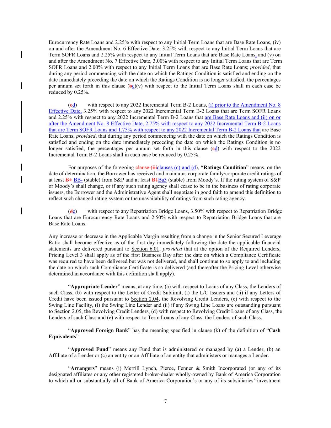 Eurocurrency Rate Loans and 2.25% with respect to any Initial Term Loans that are Base Rate Loans, (iv) on and after the Amendment No. 6 Effective Date, 3.25% with respect to any Initial Term Loans that are Term SOFR Loans and 2.25% with respect to any Initial Term Loans that are Base Rate Loans, and (v) on and after the Amendment No. 7 Effective Date, 3.00% with respect to any Initial Term Loans that are Term SOFR Loans and 2.00% with respect to any Initial Term Loans that are Base Rate Loans; provided, that during any period commencing with the date on which the Ratings Condition is satisfied and ending on the date immediately preceding the date on which the Ratings Condition is no longer satisfied, the percentages per annum set forth in this clause (bc)(v) with respect to the Initial Term Loans shall in each case be reduced by 0.25%. (cd) with respect to any 2022 Incremental Term B-2 Loans, (i) prior to the Amendment No. 8 Effective Date, 3.25% with respect to any 2022 Incremental Term B-2 Loans that are Term SOFR Loans and 2.25% with respect to any 2022 Incremental Term B-2 Loans that are Base Rate Loans and (ii) on or after the Amendment No. 8 Effective Date, 2.75% with respect to any 2022 Incremental Term B-2 Loans that are Term SOFR Loans and 1.75% with respect to any 2022 Incremental Term B-2 Loans that are Base Rate Loans; provided, that during any period commencing with the date on which the Ratings Condition is satisfied and ending on the date immediately preceding the date on which the Ratings Condition is no longer satisfied, the percentages per annum set forth in this clause (cd) with respect to the 2022 Incremental Term B-2 Loans shall in each case be reduced by 0.25%. For purposes of the foregoing clause (iiiclauses (c) and (d), “Ratings Condition” means, on the date of determination, the Borrower has received and maintains corporate family/corporate credit ratings of at least B+ BB- (stable) from S&P and at least B1Ba3 (stable) from Moody’s. If the rating system of S&P or Moody’s shall change, or if any such rating agency shall cease to be in the business of rating corporate issuers, the Borrower and the Administrative Agent shall negotiate in good faith to amend this definition to reflect such changed rating system or the unavailability of ratings from such rating agency. (de) with respect to any Repatriation Bridge Loans, 3.50% with respect to Repatriation Bridge Loans that are Eurocurrency Rate Loans and 2.50% with respect to Repatriation Bridge Loans that are Base Rate Loans. Any increase or decrease in the Applicable Margin resulting from a change in the Senior Secured Leverage Ratio shall become effective as of the first day immediately following the date the applicable financial statements are delivered pursuant to Section 6.01; provided that at the option of the Required Lenders, Pricing Level 3 shall apply as of the first Business Day after the date on which a Compliance Certificate was required to have been delivered but was not delivered, and shall continue to so apply to and including the date on which such Compliance Certificate is so delivered (and thereafter the Pricing Level otherwise determined in accordance with this definition shall apply). “Appropriate Lender” means, at any time, (a) with respect to Loans of any Class, the Lenders of such Class, (b) with respect to the Letter of Credit Sublimit, (i) the L/C Issuers and (ii) if any Letters of Credit have been issued pursuant to Section 2.04, the Revolving Credit Lenders, (c) with respect to the Swing Line Facility, (i) the Swing Line Lender and (ii) if any Swing Line Loans are outstanding pursuant to Section 2.05, the Revolving Credit Lenders, (d) with respect to Revolving Credit Loans of any Class, the Lenders of such Class and (e) with respect to Term Loans of any Class, the Lenders of such Class. “Approved Foreign Bank” has the meaning specified in clause (k) of the definition of “Cash Equivalents”. “Approved Fund” means any Fund that is administered or managed by (a) a Lender, (b) an Affiliate of a Lender or (c) an entity or an Affiliate of an entity that administers or manages a Lender. “Arrangers” means (i) Merrill Lynch, Pierce, Fenner & Smith Incorporated (or any of its designated affiliates or any other registered broker-dealer wholly-owned by Bank of America Corporation to which all or substantially all of Bank of America Corporation’s or any of its subsidiaries’ investment 7