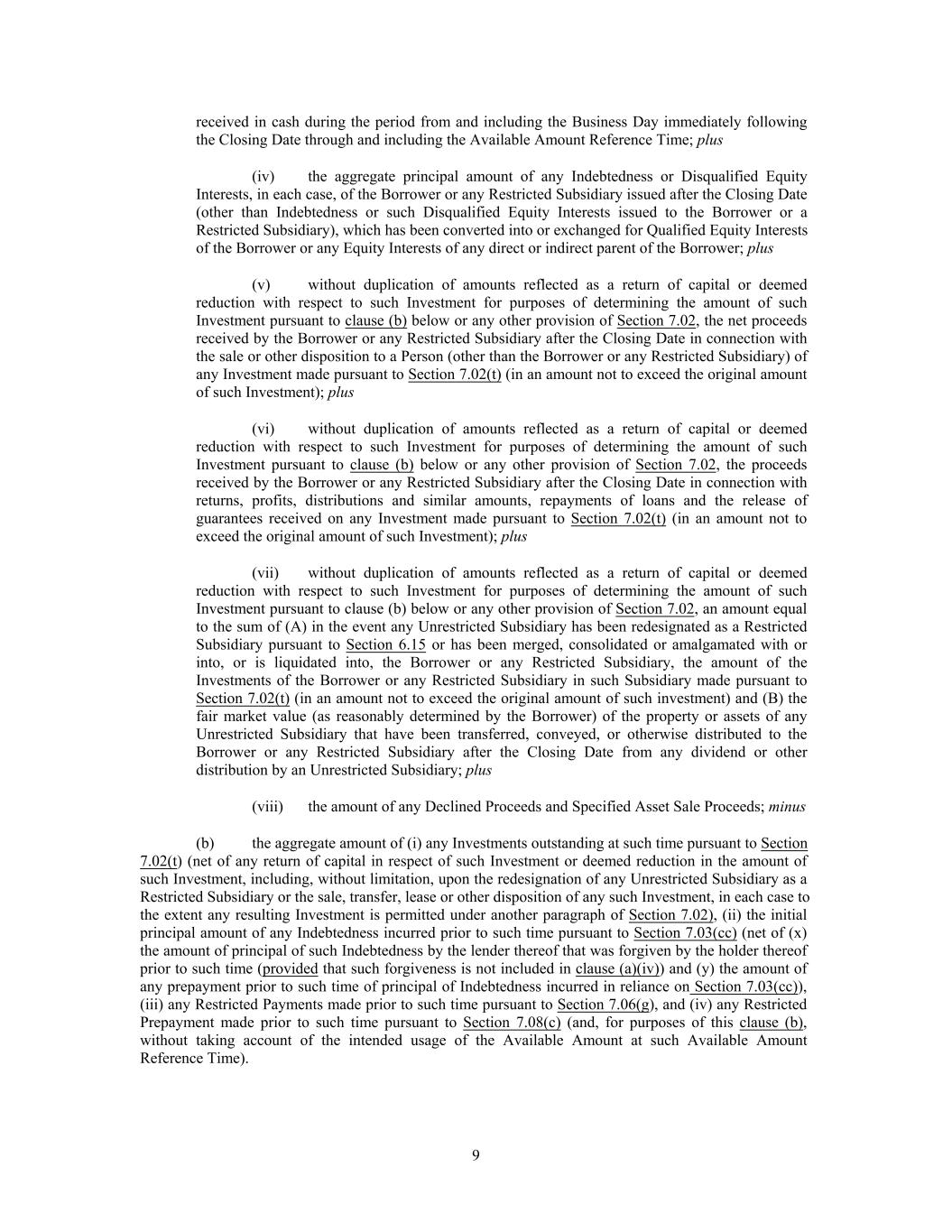 received in cash during the period from and including the Business Day immediately following the Closing Date through and including the Available Amount Reference Time; plus (iv) the aggregate principal amount of any Indebtedness or Disqualified Equity Interests, in each case, of the Borrower or any Restricted Subsidiary issued after the Closing Date (other than Indebtedness or such Disqualified Equity Interests issued to the Borrower or a Restricted Subsidiary), which has been converted into or exchanged for Qualified Equity Interests of the Borrower or any Equity Interests of any direct or indirect parent of the Borrower; plus (v) without duplication of amounts reflected as a return of capital or deemed reduction with respect to such Investment for purposes of determining the amount of such Investment pursuant to clause (b) below or any other provision of Section 7.02, the net proceeds received by the Borrower or any Restricted Subsidiary after the Closing Date in connection with the sale or other disposition to a Person (other than the Borrower or any Restricted Subsidiary) of any Investment made pursuant to Section 7.02(t) (in an amount not to exceed the original amount of such Investment); plus (vi) without duplication of amounts reflected as a return of capital or deemed reduction with respect to such Investment for purposes of determining the amount of such Investment pursuant to clause (b) below or any other provision of Section 7.02, the proceeds received by the Borrower or any Restricted Subsidiary after the Closing Date in connection with returns, profits, distributions and similar amounts, repayments of loans and the release of guarantees received on any Investment made pursuant to Section 7.02(t) (in an amount not to exceed the original amount of such Investment); plus (vii) without duplication of amounts reflected as a return of capital or deemed reduction with respect to such Investment for purposes of determining the amount of such Investment pursuant to clause (b) below or any other provision of Section 7.02, an amount equal to the sum of (A) in the event any Unrestricted Subsidiary has been redesignated as a Restricted Subsidiary pursuant to Section 6.15 or has been merged, consolidated or amalgamated with or into, or is liquidated into, the Borrower or any Restricted Subsidiary, the amount of the Investments of the Borrower or any Restricted Subsidiary in such Subsidiary made pursuant to Section 7.02(t) (in an amount not to exceed the original amount of such investment) and (B) the fair market value (as reasonably determined by the Borrower) of the property or assets of any Unrestricted Subsidiary that have been transferred, conveyed, or otherwise distributed to the Borrower or any Restricted Subsidiary after the Closing Date from any dividend or other distribution by an Unrestricted Subsidiary; plus (viii) the amount of any Declined Proceeds and Specified Asset Sale Proceeds; minus (b) the aggregate amount of (i) any Investments outstanding at such time pursuant to Section 7.02(t) (net of any return of capital in respect of such Investment or deemed reduction in the amount of such Investment, including, without limitation, upon the redesignation of any Unrestricted Subsidiary as a Restricted Subsidiary or the sale, transfer, lease or other disposition of any such Investment, in each case to the extent any resulting Investment is permitted under another paragraph of Section 7.02), (ii) the initial principal amount of any Indebtedness incurred prior to such time pursuant to Section 7.03(cc) (net of (x) the amount of principal of such Indebtedness by the lender thereof that was forgiven by the holder thereof prior to such time (provided that such forgiveness is not included in clause (a)(iv)) and (y) the amount of any prepayment prior to such time of principal of Indebtedness incurred in reliance on Section 7.03(cc)), (iii) any Restricted Payments made prior to such time pursuant to Section 7.06(g), and (iv) any Restricted Prepayment made prior to such time pursuant to Section 7.08(c) (and, for purposes of this clause (b), without taking account of the intended usage of the Available Amount at such Available Amount Reference Time). 9