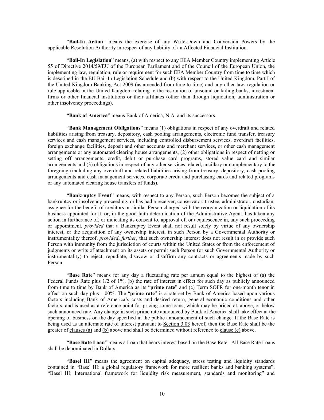 “Bail-In Action” means the exercise of any Write-Down and Conversion Powers by the applicable Resolution Authority in respect of any liability of an Affected Financial Institution. “Bail-In Legislation” means, (a) with respect to any EEA Member Country implementing Article 55 of Directive 2014/59/EU of the European Parliament and of the Council of the European Union, the implementing law, regulation, rule or requirement for such EEA Member Country from time to time which is described in the EU Bail-In Legislation Schedule and (b) with respect to the United Kingdom, Part I of the United Kingdom Banking Act 2009 (as amended from time to time) and any other law, regulation or rule applicable in the United Kingdom relating to the resolution of unsound or failing banks, investment firms or other financial institutions or their affiliates (other than through liquidation, administration or other insolvency proceedings). “Bank of America” means Bank of America, N.A. and its successors. “Bank Management Obligations” means (1) obligations in respect of any overdraft and related liabilities arising from treasury, depository, cash pooling arrangements, electronic fund transfer, treasury services and cash management services, including controlled disbursement services, overdraft facilities, foreign exchange facilities, deposit and other accounts and merchant services, or other cash management arrangements or any automated clearing house arrangements, (2) other obligations in respect of netting or setting off arrangements, credit, debit or purchase card programs, stored value card and similar arrangements and (3) obligations in respect of any other services related, ancillary or complementary to the foregoing (including any overdraft and related liabilities arising from treasury, depository, cash pooling arrangements and cash management services, corporate credit and purchasing cards and related programs or any automated clearing house transfers of funds). “Bankruptcy Event” means, with respect to any Person, such Person becomes the subject of a bankruptcy or insolvency proceeding, or has had a receiver, conservator, trustee, administrator, custodian, assignee for the benefit of creditors or similar Person charged with the reorganization or liquidation of its business appointed for it, or, in the good faith determination of the Administrative Agent, has taken any action in furtherance of, or indicating its consent to, approval of, or acquiescence in, any such proceeding or appointment, provided that a Bankruptcy Event shall not result solely by virtue of any ownership interest, or the acquisition of any ownership interest, in such Person by a Governmental Authority or instrumentality thereof, provided, further, that such ownership interest does not result in or provide such Person with immunity from the jurisdiction of courts within the United States or from the enforcement of judgments or writs of attachment on its assets or permit such Person (or such Governmental Authority or instrumentality) to reject, repudiate, disavow or disaffirm any contracts or agreements made by such Person. “Base Rate” means for any day a fluctuating rate per annum equal to the highest of (a) the Federal Funds Rate plus 1/2 of 1%, (b) the rate of interest in effect for such day as publicly announced from time to time by Bank of America as its “prime rate” and (c) Term SOFR for one-month tenor in effect on such day plus 1.00%. The “prime rate” is a rate set by Bank of America based upon various factors including Bank of America’s costs and desired return, general economic conditions and other factors, and is used as a reference point for pricing some loans, which may be priced at, above, or below such announced rate. Any change in such prime rate announced by Bank of America shall take effect at the opening of business on the day specified in the public announcement of such change. If the Base Rate is being used as an alternate rate of interest pursuant to Section 3.03 hereof, then the Base Rate shall be the greater of clauses (a) and (b) above and shall be determined without reference to clause (c) above. “Base Rate Loan” means a Loan that bears interest based on the Base Rate. All Base Rate Loans shall be denominated in Dollars. “Basel III” means the agreement on capital adequacy, stress testing and liquidity standards contained in “Basel III: a global regulatory framework for more resilient banks and banking systems”, “Basel III: International framework for liquidity risk measurement, standards and monitoring” and 10