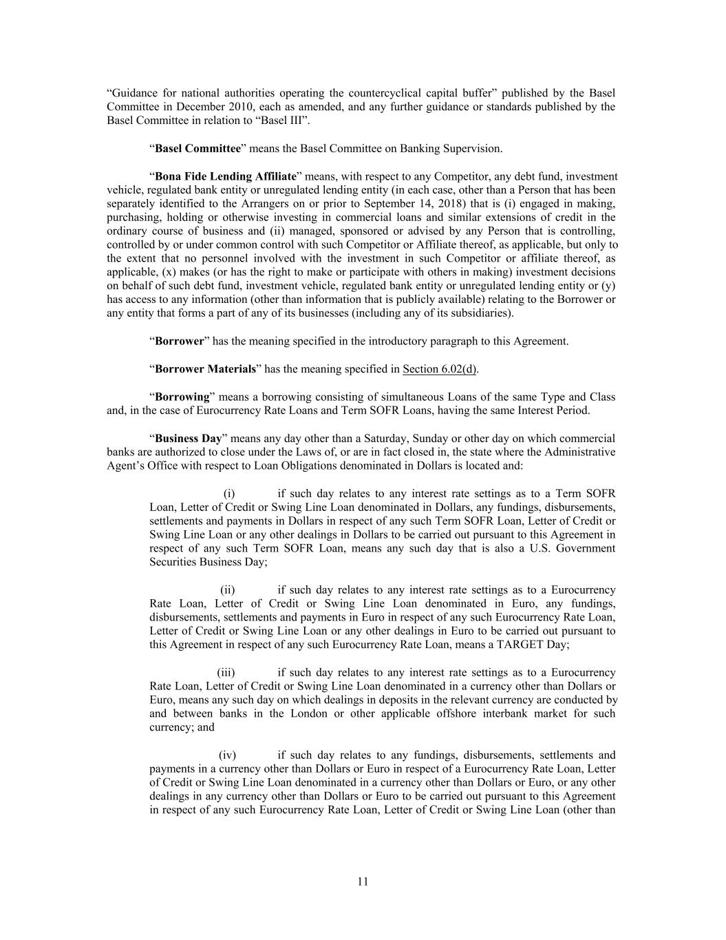 “Guidance for national authorities operating the countercyclical capital buffer” published by the Basel Committee in December 2010, each as amended, and any further guidance or standards published by the Basel Committee in relation to “Basel III”. “Basel Committee” means the Basel Committee on Banking Supervision. “Bona Fide Lending Affiliate” means, with respect to any Competitor, any debt fund, investment vehicle, regulated bank entity or unregulated lending entity (in each case, other than a Person that has been separately identified to the Arrangers on or prior to September 14, 2018) that is (i) engaged in making, purchasing, holding or otherwise investing in commercial loans and similar extensions of credit in the ordinary course of business and (ii) managed, sponsored or advised by any Person that is controlling, controlled by or under common control with such Competitor or Affiliate thereof, as applicable, but only to the extent that no personnel involved with the investment in such Competitor or affiliate thereof, as applicable, (x) makes (or has the right to make or participate with others in making) investment decisions on behalf of such debt fund, investment vehicle, regulated bank entity or unregulated lending entity or (y) has access to any information (other than information that is publicly available) relating to the Borrower or any entity that forms a part of any of its businesses (including any of its subsidiaries). “Borrower” has the meaning specified in the introductory paragraph to this Agreement. “Borrower Materials” has the meaning specified in Section 6.02(d). “Borrowing” means a borrowing consisting of simultaneous Loans of the same Type and Class and, in the case of Eurocurrency Rate Loans and Term SOFR Loans, having the same Interest Period. “Business Day” means any day other than a Saturday, Sunday or other day on which commercial banks are authorized to close under the Laws of, or are in fact closed in, the state where the Administrative Agent’s Office with respect to Loan Obligations denominated in Dollars is located and: (i) if such day relates to any interest rate settings as to a Term SOFR Loan, Letter of Credit or Swing Line Loan denominated in Dollars, any fundings, disbursements, settlements and payments in Dollars in respect of any such Term SOFR Loan, Letter of Credit or Swing Line Loan or any other dealings in Dollars to be carried out pursuant to this Agreement in respect of any such Term SOFR Loan, means any such day that is also a U.S. Government Securities Business Day; (ii) if such day relates to any interest rate settings as to a Eurocurrency Rate Loan, Letter of Credit or Swing Line Loan denominated in Euro, any fundings, disbursements, settlements and payments in Euro in respect of any such Eurocurrency Rate Loan, Letter of Credit or Swing Line Loan or any other dealings in Euro to be carried out pursuant to this Agreement in respect of any such Eurocurrency Rate Loan, means a TARGET Day; (iii) if such day relates to any interest rate settings as to a Eurocurrency Rate Loan, Letter of Credit or Swing Line Loan denominated in a currency other than Dollars or Euro, means any such day on which dealings in deposits in the relevant currency are conducted by and between banks in the London or other applicable offshore interbank market for such currency; and (iv) if such day relates to any fundings, disbursements, settlements and payments in a currency other than Dollars or Euro in respect of a Eurocurrency Rate Loan, Letter of Credit or Swing Line Loan denominated in a currency other than Dollars or Euro, or any other dealings in any currency other than Dollars or Euro to be carried out pursuant to this Agreement in respect of any such Eurocurrency Rate Loan, Letter of Credit or Swing Line Loan (other than 11