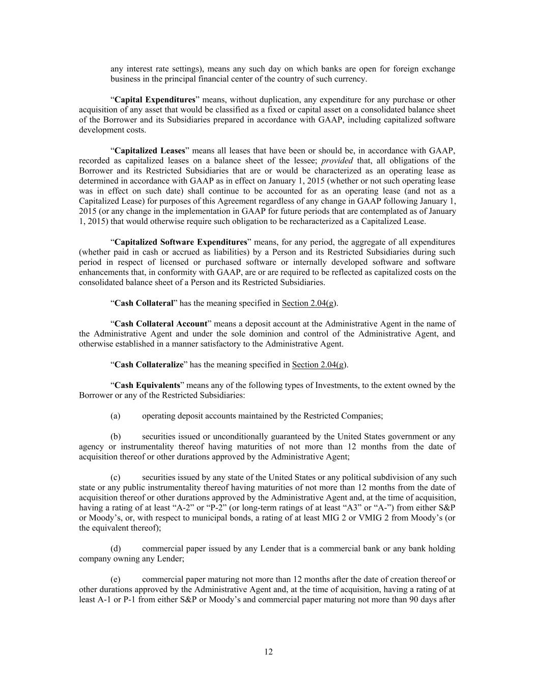 any interest rate settings), means any such day on which banks are open for foreign exchange business in the principal financial center of the country of such currency. “Capital Expenditures” means, without duplication, any expenditure for any purchase or other acquisition of any asset that would be classified as a fixed or capital asset on a consolidated balance sheet of the Borrower and its Subsidiaries prepared in accordance with GAAP, including capitalized software development costs. “Capitalized Leases” means all leases that have been or should be, in accordance with GAAP, recorded as capitalized leases on a balance sheet of the lessee; provided that, all obligations of the Borrower and its Restricted Subsidiaries that are or would be characterized as an operating lease as determined in accordance with GAAP as in effect on January 1, 2015 (whether or not such operating lease was in effect on such date) shall continue to be accounted for as an operating lease (and not as a Capitalized Lease) for purposes of this Agreement regardless of any change in GAAP following January 1, 2015 (or any change in the implementation in GAAP for future periods that are contemplated as of January 1, 2015) that would otherwise require such obligation to be recharacterized as a Capitalized Lease. “Capitalized Software Expenditures” means, for any period, the aggregate of all expenditures (whether paid in cash or accrued as liabilities) by a Person and its Restricted Subsidiaries during such period in respect of licensed or purchased software or internally developed software and software enhancements that, in conformity with GAAP, are or are required to be reflected as capitalized costs on the consolidated balance sheet of a Person and its Restricted Subsidiaries. “Cash Collateral” has the meaning specified in Section 2.04(g). “Cash Collateral Account” means a deposit account at the Administrative Agent in the name of the Administrative Agent and under the sole dominion and control of the Administrative Agent, and otherwise established in a manner satisfactory to the Administrative Agent. “Cash Collateralize” has the meaning specified in Section 2.04(g). “Cash Equivalents” means any of the following types of Investments, to the extent owned by the Borrower or any of the Restricted Subsidiaries: (a) operating deposit accounts maintained by the Restricted Companies; (b) securities issued or unconditionally guaranteed by the United States government or any agency or instrumentality thereof having maturities of not more than 12 months from the date of acquisition thereof or other durations approved by the Administrative Agent; (c) securities issued by any state of the United States or any political subdivision of any such state or any public instrumentality thereof having maturities of not more than 12 months from the date of acquisition thereof or other durations approved by the Administrative Agent and, at the time of acquisition, having a rating of at least “A-2” or “P-2” (or long-term ratings of at least “A3” or “A-”) from either S&P or Moody’s, or, with respect to municipal bonds, a rating of at least MIG 2 or VMIG 2 from Moody’s (or the equivalent thereof); (d) commercial paper issued by any Lender that is a commercial bank or any bank holding company owning any Lender; (e) commercial paper maturing not more than 12 months after the date of creation thereof or other durations approved by the Administrative Agent and, at the time of acquisition, having a rating of at least A-1 or P-1 from either S&P or Moody’s and commercial paper maturing not more than 90 days after 12