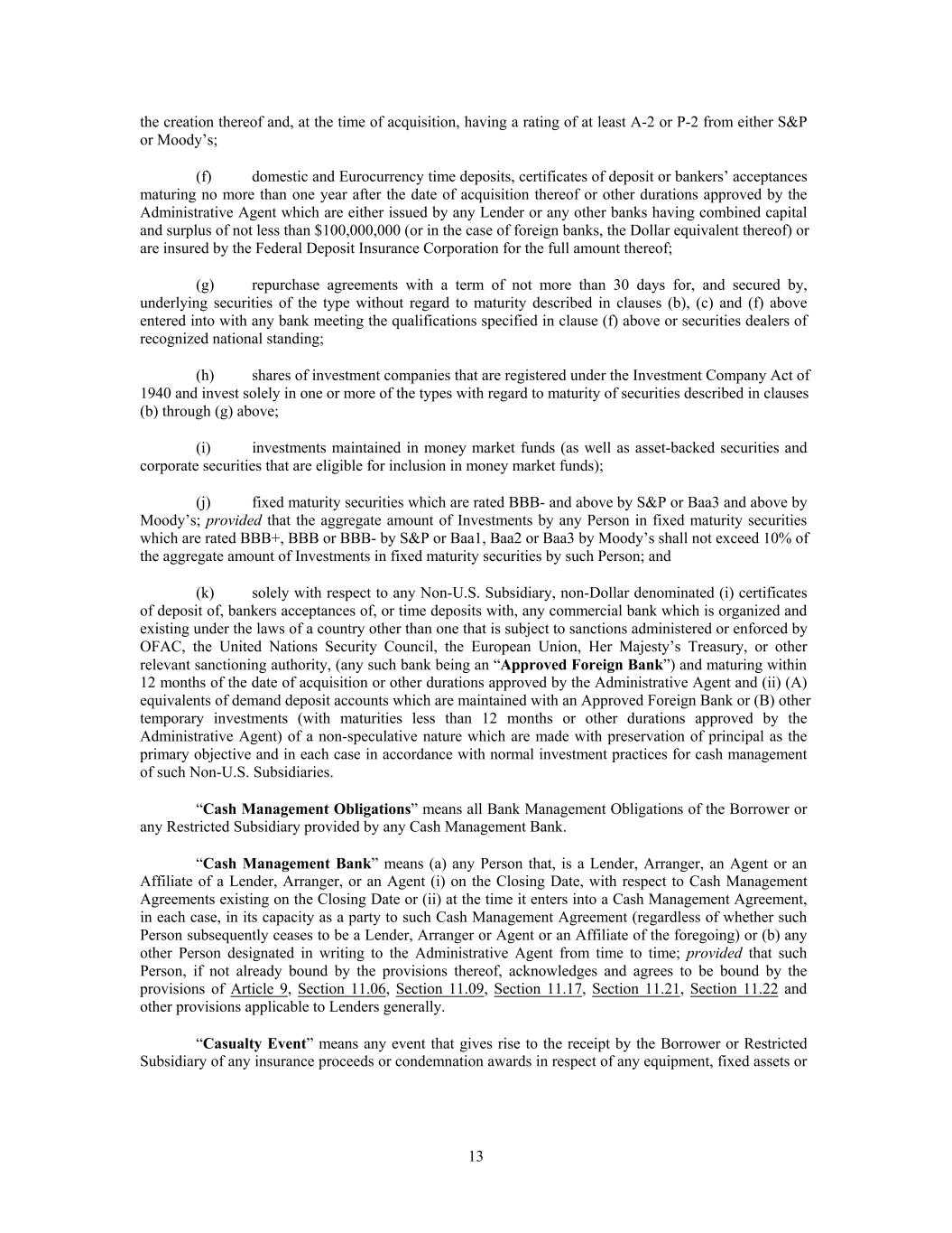 the creation thereof and, at the time of acquisition, having a rating of at least A-2 or P-2 from either S&P or Moody’s; (f) domestic and Eurocurrency time deposits, certificates of deposit or bankers’ acceptances maturing no more than one year after the date of acquisition thereof or other durations approved by the Administrative Agent which are either issued by any Lender or any other banks having combined capital and surplus of not less than $100,000,000 (or in the case of foreign banks, the Dollar equivalent thereof) or are insured by the Federal Deposit Insurance Corporation for the full amount thereof; (g) repurchase agreements with a term of not more than 30 days for, and secured by, underlying securities of the type without regard to maturity described in clauses (b), (c) and (f) above entered into with any bank meeting the qualifications specified in clause (f) above or securities dealers of recognized national standing; (h) shares of investment companies that are registered under the Investment Company Act of 1940 and invest solely in one or more of the types with regard to maturity of securities described in clauses (b) through (g) above; (i) investments maintained in money market funds (as well as asset-backed securities and corporate securities that are eligible for inclusion in money market funds); (j) fixed maturity securities which are rated BBB- and above by S&P or Baa3 and above by Moody’s; provided that the aggregate amount of Investments by any Person in fixed maturity securities which are rated BBB+, BBB or BBB- by S&P or Baa1, Baa2 or Baa3 by Moody’s shall not exceed 10% of the aggregate amount of Investments in fixed maturity securities by such Person; and (k) solely with respect to any Non-U.S. Subsidiary, non-Dollar denominated (i) certificates of deposit of, bankers acceptances of, or time deposits with, any commercial bank which is organized and existing under the laws of a country other than one that is subject to sanctions administered or enforced by OFAC, the United Nations Security Council, the European Union, Her Majesty’s Treasury, or other relevant sanctioning authority, (any such bank being an “Approved Foreign Bank”) and maturing within 12 months of the date of acquisition or other durations approved by the Administrative Agent and (ii) (A) equivalents of demand deposit accounts which are maintained with an Approved Foreign Bank or (B) other temporary investments (with maturities less than 12 months or other durations approved by the Administrative Agent) of a non-speculative nature which are made with preservation of principal as the primary objective and in each case in accordance with normal investment practices for cash management of such Non-U.S. Subsidiaries. “Cash Management Obligations” means all Bank Management Obligations of the Borrower or any Restricted Subsidiary provided by any Cash Management Bank. “Cash Management Bank” means (a) any Person that, is a Lender, Arranger, an Agent or an Affiliate of a Lender, Arranger, or an Agent (i) on the Closing Date, with respect to Cash Management Agreements existing on the Closing Date or (ii) at the time it enters into a Cash Management Agreement, in each case, in its capacity as a party to such Cash Management Agreement (regardless of whether such Person subsequently ceases to be a Lender, Arranger or Agent or an Affiliate of the foregoing) or (b) any other Person designated in writing to the Administrative Agent from time to time; provided that such Person, if not already bound by the provisions thereof, acknowledges and agrees to be bound by the provisions of Article 9, Section 11.06, Section 11.09, Section 11.17, Section 11.21, Section 11.22 and other provisions applicable to Lenders generally. “Casualty Event” means any event that gives rise to the receipt by the Borrower or Restricted Subsidiary of any insurance proceeds or condemnation awards in respect of any equipment, fixed assets or 13