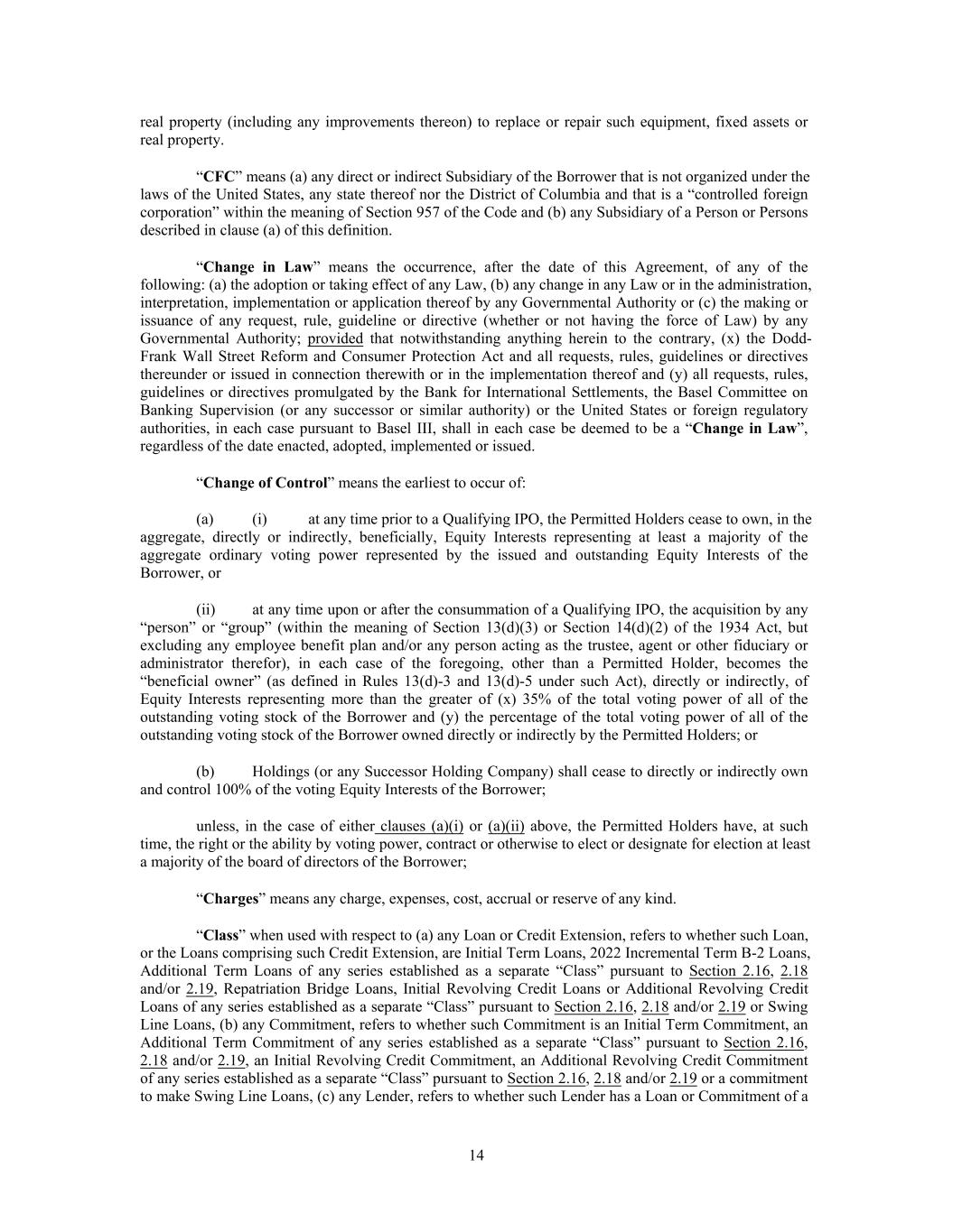 real property (including any improvements thereon) to replace or repair such equipment, fixed assets or real property. “CFC” means (a) any direct or indirect Subsidiary of the Borrower that is not organized under the laws of the United States, any state thereof nor the District of Columbia and that is a “controlled foreign corporation” within the meaning of Section 957 of the Code and (b) any Subsidiary of a Person or Persons described in clause (a) of this definition. “Change in Law” means the occurrence, after the date of this Agreement, of any of the following: (a) the adoption or taking effect of any Law, (b) any change in any Law or in the administration, interpretation, implementation or application thereof by any Governmental Authority or (c) the making or issuance of any request, rule, guideline or directive (whether or not having the force of Law) by any Governmental Authority; provided that notwithstanding anything herein to the contrary, (x) the Dodd- Frank Wall Street Reform and Consumer Protection Act and all requests, rules, guidelines or directives thereunder or issued in connection therewith or in the implementation thereof and (y) all requests, rules, guidelines or directives promulgated by the Bank for International Settlements, the Basel Committee on Banking Supervision (or any successor or similar authority) or the United States or foreign regulatory authorities, in each case pursuant to Basel III, shall in each case be deemed to be a “Change in Law”, regardless of the date enacted, adopted, implemented or issued. “Change of Control” means the earliest to occur of: (a) (i) at any time prior to a Qualifying IPO, the Permitted Holders cease to own, in the aggregate, directly or indirectly, beneficially, Equity Interests representing at least a majority of the aggregate ordinary voting power represented by the issued and outstanding Equity Interests of the Borrower, or (ii) at any time upon or after the consummation of a Qualifying IPO, the acquisition by any “person” or “group” (within the meaning of Section 13(d)(3) or Section 14(d)(2) of the 1934 Act, but excluding any employee benefit plan and/or any person acting as the trustee, agent or other fiduciary or administrator therefor), in each case of the foregoing, other than a Permitted Holder, becomes the “beneficial owner” (as defined in Rules 13(d)-3 and 13(d)-5 under such Act), directly or indirectly, of Equity Interests representing more than the greater of (x) 35% of the total voting power of all of the outstanding voting stock of the Borrower and (y) the percentage of the total voting power of all of the outstanding voting stock of the Borrower owned directly or indirectly by the Permitted Holders; or (b) Holdings (or any Successor Holding Company) shall cease to directly or indirectly own and control 100% of the voting Equity Interests of the Borrower; unless, in the case of either clauses (a)(i) or (a)(ii) above, the Permitted Holders have, at such time, the right or the ability by voting power, contract or otherwise to elect or designate for election at least a majority of the board of directors of the Borrower; “Charges” means any charge, expenses, cost, accrual or reserve of any kind. “Class” when used with respect to (a) any Loan or Credit Extension, refers to whether such Loan, or the Loans comprising such Credit Extension, are Initial Term Loans, 2022 Incremental Term B-2 Loans, Additional Term Loans of any series established as a separate “Class” pursuant to Section 2.16, 2.18 and/or 2.19, Repatriation Bridge Loans, Initial Revolving Credit Loans or Additional Revolving Credit Loans of any series established as a separate “Class” pursuant to Section 2.16, 2.18 and/or 2.19 or Swing Line Loans, (b) any Commitment, refers to whether such Commitment is an Initial Term Commitment, an Additional Term Commitment of any series established as a separate “Class” pursuant to Section 2.16, 2.18 and/or 2.19, an Initial Revolving Credit Commitment, an Additional Revolving Credit Commitment of any series established as a separate “Class” pursuant to Section 2.16, 2.18 and/or 2.19 or a commitment to make Swing Line Loans, (c) any Lender, refers to whether such Lender has a Loan or Commitment of a 14