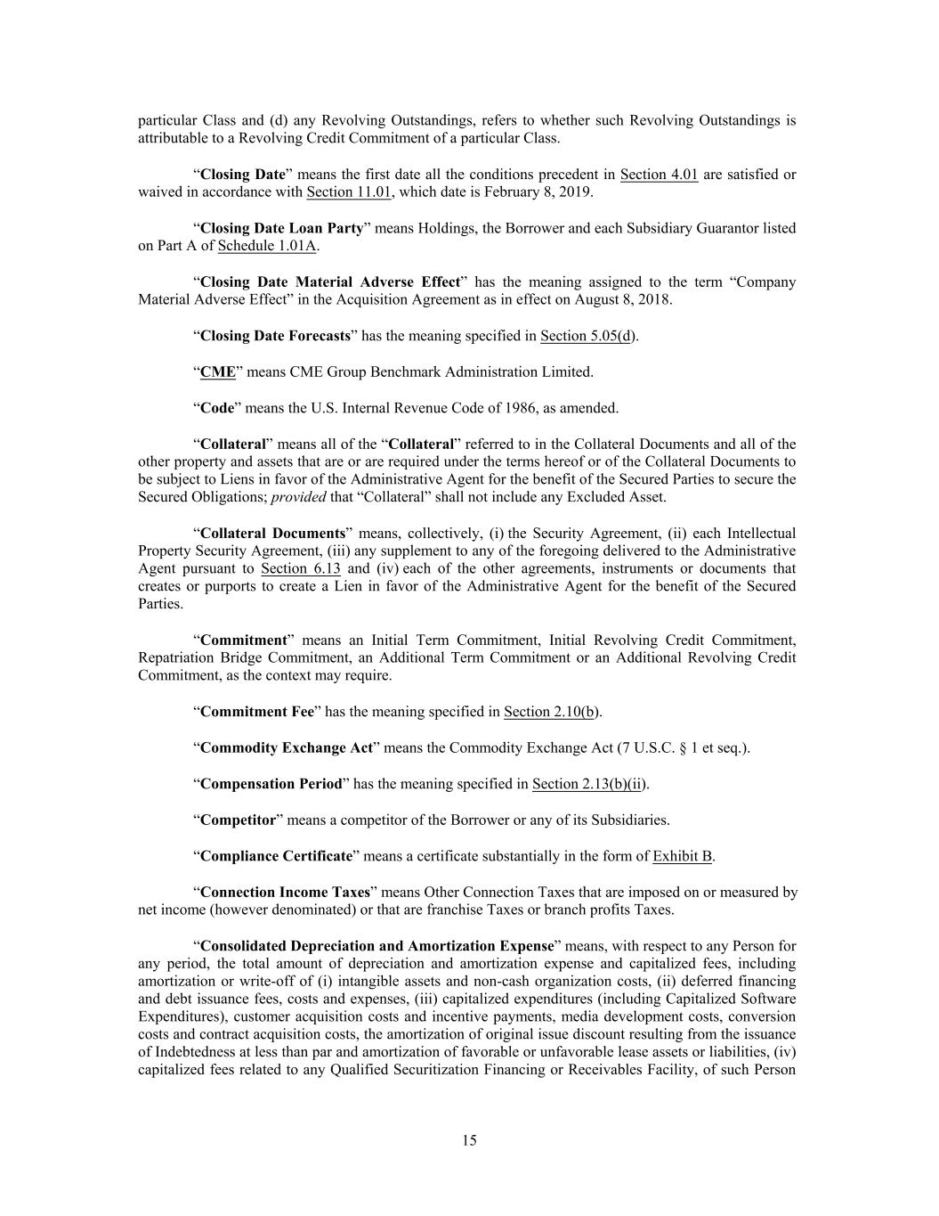 particular Class and (d) any Revolving Outstandings, refers to whether such Revolving Outstandings is attributable to a Revolving Credit Commitment of a particular Class. “Closing Date” means the first date all the conditions precedent in Section 4.01 are satisfied or waived in accordance with Section 11.01, which date is February 8, 2019. “Closing Date Loan Party” means Holdings, the Borrower and each Subsidiary Guarantor listed on Part A of Schedule 1.01A. “Closing Date Material Adverse Effect” has the meaning assigned to the term “Company Material Adverse Effect” in the Acquisition Agreement as in effect on August 8, 2018. “Closing Date Forecasts” has the meaning specified in Section 5.05(d). “CME” means CME Group Benchmark Administration Limited. “Code” means the U.S. Internal Revenue Code of 1986, as amended. “Collateral” means all of the “Collateral” referred to in the Collateral Documents and all of the other property and assets that are or are required under the terms hereof or of the Collateral Documents to be subject to Liens in favor of the Administrative Agent for the benefit of the Secured Parties to secure the Secured Obligations; provided that “Collateral” shall not include any Excluded Asset. “Collateral Documents” means, collectively, (i) the Security Agreement, (ii) each Intellectual Property Security Agreement, (iii) any supplement to any of the foregoing delivered to the Administrative Agent pursuant to Section 6.13 and (iv) each of the other agreements, instruments or documents that creates or purports to create a Lien in favor of the Administrative Agent for the benefit of the Secured Parties. “Commitment” means an Initial Term Commitment, Initial Revolving Credit Commitment, Repatriation Bridge Commitment, an Additional Term Commitment or an Additional Revolving Credit Commitment, as the context may require. “Commitment Fee” has the meaning specified in Section 2.10(b). “Commodity Exchange Act” means the Commodity Exchange Act (7 U.S.C. § 1 et seq.). “Compensation Period” has the meaning specified in Section 2.13(b)(ii). “Competitor” means a competitor of the Borrower or any of its Subsidiaries. “Compliance Certificate” means a certificate substantially in the form of Exhibit B. “Connection Income Taxes” means Other Connection Taxes that are imposed on or measured by net income (however denominated) or that are franchise Taxes or branch profits Taxes. “Consolidated Depreciation and Amortization Expense” means, with respect to any Person for any period, the total amount of depreciation and amortization expense and capitalized fees, including amortization or write-off of (i) intangible assets and non-cash organization costs, (ii) deferred financing and debt issuance fees, costs and expenses, (iii) capitalized expenditures (including Capitalized Software Expenditures), customer acquisition costs and incentive payments, media development costs, conversion costs and contract acquisition costs, the amortization of original issue discount resulting from the issuance of Indebtedness at less than par and amortization of favorable or unfavorable lease assets or liabilities, (iv) capitalized fees related to any Qualified Securitization Financing or Receivables Facility, of such Person 15