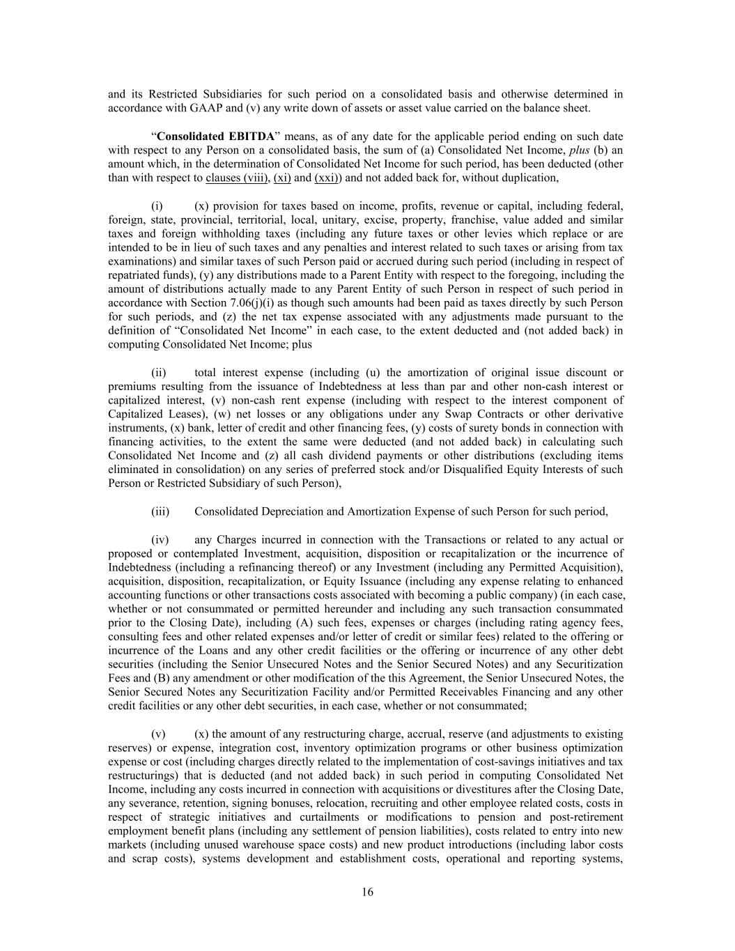and its Restricted Subsidiaries for such period on a consolidated basis and otherwise determined in accordance with GAAP and (v) any write down of assets or asset value carried on the balance sheet. “Consolidated EBITDA” means, as of any date for the applicable period ending on such date with respect to any Person on a consolidated basis, the sum of (a) Consolidated Net Income, plus (b) an amount which, in the determination of Consolidated Net Income for such period, has been deducted (other than with respect to clauses (viii), (xi) and (xxi)) and not added back for, without duplication, (i) (x) provision for taxes based on income, profits, revenue or capital, including federal, foreign, state, provincial, territorial, local, unitary, excise, property, franchise, value added and similar taxes and foreign withholding taxes (including any future taxes or other levies which replace or are intended to be in lieu of such taxes and any penalties and interest related to such taxes or arising from tax examinations) and similar taxes of such Person paid or accrued during such period (including in respect of repatriated funds), (y) any distributions made to a Parent Entity with respect to the foregoing, including the amount of distributions actually made to any Parent Entity of such Person in respect of such period in accordance with Section 7.06(j)(i) as though such amounts had been paid as taxes directly by such Person for such periods, and (z) the net tax expense associated with any adjustments made pursuant to the definition of “Consolidated Net Income” in each case, to the extent deducted and (not added back) in computing Consolidated Net Income; plus (ii) total interest expense (including (u) the amortization of original issue discount or premiums resulting from the issuance of Indebtedness at less than par and other non-cash interest or capitalized interest, (v) non-cash rent expense (including with respect to the interest component of Capitalized Leases), (w) net losses or any obligations under any Swap Contracts or other derivative instruments, (x) bank, letter of credit and other financing fees, (y) costs of surety bonds in connection with financing activities, to the extent the same were deducted (and not added back) in calculating such Consolidated Net Income and (z) all cash dividend payments or other distributions (excluding items eliminated in consolidation) on any series of preferred stock and/or Disqualified Equity Interests of such Person or Restricted Subsidiary of such Person), (iii) Consolidated Depreciation and Amortization Expense of such Person for such period, (iv) any Charges incurred in connection with the Transactions or related to any actual or proposed or contemplated Investment, acquisition, disposition or recapitalization or the incurrence of Indebtedness (including a refinancing thereof) or any Investment (including any Permitted Acquisition), acquisition, disposition, recapitalization, or Equity Issuance (including any expense relating to enhanced accounting functions or other transactions costs associated with becoming a public company) (in each case, whether or not consummated or permitted hereunder and including any such transaction consummated prior to the Closing Date), including (A) such fees, expenses or charges (including rating agency fees, consulting fees and other related expenses and/or letter of credit or similar fees) related to the offering or incurrence of the Loans and any other credit facilities or the offering or incurrence of any other debt securities (including the Senior Unsecured Notes and the Senior Secured Notes) and any Securitization Fees and (B) any amendment or other modification of the this Agreement, the Senior Unsecured Notes, the Senior Secured Notes any Securitization Facility and/or Permitted Receivables Financing and any other credit facilities or any other debt securities, in each case, whether or not consummated; (v) (x) the amount of any restructuring charge, accrual, reserve (and adjustments to existing reserves) or expense, integration cost, inventory optimization programs or other business optimization expense or cost (including charges directly related to the implementation of cost-savings initiatives and tax restructurings) that is deducted (and not added back) in such period in computing Consolidated Net Income, including any costs incurred in connection with acquisitions or divestitures after the Closing Date, any severance, retention, signing bonuses, relocation, recruiting and other employee related costs, costs in respect of strategic initiatives and curtailments or modifications to pension and post-retirement employment benefit plans (including any settlement of pension liabilities), costs related to entry into new markets (including unused warehouse space costs) and new product introductions (including labor costs and scrap costs), systems development and establishment costs, operational and reporting systems, 16