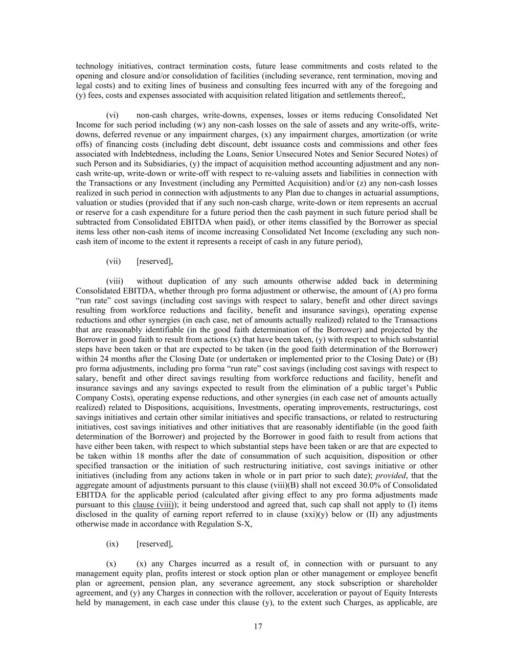 technology initiatives, contract termination costs, future lease commitments and costs related to the opening and closure and/or consolidation of facilities (including severance, rent termination, moving and legal costs) and to exiting lines of business and consulting fees incurred with any of the foregoing and (y) fees, costs and expenses associated with acquisition related litigation and settlements thereof;, (vi) non-cash charges, write-downs, expenses, losses or items reducing Consolidated Net Income for such period including (w) any non-cash losses on the sale of assets and any write-offs, write- downs, deferred revenue or any impairment charges, (x) any impairment charges, amortization (or write offs) of financing costs (including debt discount, debt issuance costs and commissions and other fees associated with Indebtedness, including the Loans, Senior Unsecured Notes and Senior Secured Notes) of such Person and its Subsidiaries, (y) the impact of acquisition method accounting adjustment and any non- cash write-up, write-down or write-off with respect to re-valuing assets and liabilities in connection with the Transactions or any Investment (including any Permitted Acquisition) and/or (z) any non-cash losses realized in such period in connection with adjustments to any Plan due to changes in actuarial assumptions, valuation or studies (provided that if any such non-cash charge, write-down or item represents an accrual or reserve for a cash expenditure for a future period then the cash payment in such future period shall be subtracted from Consolidated EBITDA when paid), or other items classified by the Borrower as special items less other non-cash items of income increasing Consolidated Net Income (excluding any such non- cash item of income to the extent it represents a receipt of cash in any future period), (vii) [reserved], (viii) without duplication of any such amounts otherwise added back in determining Consolidated EBITDA, whether through pro forma adjustment or otherwise, the amount of (A) pro forma “run rate” cost savings (including cost savings with respect to salary, benefit and other direct savings resulting from workforce reductions and facility, benefit and insurance savings), operating expense reductions and other synergies (in each case, net of amounts actually realized) related to the Transactions that are reasonably identifiable (in the good faith determination of the Borrower) and projected by the Borrower in good faith to result from actions (x) that have been taken, (y) with respect to which substantial steps have been taken or that are expected to be taken (in the good faith determination of the Borrower) within 24 months after the Closing Date (or undertaken or implemented prior to the Closing Date) or (B) pro forma adjustments, including pro forma “run rate” cost savings (including cost savings with respect to salary, benefit and other direct savings resulting from workforce reductions and facility, benefit and insurance savings and any savings expected to result from the elimination of a public target’s Public Company Costs), operating expense reductions, and other synergies (in each case net of amounts actually realized) related to Dispositions, acquisitions, Investments, operating improvements, restructurings, cost savings initiatives and certain other similar initiatives and specific transactions, or related to restructuring initiatives, cost savings initiatives and other initiatives that are reasonably identifiable (in the good faith determination of the Borrower) and projected by the Borrower in good faith to result from actions that have either been taken, with respect to which substantial steps have been taken or are that are expected to be taken within 18 months after the date of consummation of such acquisition, disposition or other specified transaction or the initiation of such restructuring initiative, cost savings initiative or other initiatives (including from any actions taken in whole or in part prior to such date); provided, that the aggregate amount of adjustments pursuant to this clause (viii)(B) shall not exceed 30.0% of Consolidated EBITDA for the applicable period (calculated after giving effect to any pro forma adjustments made pursuant to this clause (viii)); it being understood and agreed that, such cap shall not apply to (I) items disclosed in the quality of earning report referred to in clause (xxi)(y) below or (II) any adjustments otherwise made in accordance with Regulation S-X, (ix) [reserved], (x) (x) any Charges incurred as a result of, in connection with or pursuant to any management equity plan, profits interest or stock option plan or other management or employee benefit plan or agreement, pension plan, any severance agreement, any stock subscription or shareholder agreement, and (y) any Charges in connection with the rollover, acceleration or payout of Equity Interests held by management, in each case under this clause (y), to the extent such Charges, as applicable, are 17
