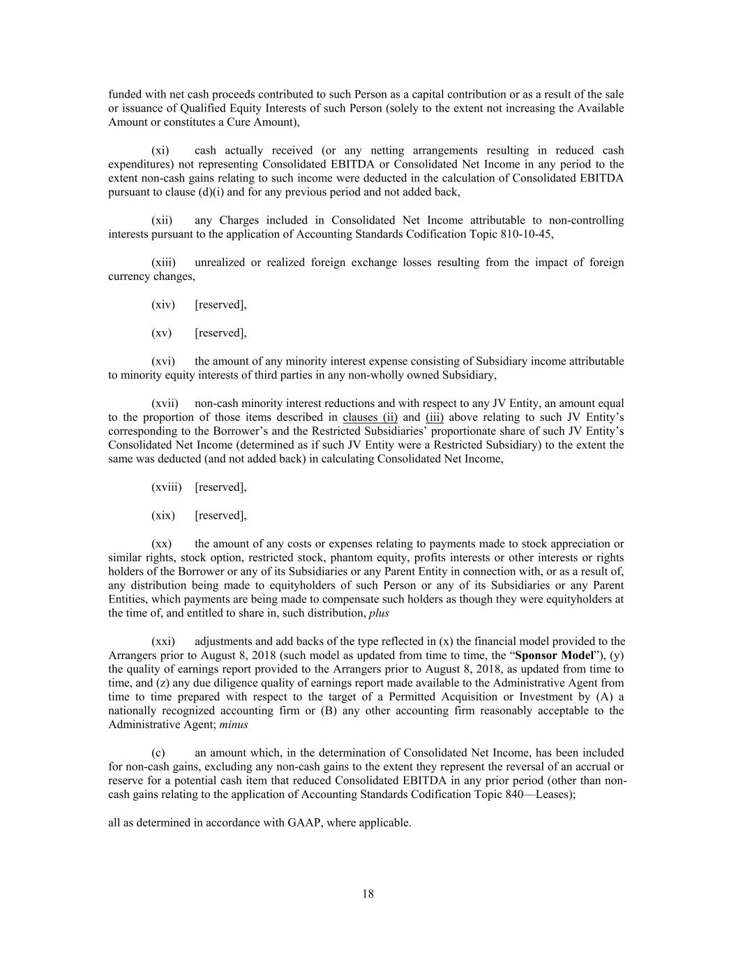 funded with net cash proceeds contributed to such Person as a capital contribution or as a result of the sale or issuance of Qualified Equity Interests of such Person (solely to the extent not increasing the Available Amount or constitutes a Cure Amount), (xi) cash actually received (or any netting arrangements resulting in reduced cash expenditures) not representing Consolidated EBITDA or Consolidated Net Income in any period to the extent non-cash gains relating to such income were deducted in the calculation of Consolidated EBITDA pursuant to clause (d)(i) and for any previous period and not added back, (xii) any Charges included in Consolidated Net Income attributable to non-controlling interests pursuant to the application of Accounting Standards Codification Topic 810-10-45, (xiii) unrealized or realized foreign exchange losses resulting from the impact of foreign currency changes, (xiv) [reserved], (xv) [reserved], (xvi) the amount of any minority interest expense consisting of Subsidiary income attributable to minority equity interests of third parties in any non-wholly owned Subsidiary, (xvii) non-cash minority interest reductions and with respect to any JV Entity, an amount equal to the proportion of those items described in clauses (ii) and (iii) above relating to such JV Entity’s corresponding to the Borrower’s and the Restricted Subsidiaries’ proportionate share of such JV Entity’s Consolidated Net Income (determined as if such JV Entity were a Restricted Subsidiary) to the extent the same was deducted (and not added back) in calculating Consolidated Net Income, (xviii) [reserved], (xix) [reserved], (xx) the amount of any costs or expenses relating to payments made to stock appreciation or similar rights, stock option, restricted stock, phantom equity, profits interests or other interests or rights holders of the Borrower or any of its Subsidiaries or any Parent Entity in connection with, or as a result of, any distribution being made to equityholders of such Person or any of its Subsidiaries or any Parent Entities, which payments are being made to compensate such holders as though they were equityholders at the time of, and entitled to share in, such distribution, plus (xxi) adjustments and add backs of the type reflected in (x) the financial model provided to the Arrangers prior to August 8, 2018 (such model as updated from time to time, the “Sponsor Model”), (y) the quality of earnings report provided to the Arrangers prior to August 8, 2018, as updated from time to time, and (z) any due diligence quality of earnings report made available to the Administrative Agent from time to time prepared with respect to the target of a Permitted Acquisition or Investment by (A) a nationally recognized accounting firm or (B) any other accounting firm reasonably acceptable to the Administrative Agent; minus (c) an amount which, in the determination of Consolidated Net Income, has been included for non-cash gains, excluding any non-cash gains to the extent they represent the reversal of an accrual or reserve for a potential cash item that reduced Consolidated EBITDA in any prior period (other than non- cash gains relating to the application of Accounting Standards Codification Topic 840—Leases); all as determined in accordance with GAAP, where applicable. 18