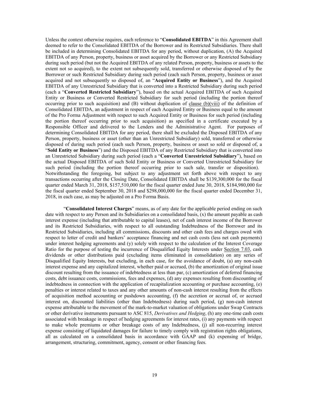 Unless the context otherwise requires, each reference to “Consolidated EBITDA” in this Agreement shall deemed to refer to the Consolidated EBITDA of the Borrower and its Restricted Subsidiaries. There shall be included in determining Consolidated EBITDA for any period, without duplication, (A) the Acquired EBITDA of any Person, property, business or asset acquired by the Borrower or any Restricted Subsidiary during such period (but not the Acquired EBITDA of any related Person, property, business or assets to the extent not so acquired), to the extent not subsequently sold, transferred or otherwise disposed of by the Borrower or such Restricted Subsidiary during such period (each such Person, property, business or asset acquired and not subsequently so disposed of, an “Acquired Entity or Business”), and the Acquired EBITDA of any Unrestricted Subsidiary that is converted into a Restricted Subsidiary during such period (each a “Converted Restricted Subsidiary”), based on the actual Acquired EBITDA of such Acquired Entity or Business or Converted Restricted Subsidiary for such period (including the portion thereof occurring prior to such acquisition) and (B) without duplication of clause (b)(viii) of the definition of Consolidated EBITDA, an adjustment in respect of each Acquired Entity or Business equal to the amount of the Pro Forma Adjustment with respect to such Acquired Entity or Business for such period (including the portion thereof occurring prior to such acquisition) as specified in a certificate executed by a Responsible Officer and delivered to the Lenders and the Administrative Agent. For purposes of determining Consolidated EBITDA for any period, there shall be excluded the Disposed EBITDA of any Person, property, business or asset (other than an Unrestricted Subsidiary) sold, transferred or otherwise disposed of during such period (each such Person, property, business or asset so sold or disposed of, a “Sold Entity or Business”) and the Disposed EBITDA of any Restricted Subsidiary that is converted into an Unrestricted Subsidiary during such period (each a “Converted Unrestricted Subsidiary”), based on the actual Disposed EBITDA of such Sold Entity or Business or Converted Unrestricted Subsidiary for such period (including the portion thereof occurring prior to such sale, transfer or disposition). Notwithstanding the foregoing, but subject to any adjustment set forth above with respect to any transactions occurring after the Closing Date, Consolidated EBITDA shall be $139,300,000 for the fiscal quarter ended March 31, 2018, $157,510,000 for the fiscal quarter ended June 30, 2018, $184,980,000 for the fiscal quarter ended September 30, 2018 and $298,000,000 for the fiscal quarter ended December 31, 2018, in each case, as may be adjusted on a Pro Forma Basis. “Consolidated Interest Charges” means, as of any date for the applicable period ending on such date with respect to any Person and its Subsidiaries on a consolidated basis, (x) the amount payable as cash interest expense (including that attributable to capital leases), net of cash interest income of the Borrower and its Restricted Subsidiaries, with respect to all outstanding Indebtedness of the Borrower and its Restricted Subsidiaries, including all commissions, discounts and other cash fees and charges owed with respect to letter of credit and bankers’ acceptance financing and net cash costs (less net cash payments) under interest hedging agreements and (y) solely with respect to the calculation of the Interest Coverage Ratio for the purpose of testing the incurrence of Disqualified Equity Interests under Section 7.03, cash dividends or other distributions paid (excluding items eliminated in consolidation) on any series of Disqualified Equity Interests, but excluding, in each case, for the avoidance of doubt, (a) any non-cash interest expense and any capitalized interest, whether paid or accrued, (b) the amortization of original issue discount resulting from the issuance of indebtedness at less than par, (c) amortization of deferred financing costs, debt issuance costs, commissions, fees and expenses, (d) any expenses resulting from discounting of indebtedness in connection with the application of recapitalization accounting or purchase accounting, (e) penalties or interest related to taxes and any other amounts of non-cash interest resulting from the effects of acquisition method accounting or pushdown accounting, (f) the accretion or accrual of, or accrued interest on, discounted liabilities (other than Indebtedness) during such period, (g) non-cash interest expense attributable to the movement of the mark-to-market valuation of obligations under Swap Contracts or other derivative instruments pursuant to ASC 815, Derivatives and Hedging, (h) any one-time cash costs associated with breakage in respect of hedging agreements for interest rates, (i) any payments with respect to make whole premiums or other breakage costs of any Indebtedness, (j) all non-recurring interest expense consisting of liquidated damages for failure to timely comply with registration rights obligations, all as calculated on a consolidated basis in accordance with GAAP and (k) expensing of bridge, arrangement, structuring, commitment, agency, consent or other financing fees. 19