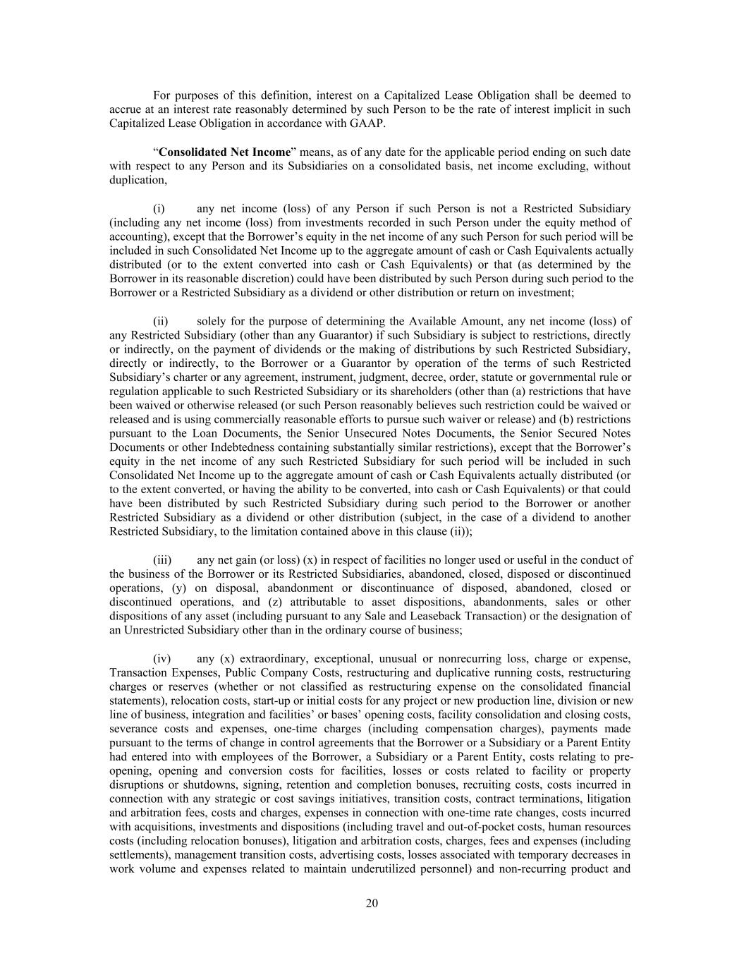 For purposes of this definition, interest on a Capitalized Lease Obligation shall be deemed to accrue at an interest rate reasonably determined by such Person to be the rate of interest implicit in such Capitalized Lease Obligation in accordance with GAAP. “Consolidated Net Income” means, as of any date for the applicable period ending on such date with respect to any Person and its Subsidiaries on a consolidated basis, net income excluding, without duplication, (i) any net income (loss) of any Person if such Person is not a Restricted Subsidiary (including any net income (loss) from investments recorded in such Person under the equity method of accounting), except that the Borrower’s equity in the net income of any such Person for such period will be included in such Consolidated Net Income up to the aggregate amount of cash or Cash Equivalents actually distributed (or to the extent converted into cash or Cash Equivalents) or that (as determined by the Borrower in its reasonable discretion) could have been distributed by such Person during such period to the Borrower or a Restricted Subsidiary as a dividend or other distribution or return on investment; (ii) solely for the purpose of determining the Available Amount, any net income (loss) of any Restricted Subsidiary (other than any Guarantor) if such Subsidiary is subject to restrictions, directly or indirectly, on the payment of dividends or the making of distributions by such Restricted Subsidiary, directly or indirectly, to the Borrower or a Guarantor by operation of the terms of such Restricted Subsidiary’s charter or any agreement, instrument, judgment, decree, order, statute or governmental rule or regulation applicable to such Restricted Subsidiary or its shareholders (other than (a) restrictions that have been waived or otherwise released (or such Person reasonably believes such restriction could be waived or released and is using commercially reasonable efforts to pursue such waiver or release) and (b) restrictions pursuant to the Loan Documents, the Senior Unsecured Notes Documents, the Senior Secured Notes Documents or other Indebtedness containing substantially similar restrictions), except that the Borrower’s equity in the net income of any such Restricted Subsidiary for such period will be included in such Consolidated Net Income up to the aggregate amount of cash or Cash Equivalents actually distributed (or to the extent converted, or having the ability to be converted, into cash or Cash Equivalents) or that could have been distributed by such Restricted Subsidiary during such period to the Borrower or another Restricted Subsidiary as a dividend or other distribution (subject, in the case of a dividend to another Restricted Subsidiary, to the limitation contained above in this clause (ii)); (iii) any net gain (or loss) (x) in respect of facilities no longer used or useful in the conduct of the business of the Borrower or its Restricted Subsidiaries, abandoned, closed, disposed or discontinued operations, (y) on disposal, abandonment or discontinuance of disposed, abandoned, closed or discontinued operations, and (z) attributable to asset dispositions, abandonments, sales or other dispositions of any asset (including pursuant to any Sale and Leaseback Transaction) or the designation of an Unrestricted Subsidiary other than in the ordinary course of business; (iv) any (x) extraordinary, exceptional, unusual or nonrecurring loss, charge or expense, Transaction Expenses, Public Company Costs, restructuring and duplicative running costs, restructuring charges or reserves (whether or not classified as restructuring expense on the consolidated financial statements), relocation costs, start-up or initial costs for any project or new production line, division or new line of business, integration and facilities’ or bases’ opening costs, facility consolidation and closing costs, severance costs and expenses, one-time charges (including compensation charges), payments made pursuant to the terms of change in control agreements that the Borrower or a Subsidiary or a Parent Entity had entered into with employees of the Borrower, a Subsidiary or a Parent Entity, costs relating to pre- opening, opening and conversion costs for facilities, losses or costs related to facility or property disruptions or shutdowns, signing, retention and completion bonuses, recruiting costs, costs incurred in connection with any strategic or cost savings initiatives, transition costs, contract terminations, litigation and arbitration fees, costs and charges, expenses in connection with one-time rate changes, costs incurred with acquisitions, investments and dispositions (including travel and out-of-pocket costs, human resources costs (including relocation bonuses), litigation and arbitration costs, charges, fees and expenses (including settlements), management transition costs, advertising costs, losses associated with temporary decreases in work volume and expenses related to maintain underutilized personnel) and non-recurring product and 20