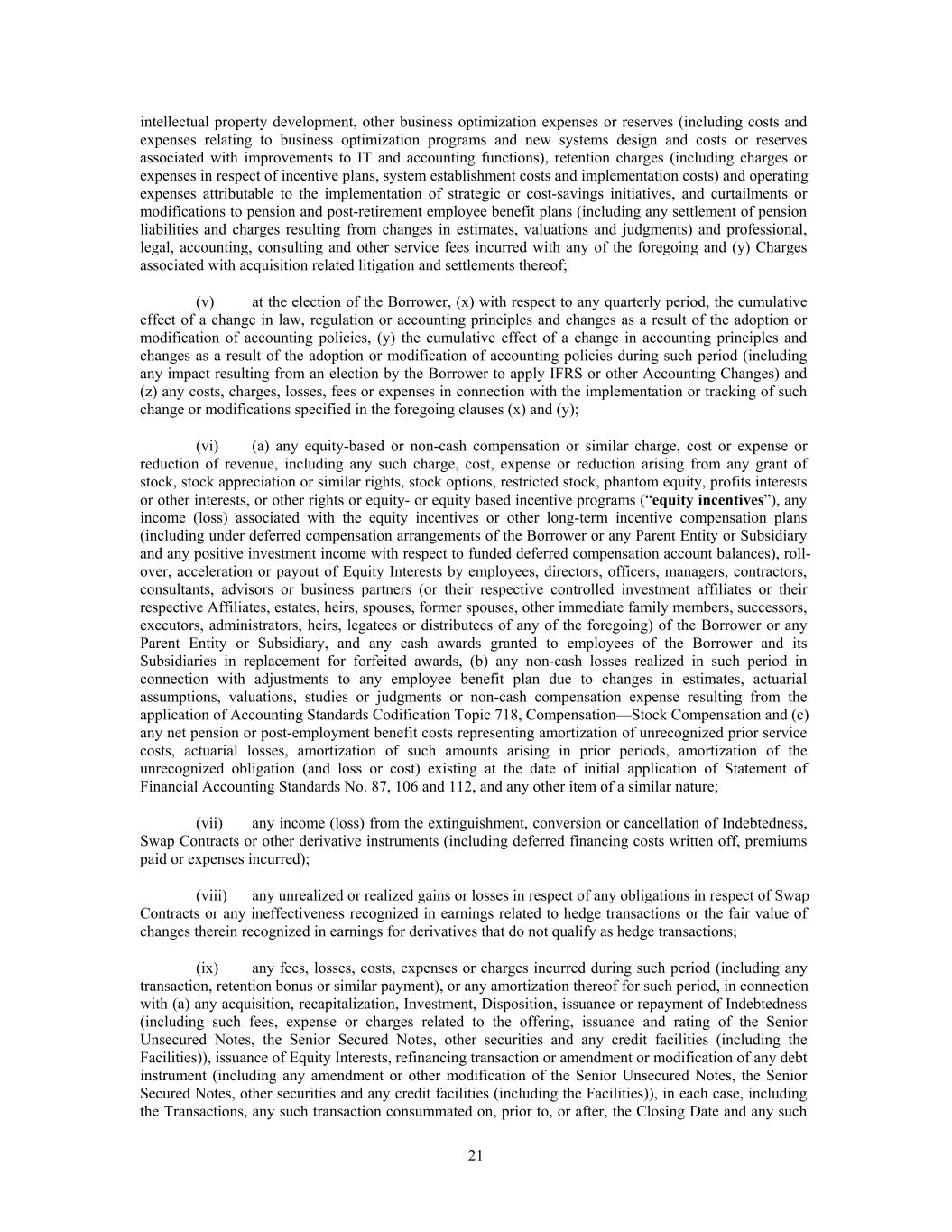 intellectual property development, other business optimization expenses or reserves (including costs and expenses relating to business optimization programs and new systems design and costs or reserves associated with improvements to IT and accounting functions), retention charges (including charges or expenses in respect of incentive plans, system establishment costs and implementation costs) and operating expenses attributable to the implementation of strategic or cost-savings initiatives, and curtailments or modifications to pension and post-retirement employee benefit plans (including any settlement of pension liabilities and charges resulting from changes in estimates, valuations and judgments) and professional, legal, accounting, consulting and other service fees incurred with any of the foregoing and (y) Charges associated with acquisition related litigation and settlements thereof; (v) at the election of the Borrower, (x) with respect to any quarterly period, the cumulative effect of a change in law, regulation or accounting principles and changes as a result of the adoption or modification of accounting policies, (y) the cumulative effect of a change in accounting principles and changes as a result of the adoption or modification of accounting policies during such period (including any impact resulting from an election by the Borrower to apply IFRS or other Accounting Changes) and (z) any costs, charges, losses, fees or expenses in connection with the implementation or tracking of such change or modifications specified in the foregoing clauses (x) and (y); (vi) (a) any equity-based or non-cash compensation or similar charge, cost or expense or reduction of revenue, including any such charge, cost, expense or reduction arising from any grant of stock, stock appreciation or similar rights, stock options, restricted stock, phantom equity, profits interests or other interests, or other rights or equity- or equity based incentive programs (“equity incentives”), any income (loss) associated with the equity incentives or other long-term incentive compensation plans (including under deferred compensation arrangements of the Borrower or any Parent Entity or Subsidiary and any positive investment income with respect to funded deferred compensation account balances), roll- over, acceleration or payout of Equity Interests by employees, directors, officers, managers, contractors, consultants, advisors or business partners (or their respective controlled investment affiliates or their respective Affiliates, estates, heirs, spouses, former spouses, other immediate family members, successors, executors, administrators, heirs, legatees or distributees of any of the foregoing) of the Borrower or any Parent Entity or Subsidiary, and any cash awards granted to employees of the Borrower and its Subsidiaries in replacement for forfeited awards, (b) any non-cash losses realized in such period in connection with adjustments to any employee benefit plan due to changes in estimates, actuarial assumptions, valuations, studies or judgments or non-cash compensation expense resulting from the application of Accounting Standards Codification Topic 718, Compensation—Stock Compensation and (c) any net pension or post-employment benefit costs representing amortization of unrecognized prior service costs, actuarial losses, amortization of such amounts arising in prior periods, amortization of the unrecognized obligation (and loss or cost) existing at the date of initial application of Statement of Financial Accounting Standards No. 87, 106 and 112, and any other item of a similar nature; (vii) any income (loss) from the extinguishment, conversion or cancellation of Indebtedness, Swap Contracts or other derivative instruments (including deferred financing costs written off, premiums paid or expenses incurred); (viii) any unrealized or realized gains or losses in respect of any obligations in respect of Swap Contracts or any ineffectiveness recognized in earnings related to hedge transactions or the fair value of changes therein recognized in earnings for derivatives that do not qualify as hedge transactions; (ix) any fees, losses, costs, expenses or charges incurred during such period (including any transaction, retention bonus or similar payment), or any amortization thereof for such period, in connection with (a) any acquisition, recapitalization, Investment, Disposition, issuance or repayment of Indebtedness (including such fees, expense or charges related to the offering, issuance and rating of the Senior Unsecured Notes, the Senior Secured Notes, other securities and any credit facilities (including the Facilities)), issuance of Equity Interests, refinancing transaction or amendment or modification of any debt instrument (including any amendment or other modification of the Senior Unsecured Notes, the Senior Secured Notes, other securities and any credit facilities (including the Facilities)), in each case, including the Transactions, any such transaction consummated on, prior to, or after, the Closing Date and any such 21