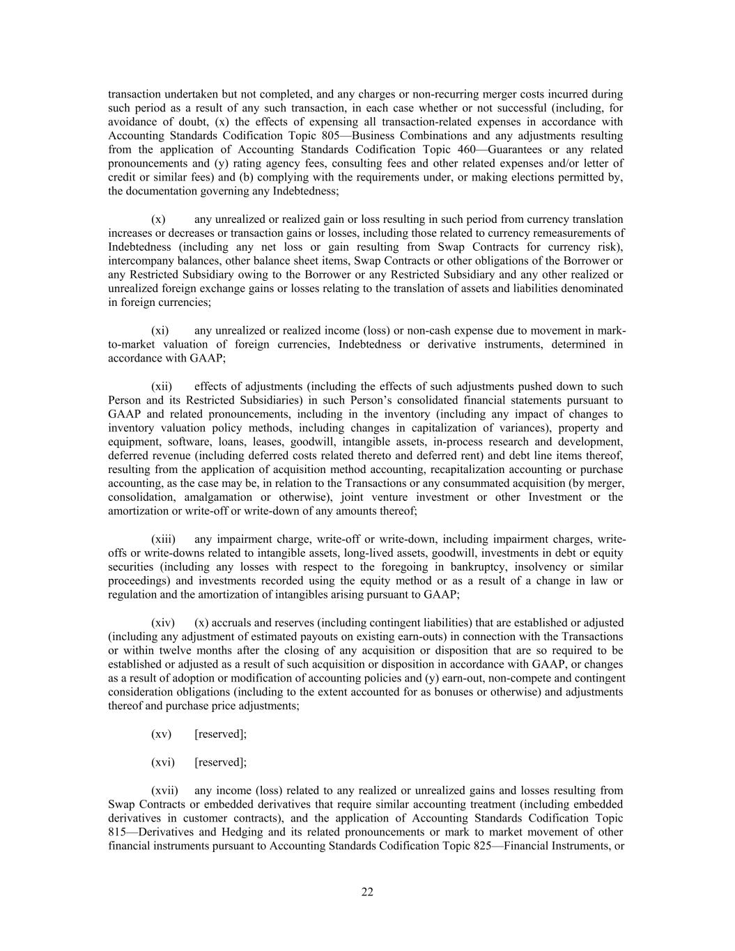 transaction undertaken but not completed, and any charges or non-recurring merger costs incurred during such period as a result of any such transaction, in each case whether or not successful (including, for avoidance of doubt, (x) the effects of expensing all transaction-related expenses in accordance with Accounting Standards Codification Topic 805—Business Combinations and any adjustments resulting from the application of Accounting Standards Codification Topic 460—Guarantees or any related pronouncements and (y) rating agency fees, consulting fees and other related expenses and/or letter of credit or similar fees) and (b) complying with the requirements under, or making elections permitted by, the documentation governing any Indebtedness; (x) any unrealized or realized gain or loss resulting in such period from currency translation increases or decreases or transaction gains or losses, including those related to currency remeasurements of Indebtedness (including any net loss or gain resulting from Swap Contracts for currency risk), intercompany balances, other balance sheet items, Swap Contracts or other obligations of the Borrower or any Restricted Subsidiary owing to the Borrower or any Restricted Subsidiary and any other realized or unrealized foreign exchange gains or losses relating to the translation of assets and liabilities denominated in foreign currencies; (xi) any unrealized or realized income (loss) or non-cash expense due to movement in mark- to-market valuation of foreign currencies, Indebtedness or derivative instruments, determined in accordance with GAAP; (xii) effects of adjustments (including the effects of such adjustments pushed down to such Person and its Restricted Subsidiaries) in such Person’s consolidated financial statements pursuant to GAAP and related pronouncements, including in the inventory (including any impact of changes to inventory valuation policy methods, including changes in capitalization of variances), property and equipment, software, loans, leases, goodwill, intangible assets, in-process research and development, deferred revenue (including deferred costs related thereto and deferred rent) and debt line items thereof, resulting from the application of acquisition method accounting, recapitalization accounting or purchase accounting, as the case may be, in relation to the Transactions or any consummated acquisition (by merger, consolidation, amalgamation or otherwise), joint venture investment or other Investment or the amortization or write-off or write-down of any amounts thereof; (xiii) any impairment charge, write-off or write-down, including impairment charges, write- offs or write-downs related to intangible assets, long-lived assets, goodwill, investments in debt or equity securities (including any losses with respect to the foregoing in bankruptcy, insolvency or similar proceedings) and investments recorded using the equity method or as a result of a change in law or regulation and the amortization of intangibles arising pursuant to GAAP; (xiv) (x) accruals and reserves (including contingent liabilities) that are established or adjusted (including any adjustment of estimated payouts on existing earn-outs) in connection with the Transactions or within twelve months after the closing of any acquisition or disposition that are so required to be established or adjusted as a result of such acquisition or disposition in accordance with GAAP, or changes as a result of adoption or modification of accounting policies and (y) earn-out, non-compete and contingent consideration obligations (including to the extent accounted for as bonuses or otherwise) and adjustments thereof and purchase price adjustments; (xv) [reserved]; (xvi) [reserved]; (xvii) any income (loss) related to any realized or unrealized gains and losses resulting from Swap Contracts or embedded derivatives that require similar accounting treatment (including embedded derivatives in customer contracts), and the application of Accounting Standards Codification Topic 815—Derivatives and Hedging and its related pronouncements or mark to market movement of other financial instruments pursuant to Accounting Standards Codification Topic 825—Financial Instruments, or 22